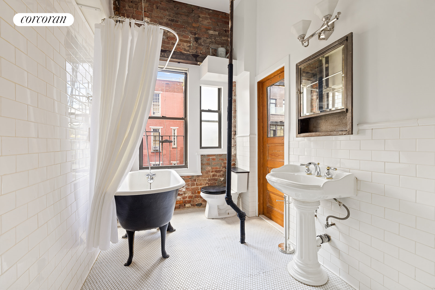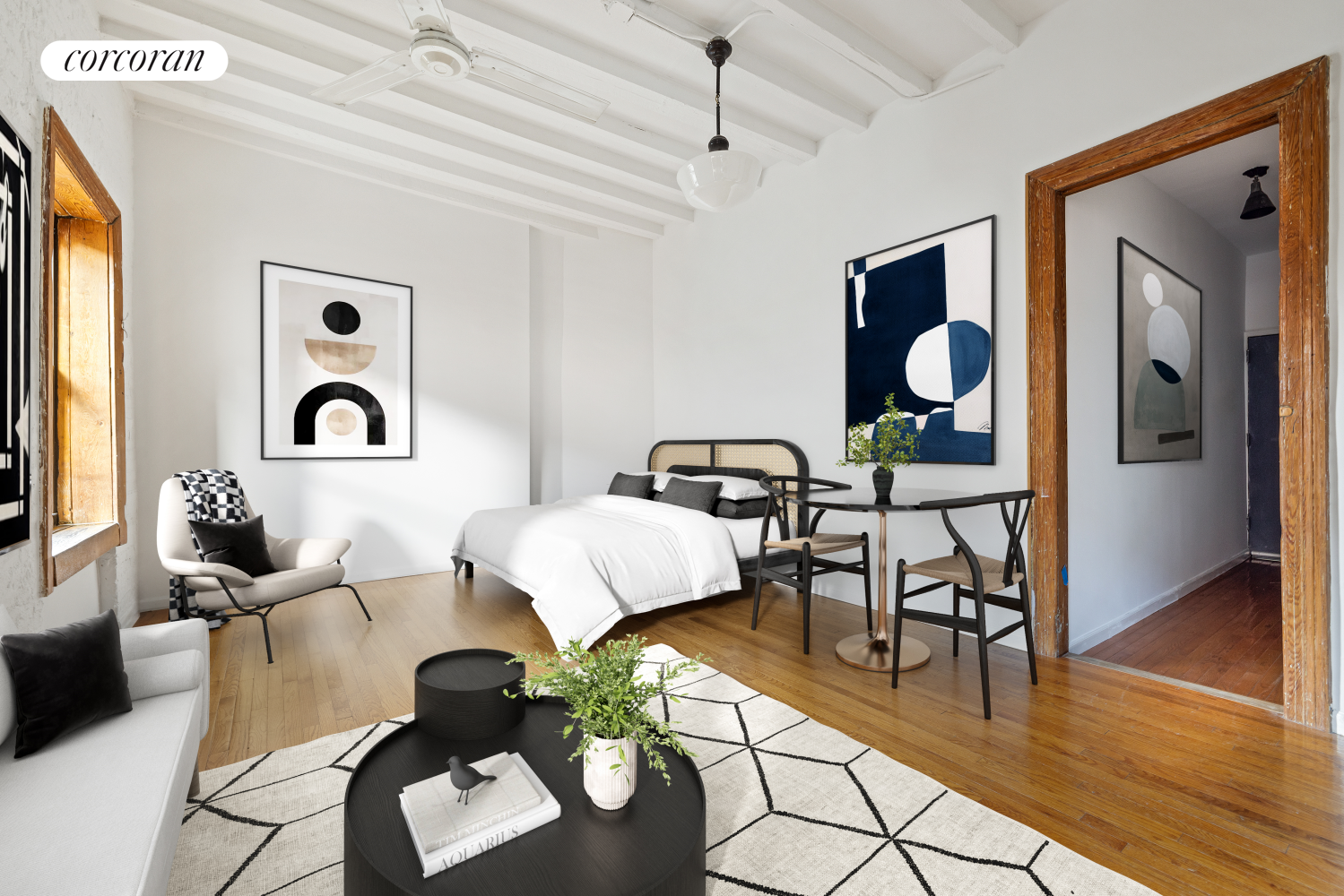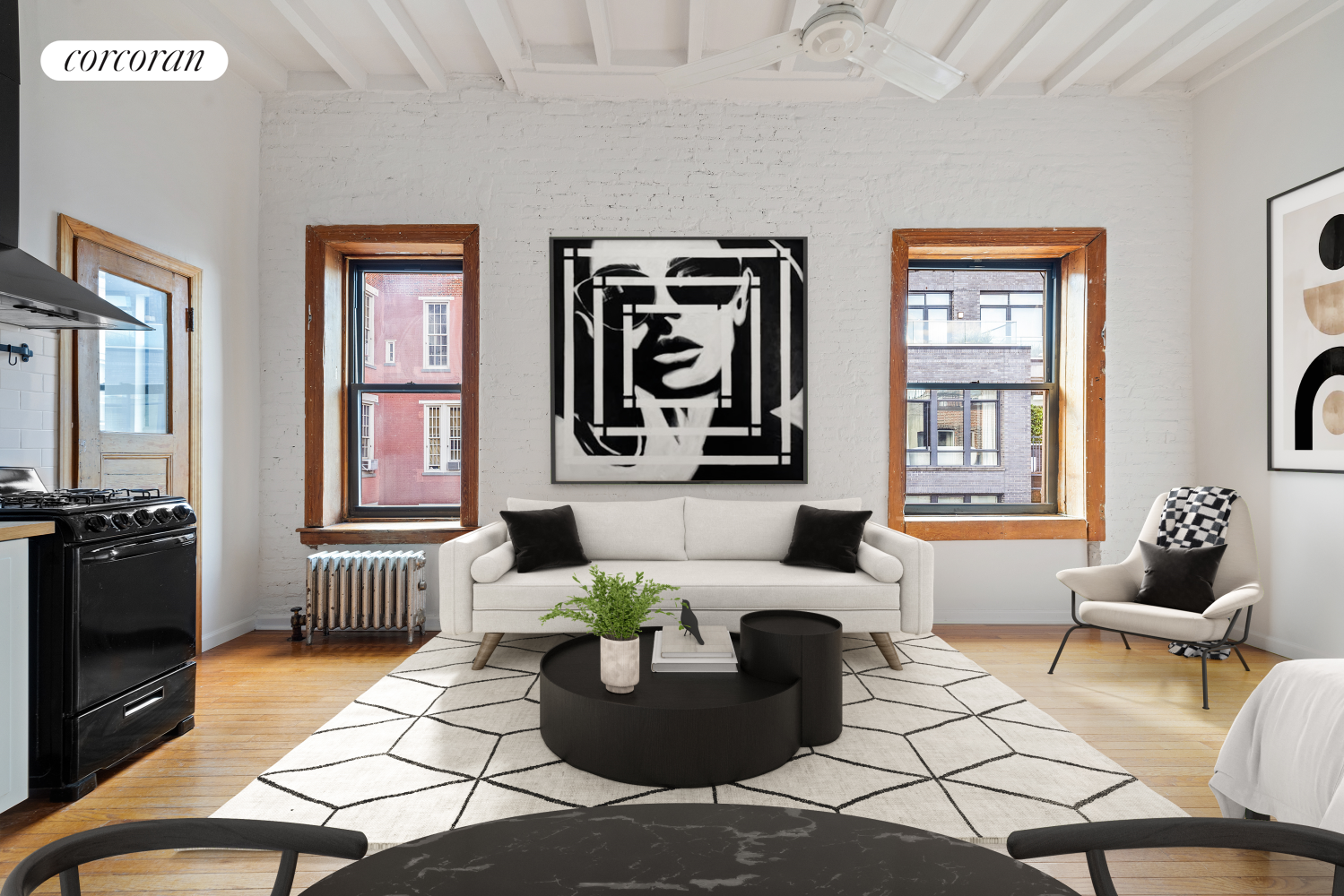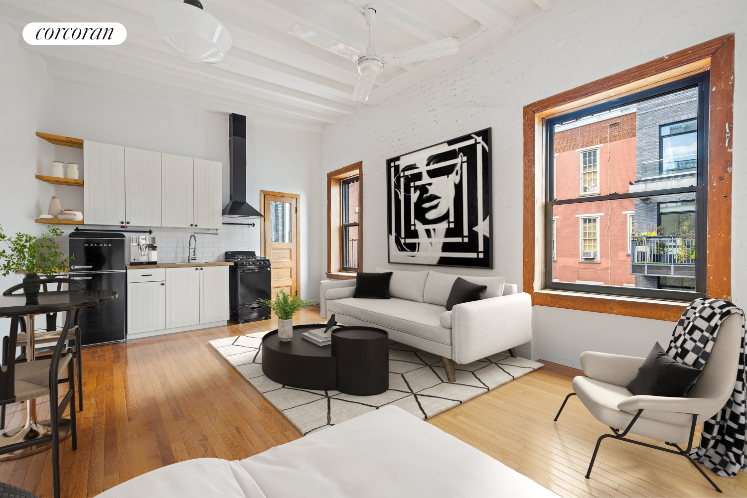 This is a tremendous opportunity to own this top floor, LOFT-like apartment, located at the vibrant intersection of the Lower East Side, Nolita, and East Village, which is a stunning blend of pre-war charm and modern convenience. The apartment's character is elevated by 11-foot beamed ceilings, freshly painted, exposed brick wall, and beautiful hardwood flooring. Two oversized west-facing windows, framed by the original wooden trim, fill the space with natural light, highlighting its unique beauty.