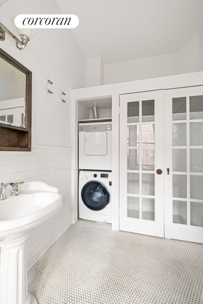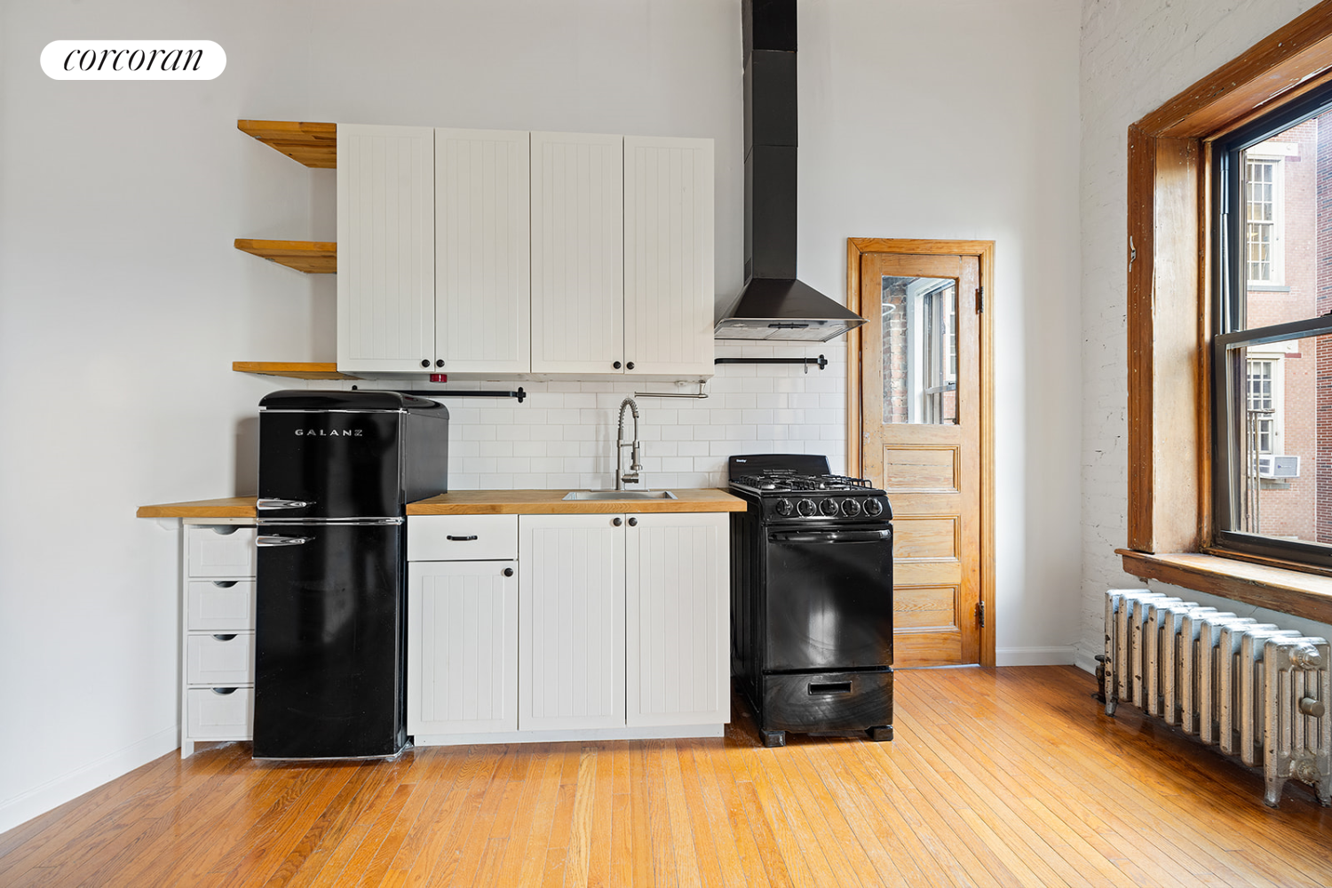 The recently updated kitchen is equipped with new countertops, a modern oven, and a refrigerator, making it fantastic for home chefs. The spacious bathroom features a freestanding cast-iron tub, two windows, and generous closet space, providing a serene retreat within the city. Additionally, the convenience of an in-unit washer and dryer enhances the modern living experience.