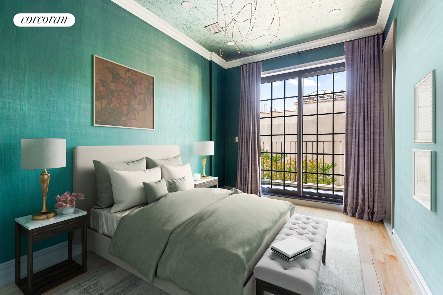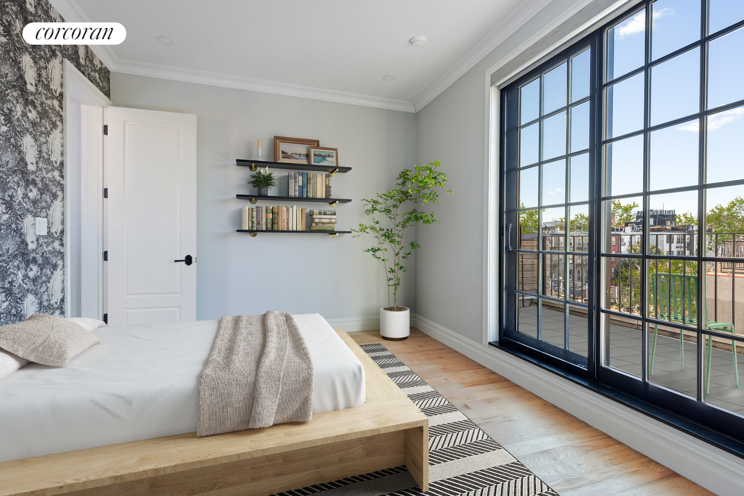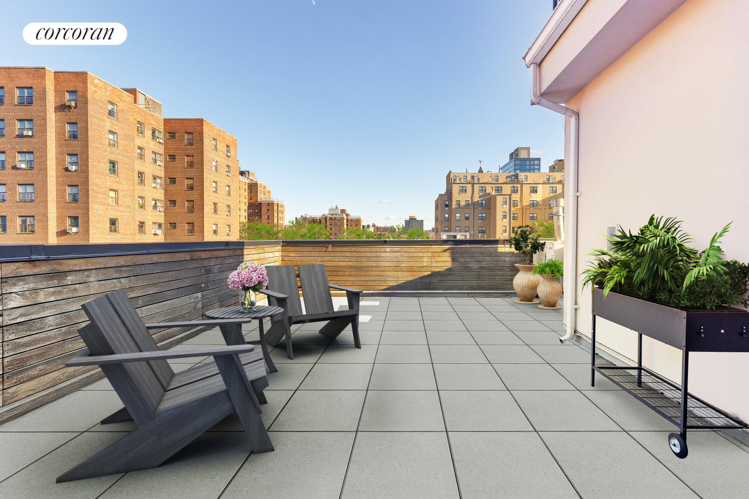 The top level provides flexibility with a third bedroom, complete with an en-suite bath and private terrace. This floor also features a massive, private outdoor sanctuary. The terrace, finished with bluestone and Ipe wood, offers stunning city views and ample space for relaxation or entertaining. Its size rivals that of a Brooklyn backyard and can be outfitted with an outdoor kitchen for dining under the stars.