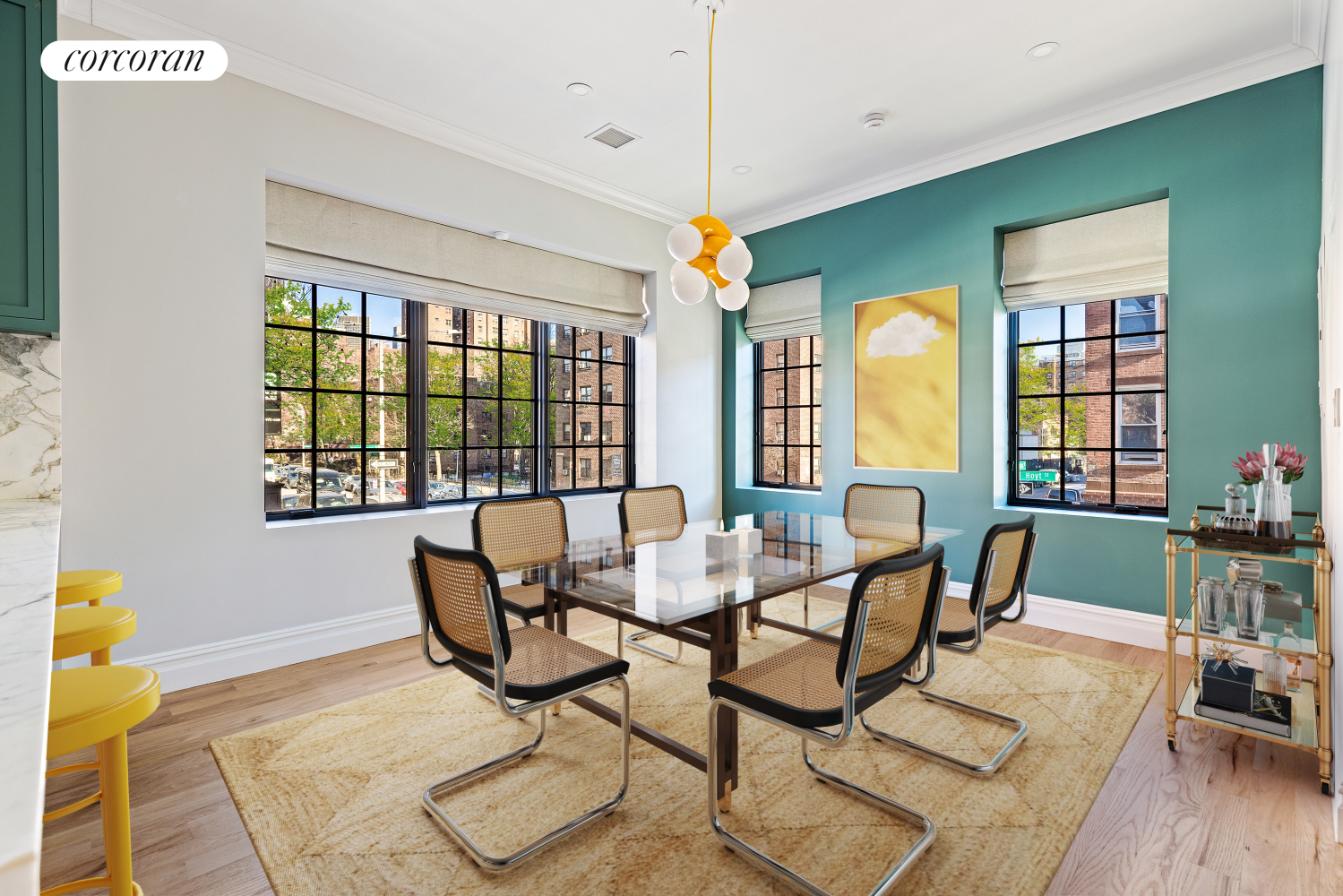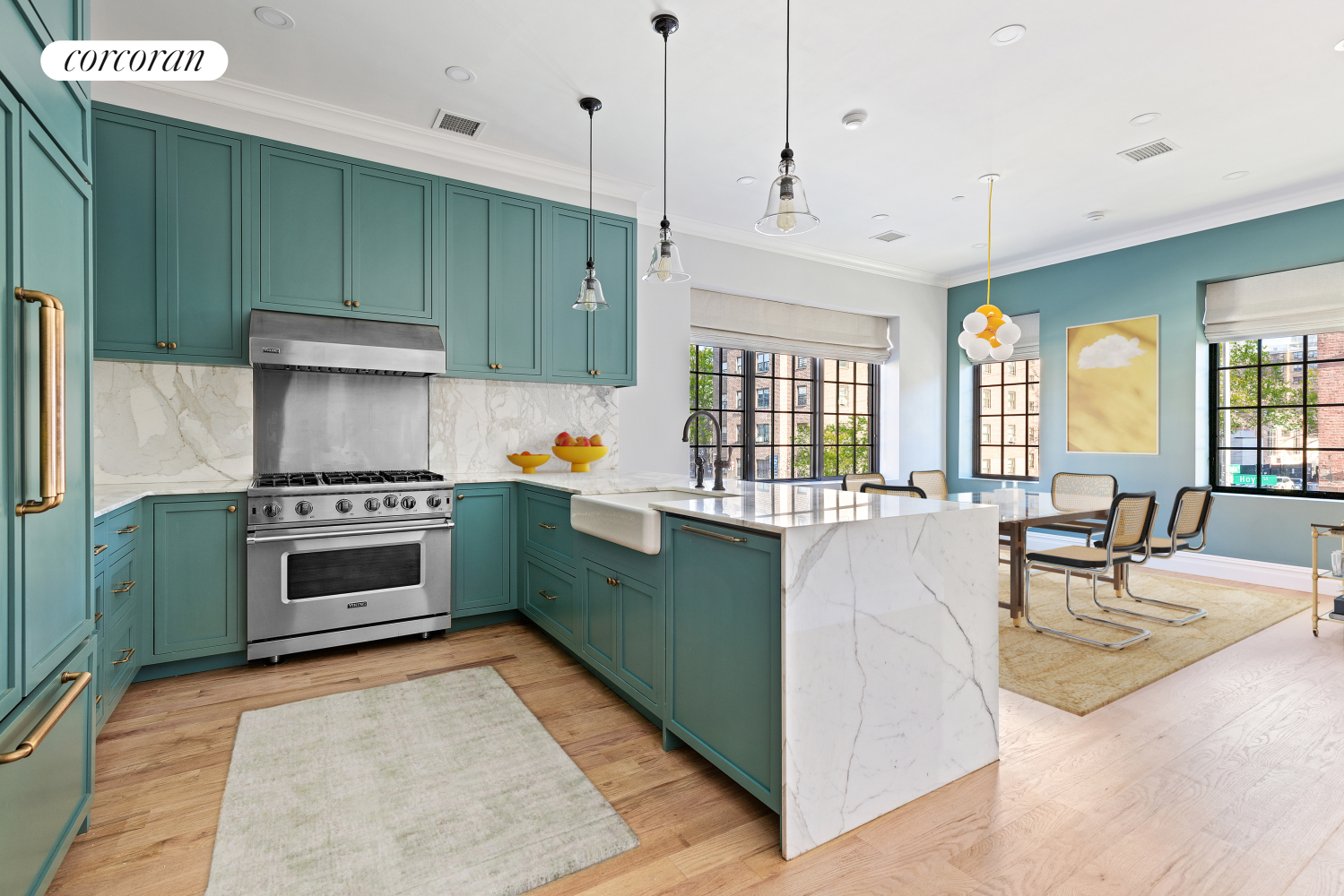 Up just one flight of stairs, the entry floor welcomes you with a chef's kitchen that is as functional as it is beautiful. It features Calacatta marble countertops, custom inset cabinetry, a six-burner Viking range, and a French door Sub-Zero refrigerator. The open kitchen flows into a spacious, light-filled corner dining area, for hosting memorable gatherings.