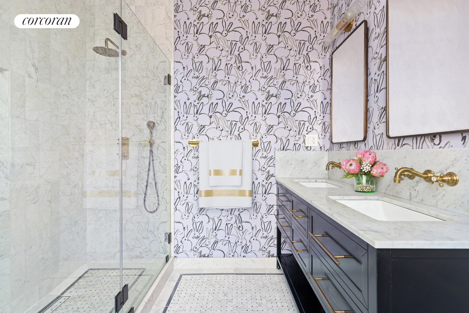 The second level offers a serene retreat with a cozy corner living room equipped with a custom wet bar, as well as two generously sized bedrooms. The primary suite stands out with its walk-in closet, private terrace, and a spa-like windowed bathroom boasting floor-to-ceiling marble.