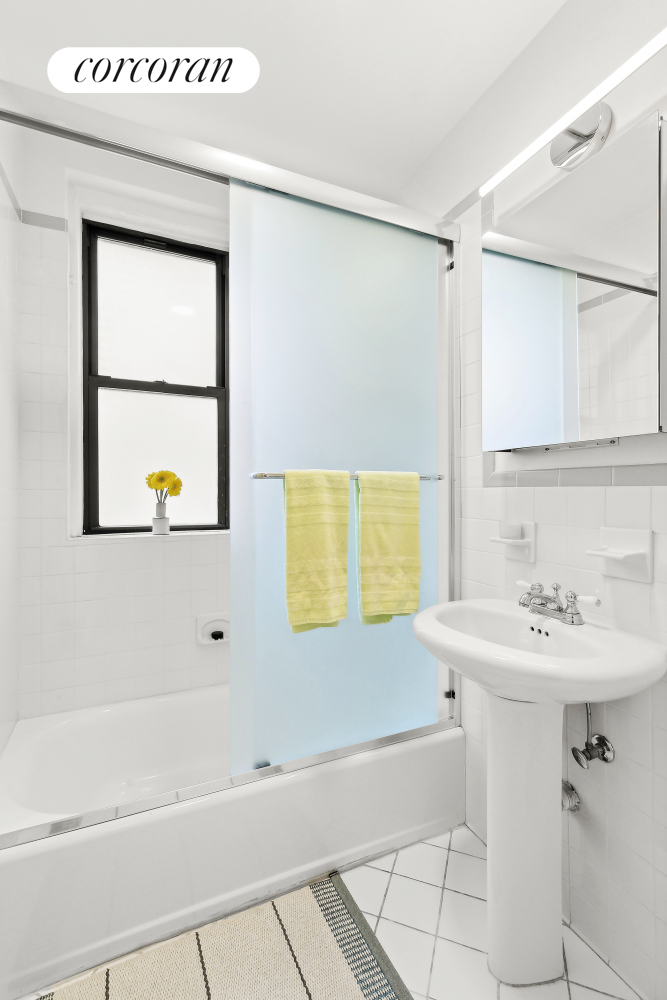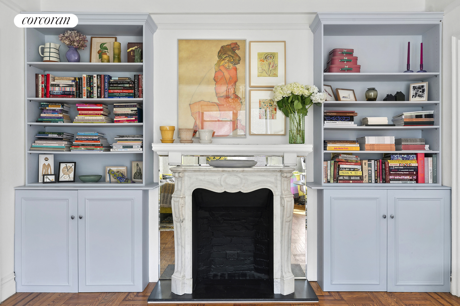 Drenched in natural light from southern and eastern exposures, the airy living space is a perfect blend of classic pre-war charm and contemporary design. The expansive living room features custom built-in shelving and a beautifully detailed mantle, making it an inviting space to relax or entertain.