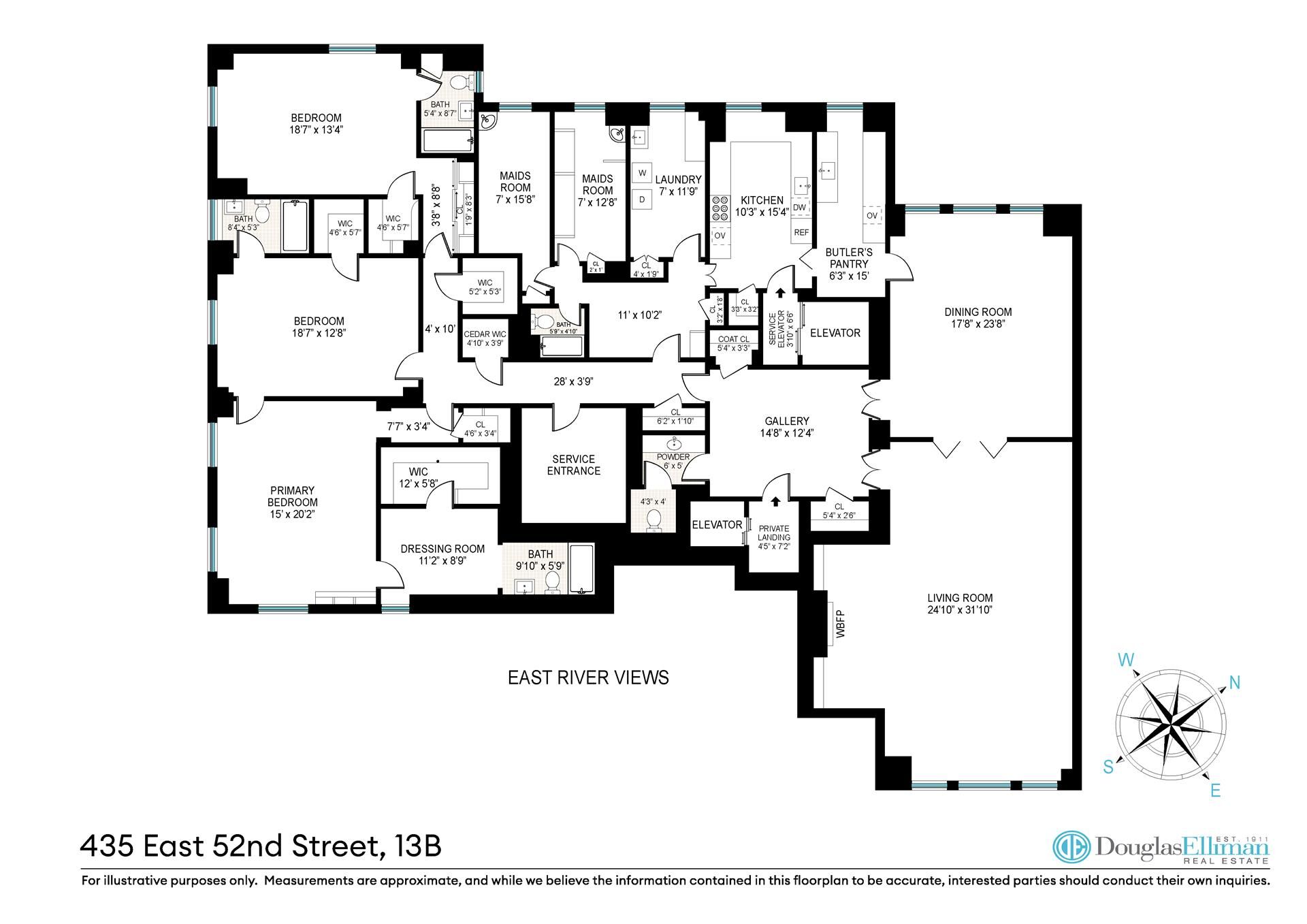 <br>Stunning East River and Southwest city views greet you from this elegant and expansive 9 room 4000 square foot layout with approx. 10' ceilings in the exclusive River House. The flexible layout is currently configured as a 3 bed, 4.5 bath with a double maids room, but can easily be converted to a 4th bedroom or home office.<br><br>You enter the apartment from your private elevator landing into a gracious gallery with a powder room. The West facing dining room can easily host 25+ guests and flows into a sunlit immense 31' living room with a wood burning fireplace and marble mantle, spectacular river and bridge views, and a total of 55' span of endless entertaining space. <br><br>The windowed kitchen is currently configured with a separate butler's pantry and laundry room, but can easily be opened up to create a large eat in chef's kitchen. The primary corner bedroom has sun-filled Southeast views from 3 windows, an en-suite bathroom with an 11' x 8' dressing room and walk in closet. 2 additional bedrooms with en-suite baths complete this rare offering.<br><br>Additional features include oak floors with beautiful mahogany inlays, original custom moldings, brass hardware, and 14 closets throughout.<br><br>The River House, one of the most acclaimed full-service white glove prewar coops in all of NYC was built in 1931 by James Stewart and designed by Wagner and White as a 26-story Art Deco building at the end of a quiet cul de sac with a private gated cobble-stone courtyard. <br><br>A live-in resident manager, multiple doormen, and lobby attendants provide the ultimate in service and privacy. 3% flip tax paid by purchaser. Pets and pied-a-terres permitted.<br><br>New shareholders at the River House have access to the fitness center and pool and are welcome to apply for a full River Club membership. The newly renovated private facility, which has its own we entrance on 52nd St. and is also accessible through the building lobby, has 3 squash courts, 2 tennis courts, a golf simulator, swimming pool and several entertaining and dining spaces.