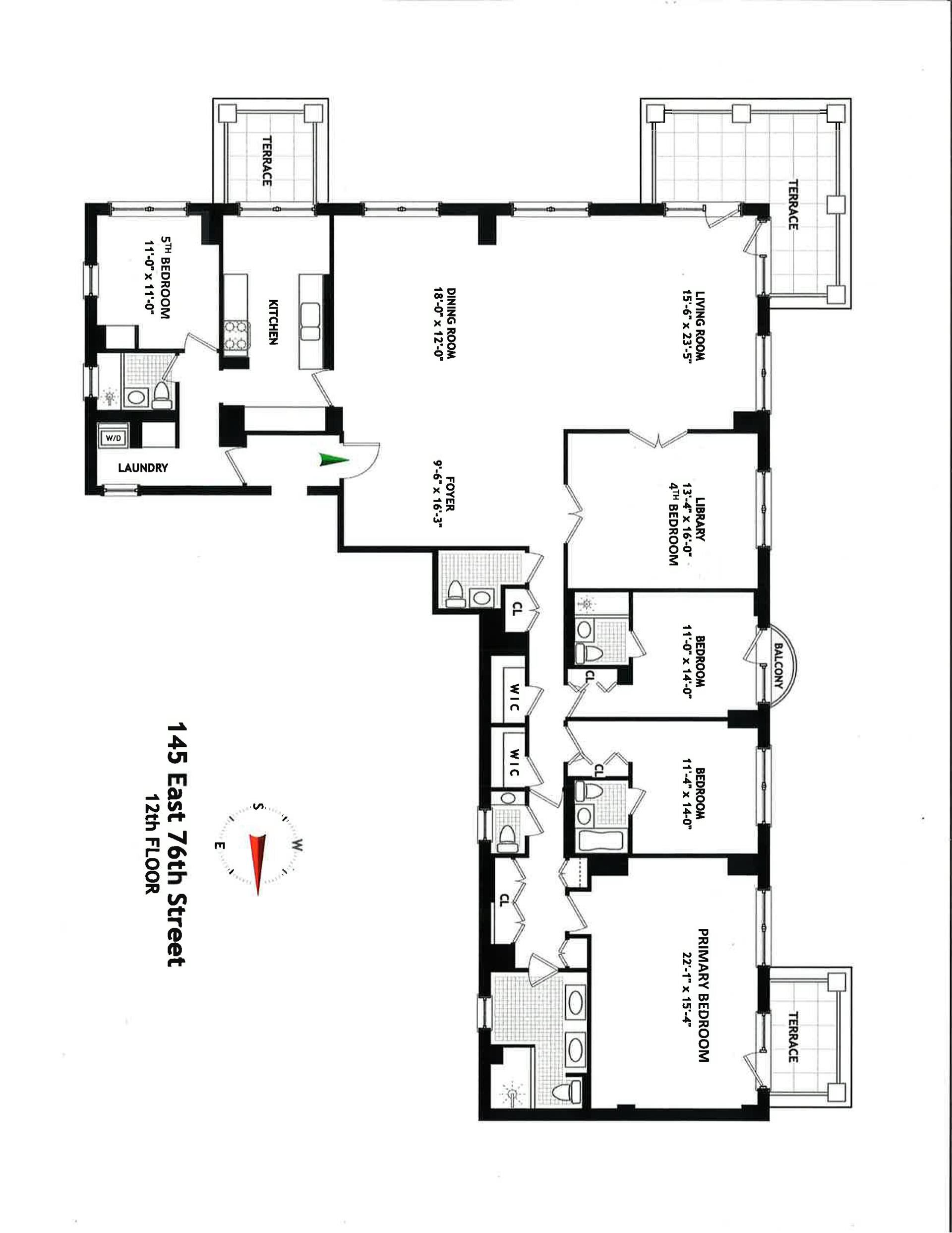 Perched high in a rare and sought-after Boutique White-Gloved Doorman Building on the Upper East Side. This bright sprawling 8 room, private full-floor luxurious residence offers incredible space and sweeping city views.<br>The Elevator leads to a beautiful private landing with dual access to both the service and primary entrances.<br><br>The apartment is flooded with sunlight. through oversized floor-to-ceiling windows facing showcase magical open city views and floods the ambiance with natural light from north ,south, east and west exposures.<br><br>Three wonderful private terraces provide outdoor pleasure and exquisite vistas from various vantage points. The largest is off the corner living room where entertaining is divine. Private terrace, also sits off the recently upgraded Gourmet Kitchen and peaceful primary bedroom suite on the opposite end of the home.<br><br>A gracious entrance foyer welcomes you into the expansive 3,196+/ interior graced by 10' ceilings, gleaming hardwood floors and refined modern finishes. Your comfort is enhanced with an open living-/ dining room, library/or 4th bedroom, 3 generously sized bedrooms, a staff room /or 5th bedroom, 4 full baths, 2 powder rooms, abundant closet space. Laundry area with newer washer and dryer. Individual room-controlled heating /AC<br><br>145 East 76 is a Boutique Luxury Doorman building with a grand design. Amenities include 24 hour doorman, live-in super, fitness room, playroom. meeting/rec room with catering kitchen, bicycle room and garden courtyard. The prime location is minutes from Central Park, world class museums, upscale shops and restaurants and plentiful transportation. Pets are allowed on a case by case.