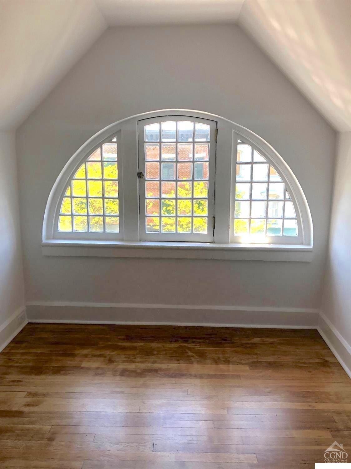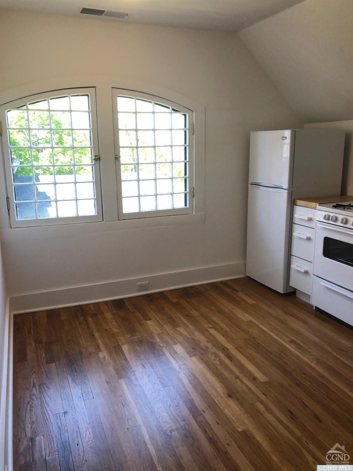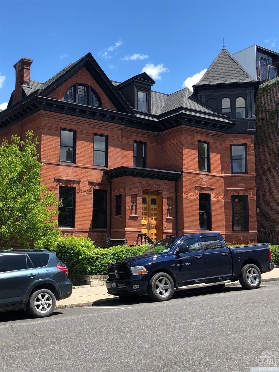 This top floor space in this NO PETS building is reminiscent of a Parisian apartment and is bathed in great light with views on both Warren Street and to the North. Private, security system, back entrance including an off street parking space. Efficient, eat in kitchen with dishwasher, new stacked washer and drier, central air and filtration system for air dedicated to this space, Many ceiling angles lend an artistic feeling to all rooms. Unique architectural windows with catbird views in all directions.In an important 1880's building built by Cornelius Evans, a Hudson brewer, businessman and Mayor,Private parking space in landlord owned lot just across the street. Walk to everything from one of the most desired blocks on Warren Street.