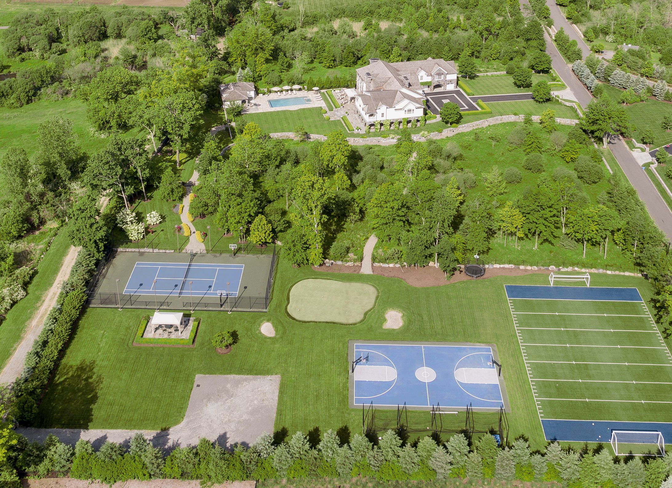 Beyond Value. Custom-built for entertaining Colonial estate set on 7.23 private, acres offers unmatched sports amenities in the private grounds annex at "5 Sarosca Fields" incl. basketball court, turf field, lighted tennis court, batting cage, putting & chipping + Gunite pool & spa w/fully outfitted pool house. Open/covered terraces w/outdoor FPL. A level of construction rarely offered, this luxe property offers all the amenities for today's luxury lifestyle. Thru gates, a courtyard entry invites you in to thoughtfully-designed rms for large scale entertaining & comfortable family-style spaces for easy, everyday living. Soaring ceilings, oversized windows/doors, rich paneling/stone work, custom millwork, terraces & balconies are incorporated throughout. Walk-out 5100sf lower level of FUN w/serious home gym, wine cellar, media/theater, billiards+ great rm w/built-in custom bar, massage rm & private guest suite. Att. 3Car Gar w/carport. This property has imagined it ALL. The Buy of 2020.
