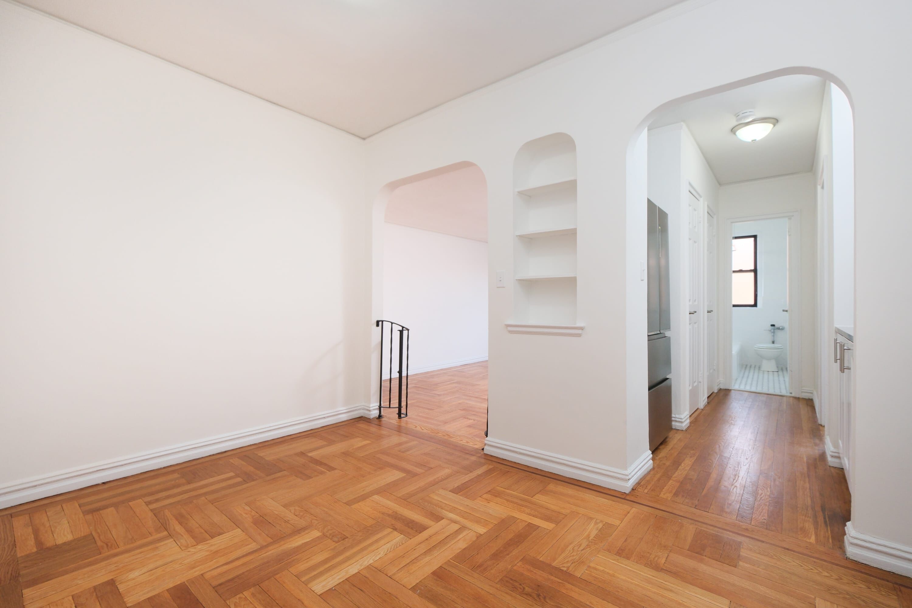 2685 CRESTON AVE #5-E, BRONX, NY 10468 - KINGSBRIDGE HGTS SPONSOR UNIT (No Board Approval) 615 s/f (1) BED w/ Entry, Dining Foyer w/ renovated Pullman Kitchen, white Shaker style cabinets & stainless appliances; Sunken east-facing Living Room w/ original basket-weave parquet floor, plaster arches; Hall/Dressing Area w/ white Shaker style cabinets, east (front-facing) Bedroom, windowed Bath; w/ abundant eastern sunlight. Art-Moderne elevator building attributed to architect H. Herbert Lilien, ca. 1940. Exceptionally managed, meticulously maintained 6 story, 73 unit non-D/M building w/ Main Lobby featureing a dramatic Machine Age terrazzo floor,'Rosso' marble walls, plaster moldings & niches and a new elevator cab w/ original embossed elevator door. Actual $799.08 Maint. (as of 07/01/2025) includes H & H/W. Resident supt. & on-site laundry. Convenient to Kingsbridge Road & Grand Concourse shopping, MTA XP/local buses, IND B/D/IRT #4 Subway Kingsbridge Road station. EZ access to midtown NYC in 30 minutes. Capture these stylish digs for $35K cash down. No Pets/No Investors, please.