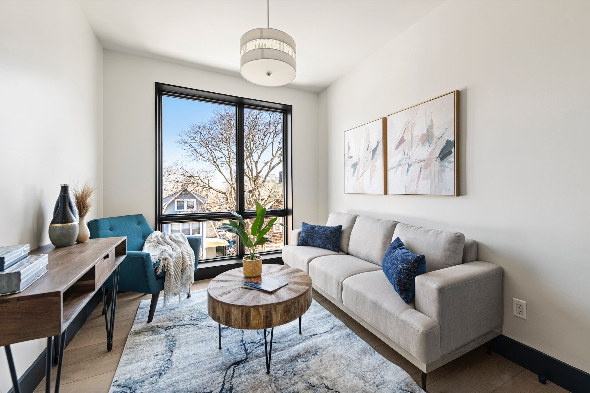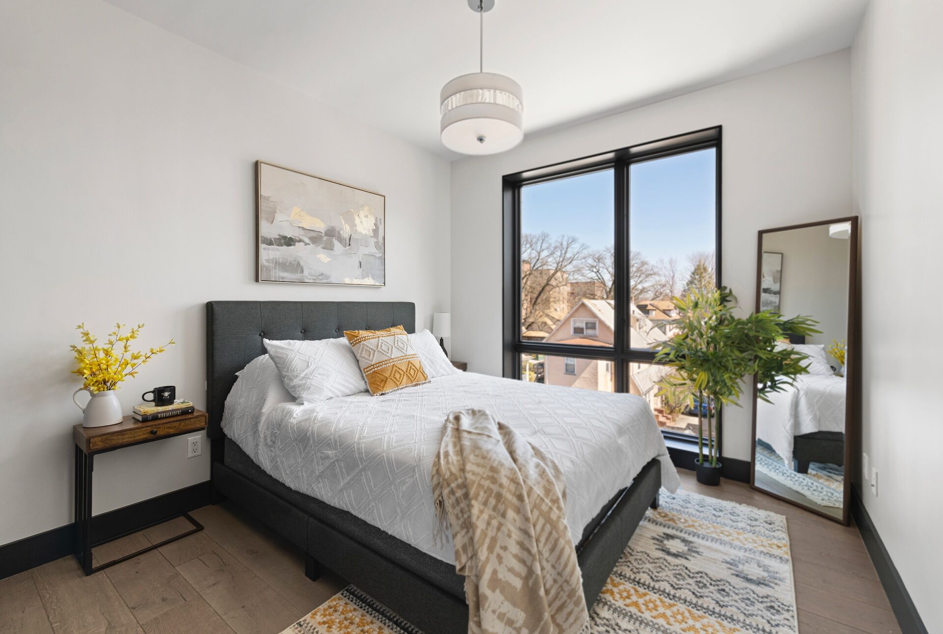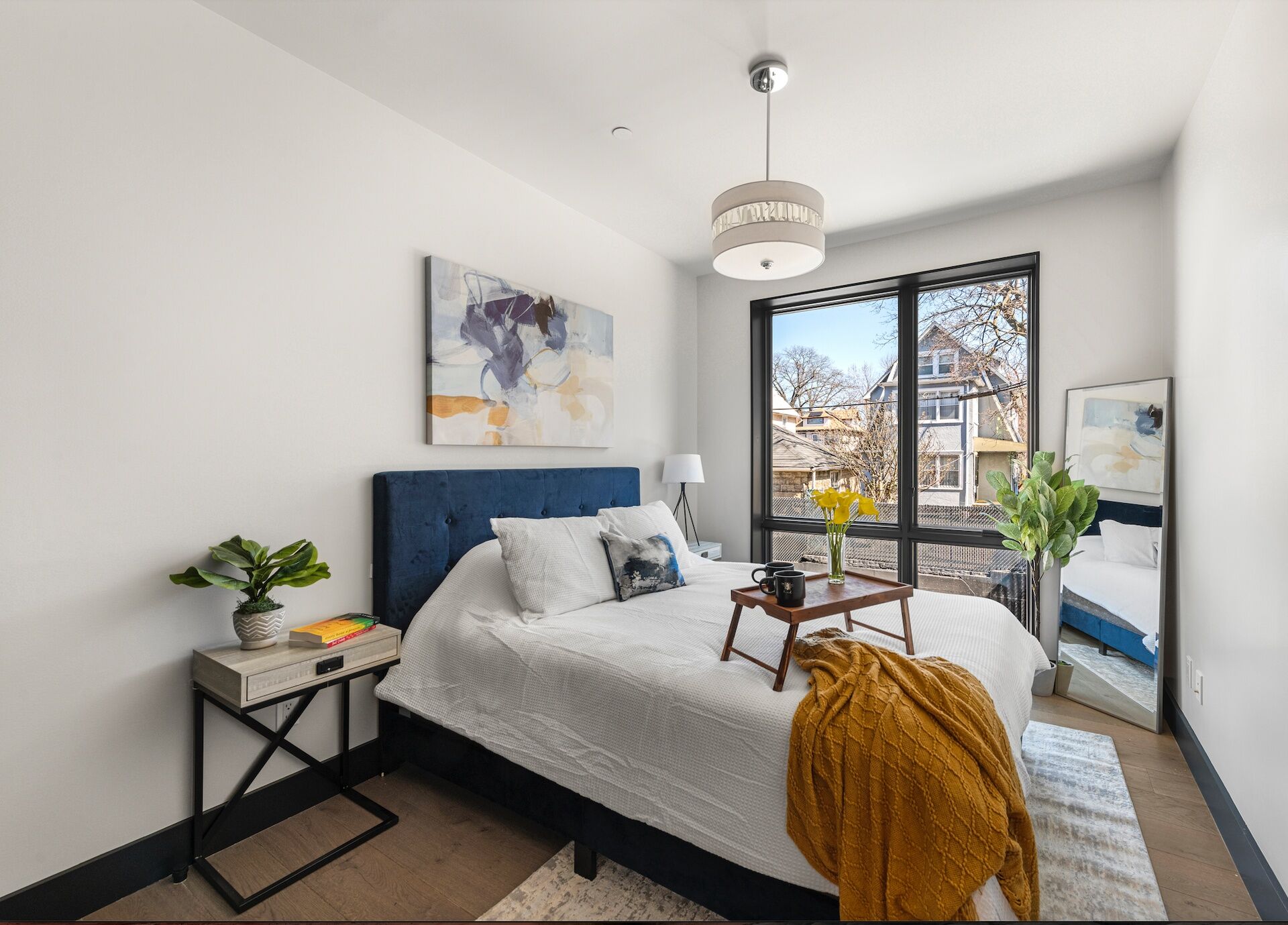A split-wing layout ensures both bedrooms are quiet and private. They each receive vibrant morning light and have large reach-in closets and easy access to a full bathroom with a custom floating vanity, matte black Fine Fixtures, chic stone tile walls and floors, and a deep tub. The home has WAC recessed lights, an Aiphone intercom system, and a smart LG Wi-Fi-enabled combination washer/dryer.