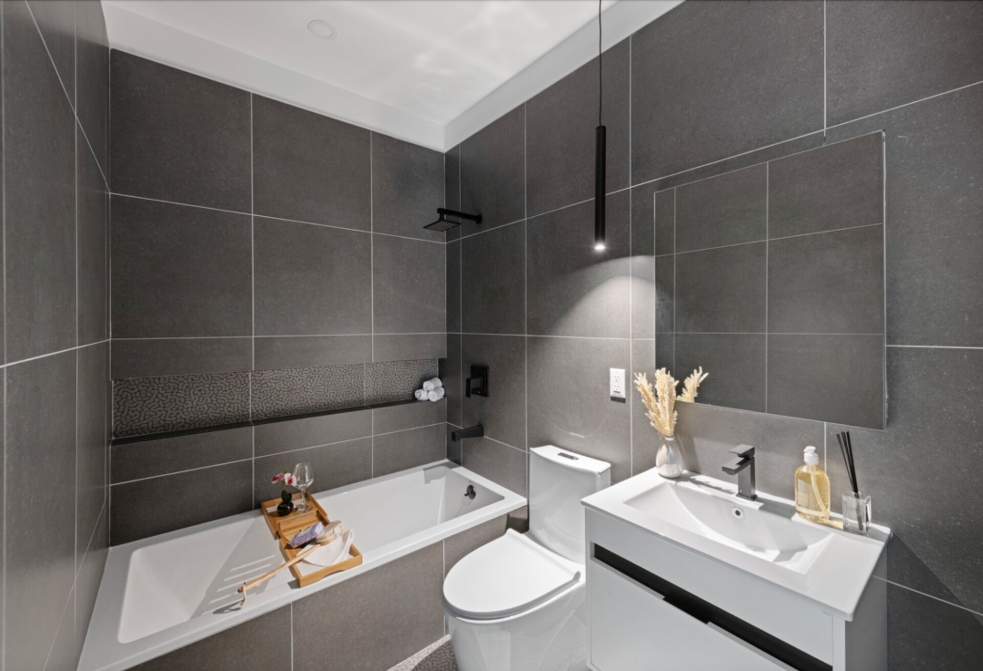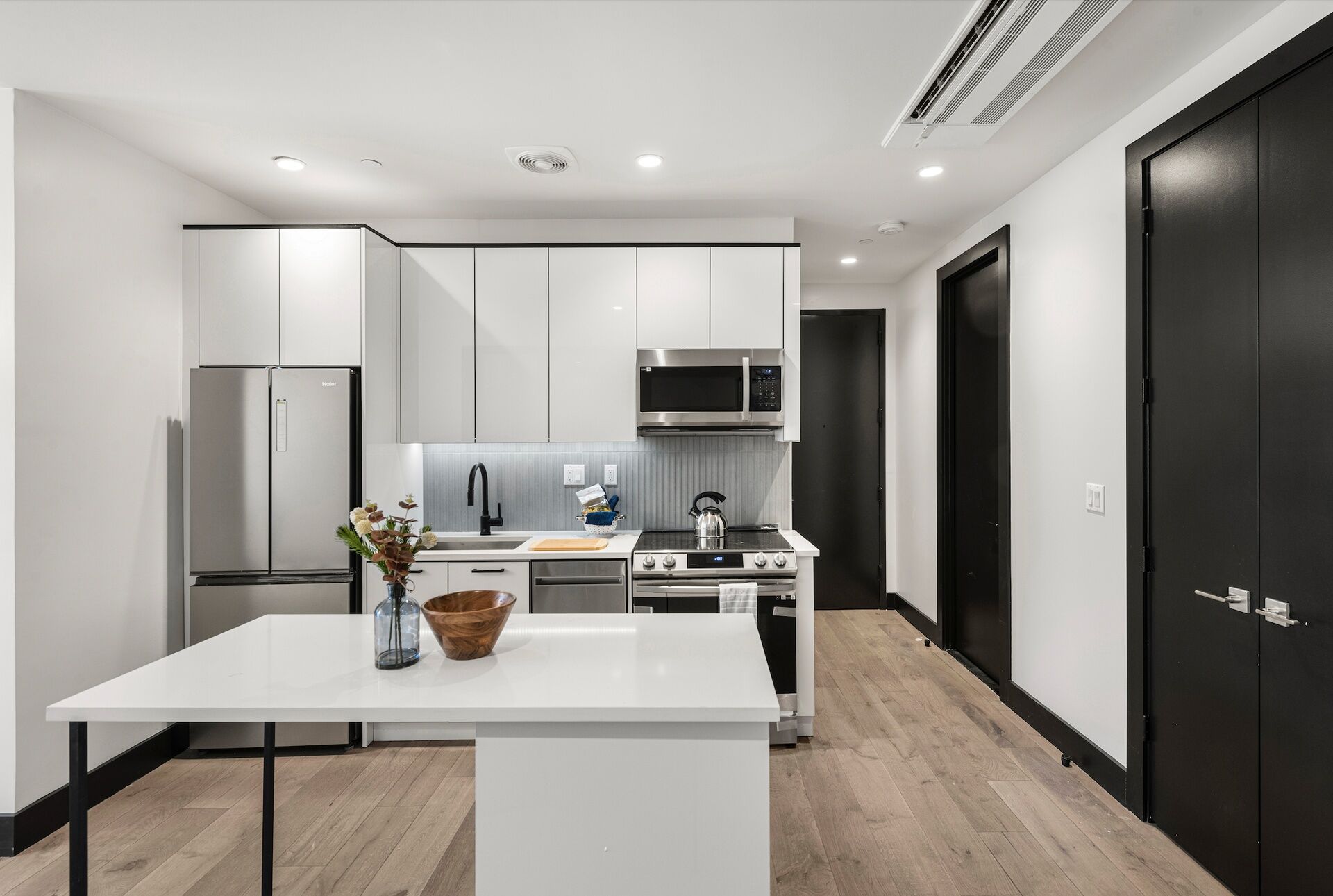 A welcoming foyer flows into an open-plan kitchen and living and dining area perfect for lounging and casual entertaining. The custom acrylic kitchen features gleaming MSI quartz countertops, custom Blum soft-close cabinets with LED under lighting, and stunning stainless steel appliances from LG. The bedroom receives vibrant eastern light and has a reach-in closet. The bathroom has a custom floating vanity, matte black Fine Fixtures, chic stone tile walls and floors, and a deep tub. The home has WAC recessed lights, an Aiphone intercom system, and a smart LG Wi-Fi-enabled combination washer/dryer.