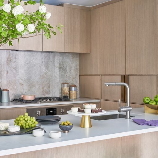 With interiors designed by ODA New York, The Brooklyn Grove features a subtle mingling of organic materials and lush textures. Each room offers unexpected touches and welcome surprises including wide plank oak flooring throughout. In the kitchen, custom rift oak cabinetry strikes a distinct contrast against the concrete-hued Caesarstone countertop, Taj Mahal stone backsplash, and antique brass hardware. The elegance of the bathroom is perfected with two types of marble and stone mingling to create a neutral palette that lets the world fall away. A composition of Santa Marina stone tile walls, Waterworks fixtures, and oak vanity with Fior di Bosco countertops complete the bath.