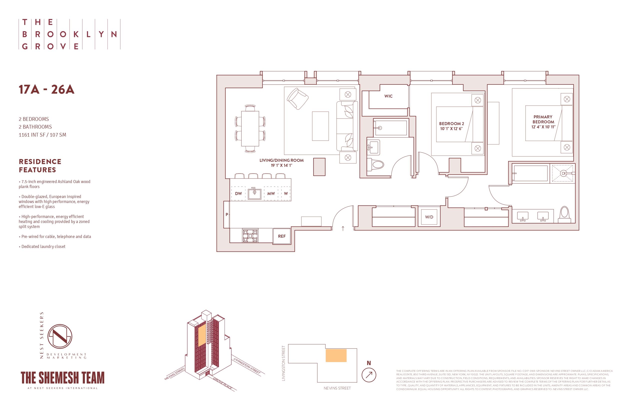 Residence 26A at 10 Nevins is an spacious 1161 Square foot 2 Bedroom, 2 Bath home. West-facing, wide open views over Downtown Brooklyn this home features an open plan and luxurious primary suite, second bedroom with a huge walk-in closet, a large kitchen with dining area and ceilings heights just shy of 10’.