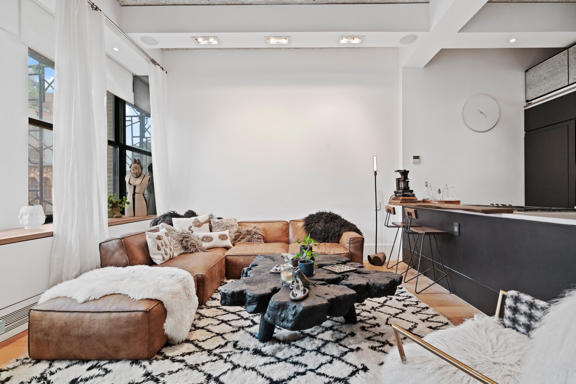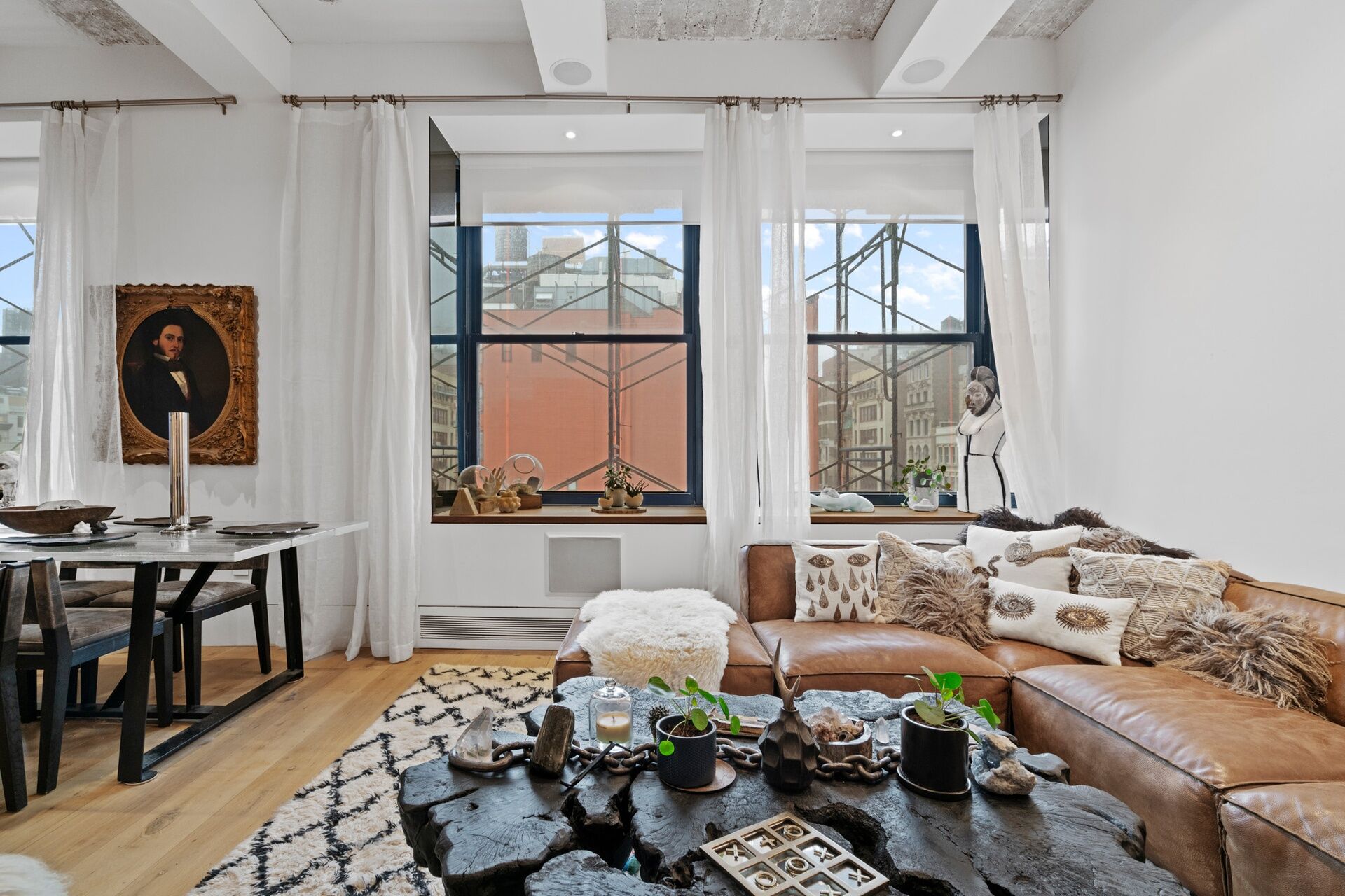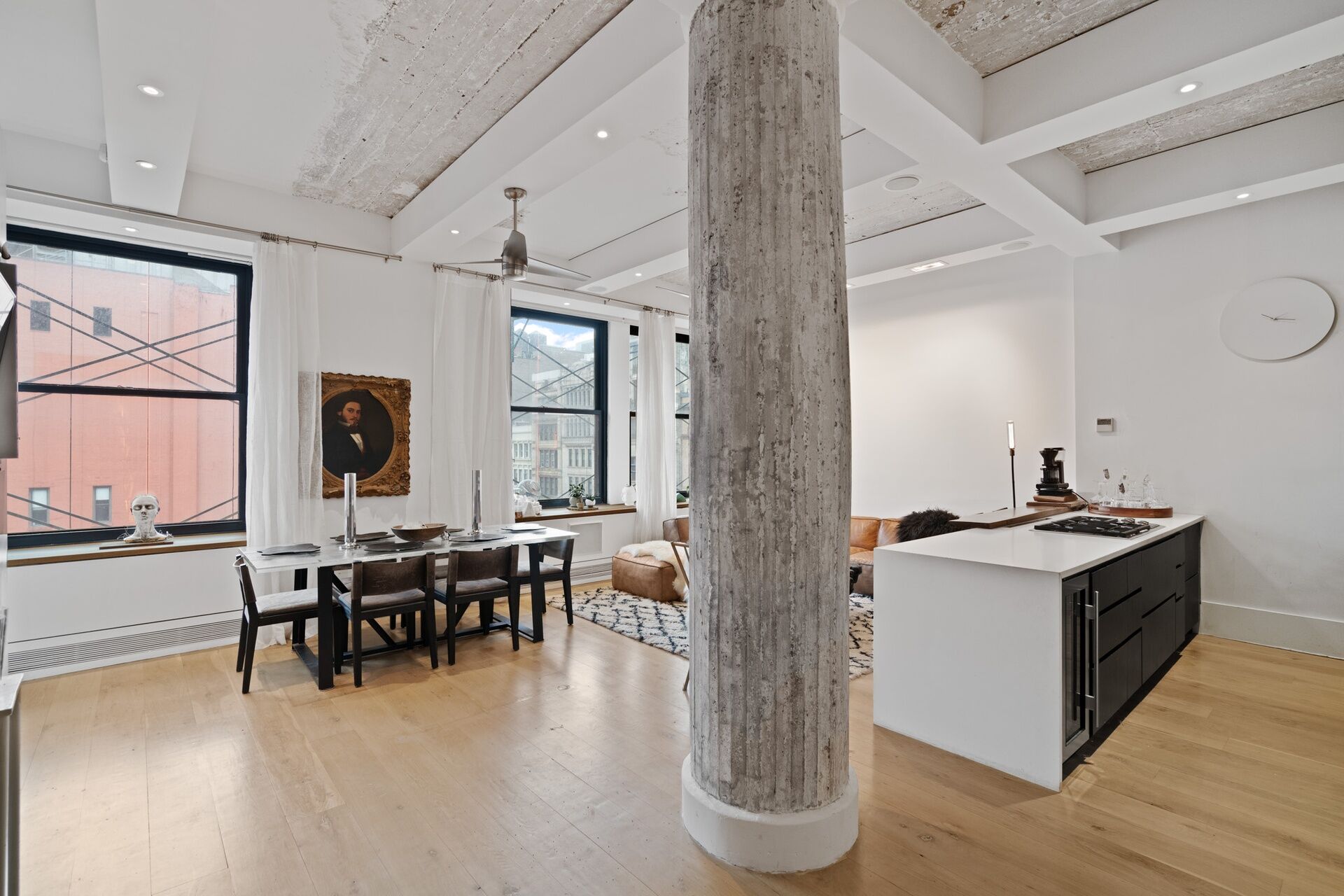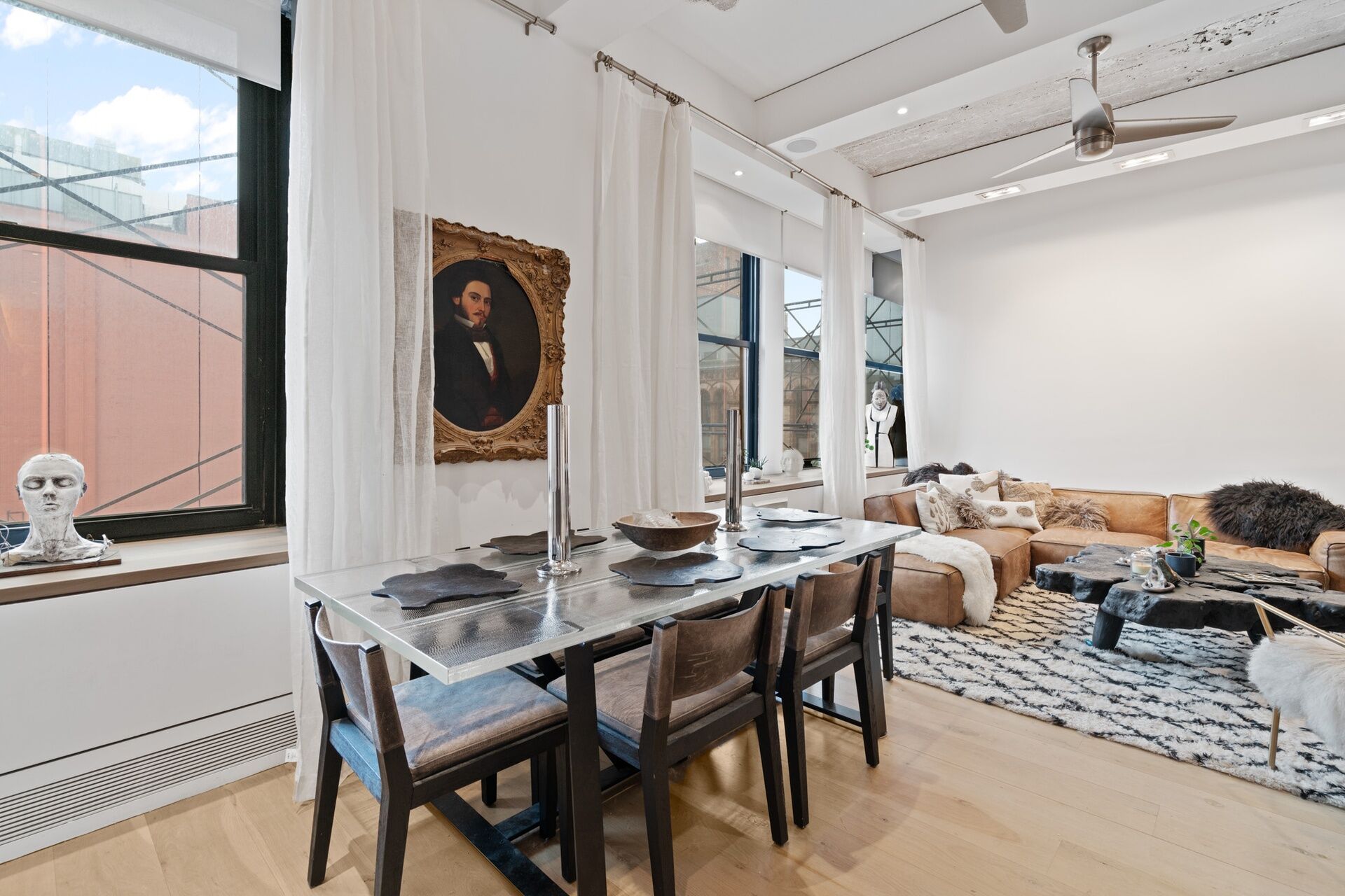 This recent, gut renovation is so high end that it is still pristine. Huge windows face the bright, northern light above classic roof tops; within, the mood of the 11+ foot high ceiling, and flowing interior is chic, elegant, and mellow—-with its 8 inch oak floors, Artemide lighting, and pretty, blue-flamed fireplace.