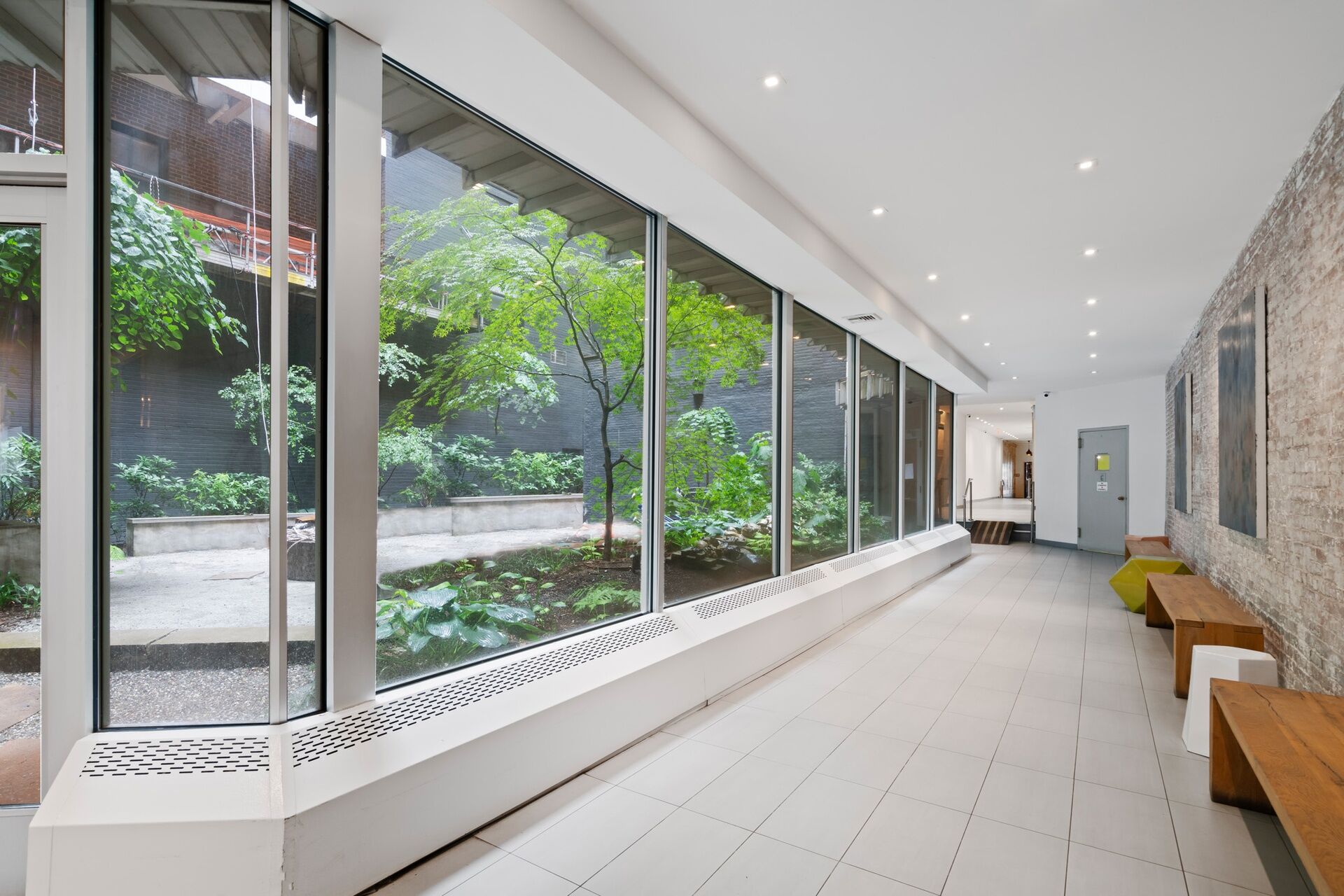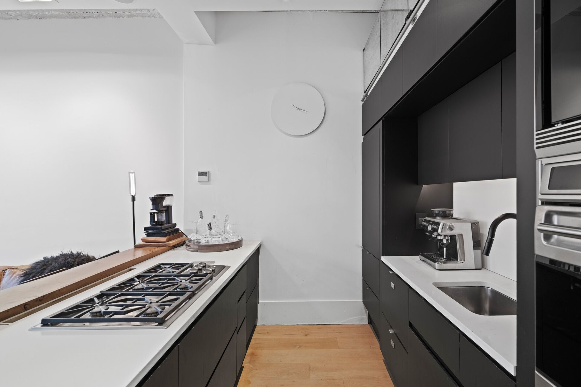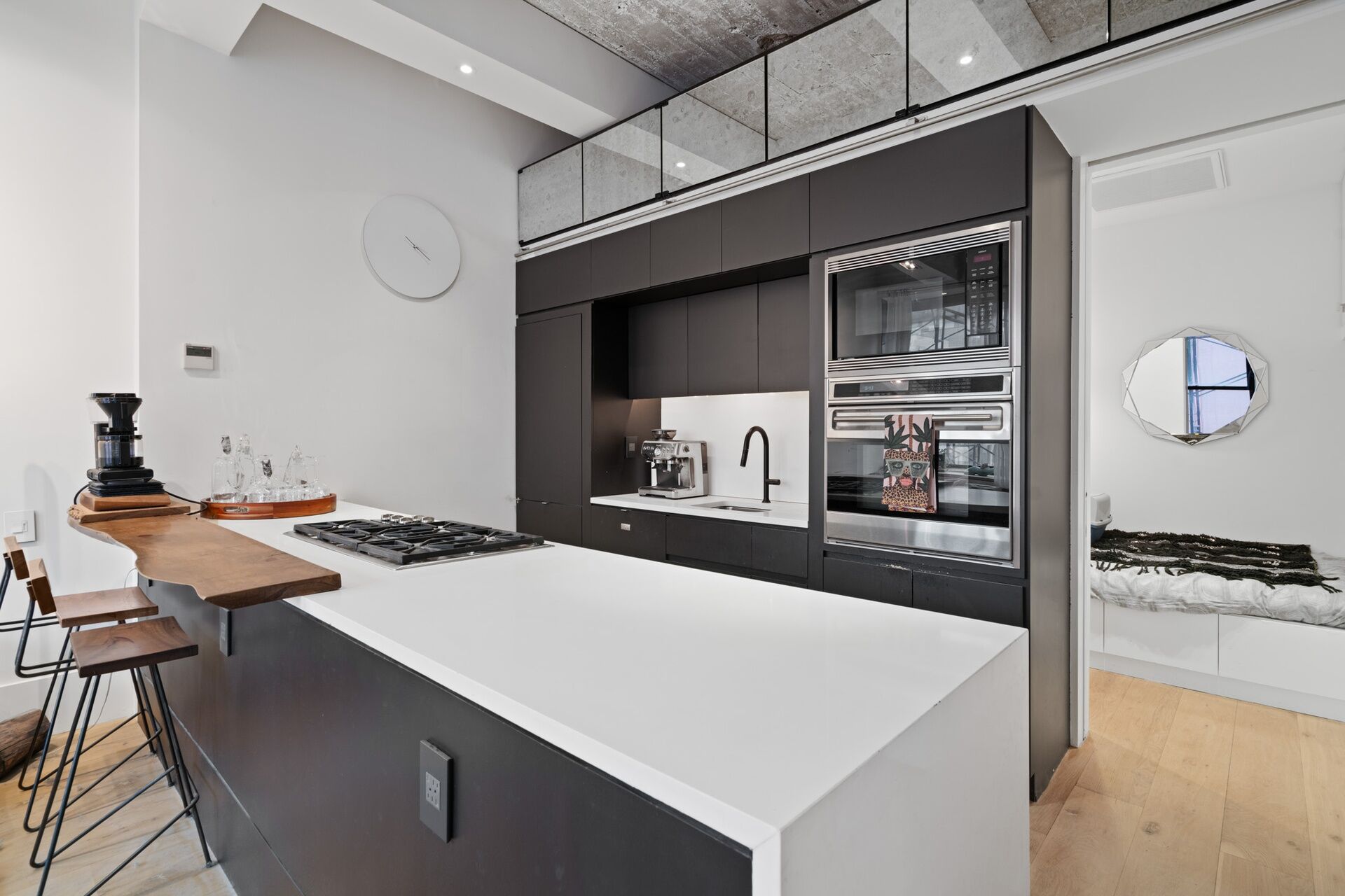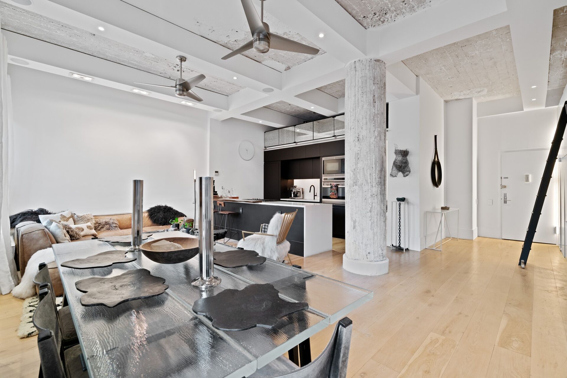 This recent, gut renovation is so high end that it is still pristine. Huge windows face the bright, northern light above classic roof tops; within, the mood of the 11+ foot high ceiling, and flowing interior is chic, elegant, and mellow—-with its 8 inch oak floors, Artemide lighting, and pretty, blue-flamed fireplace.