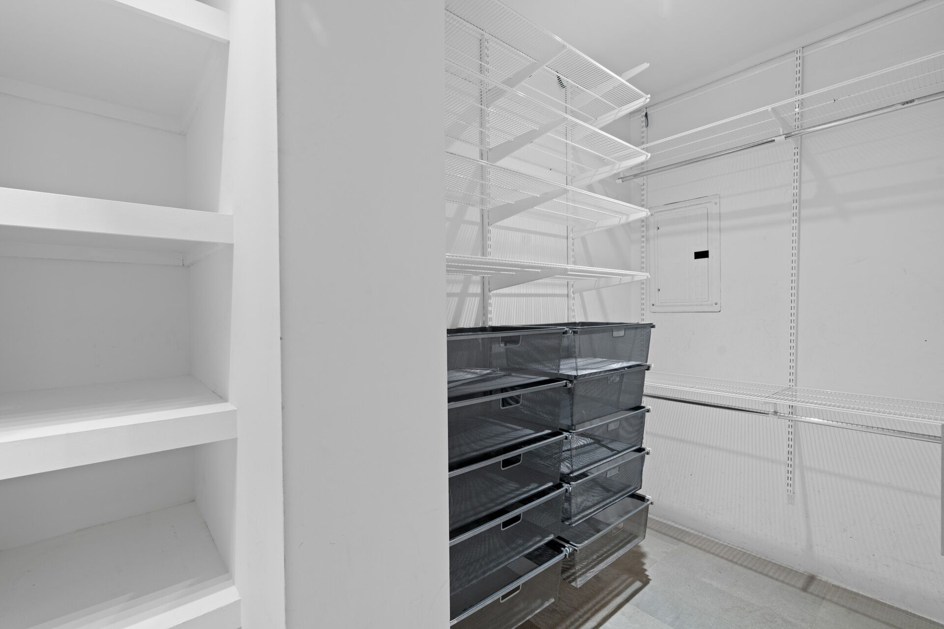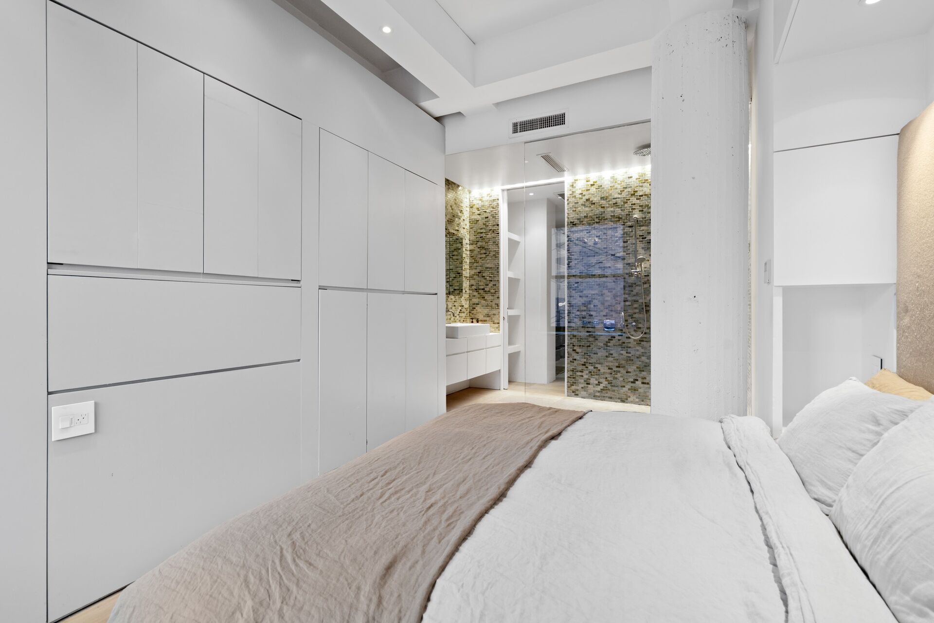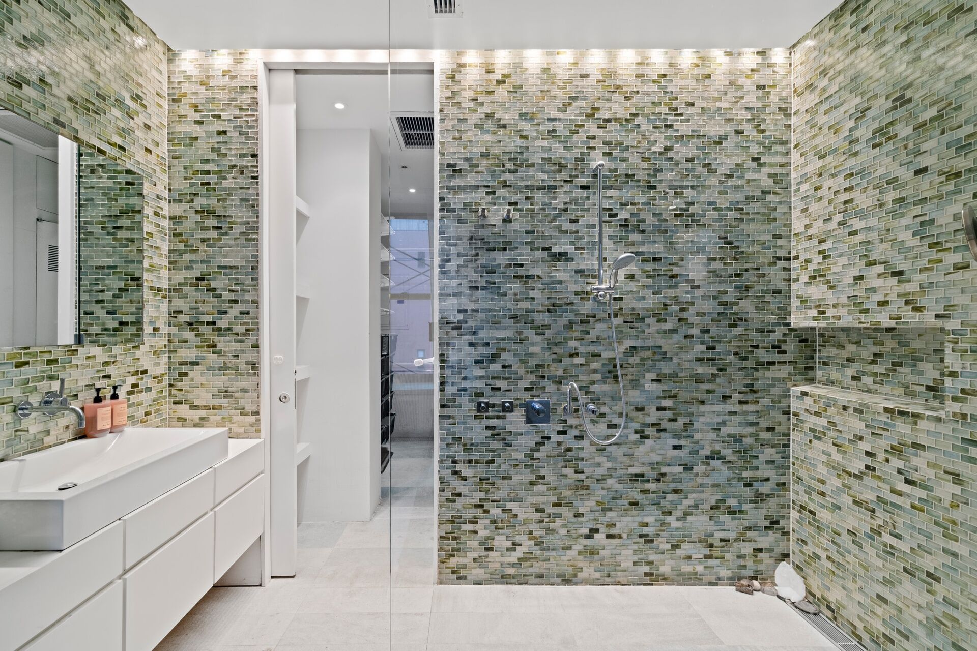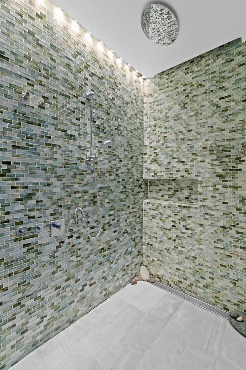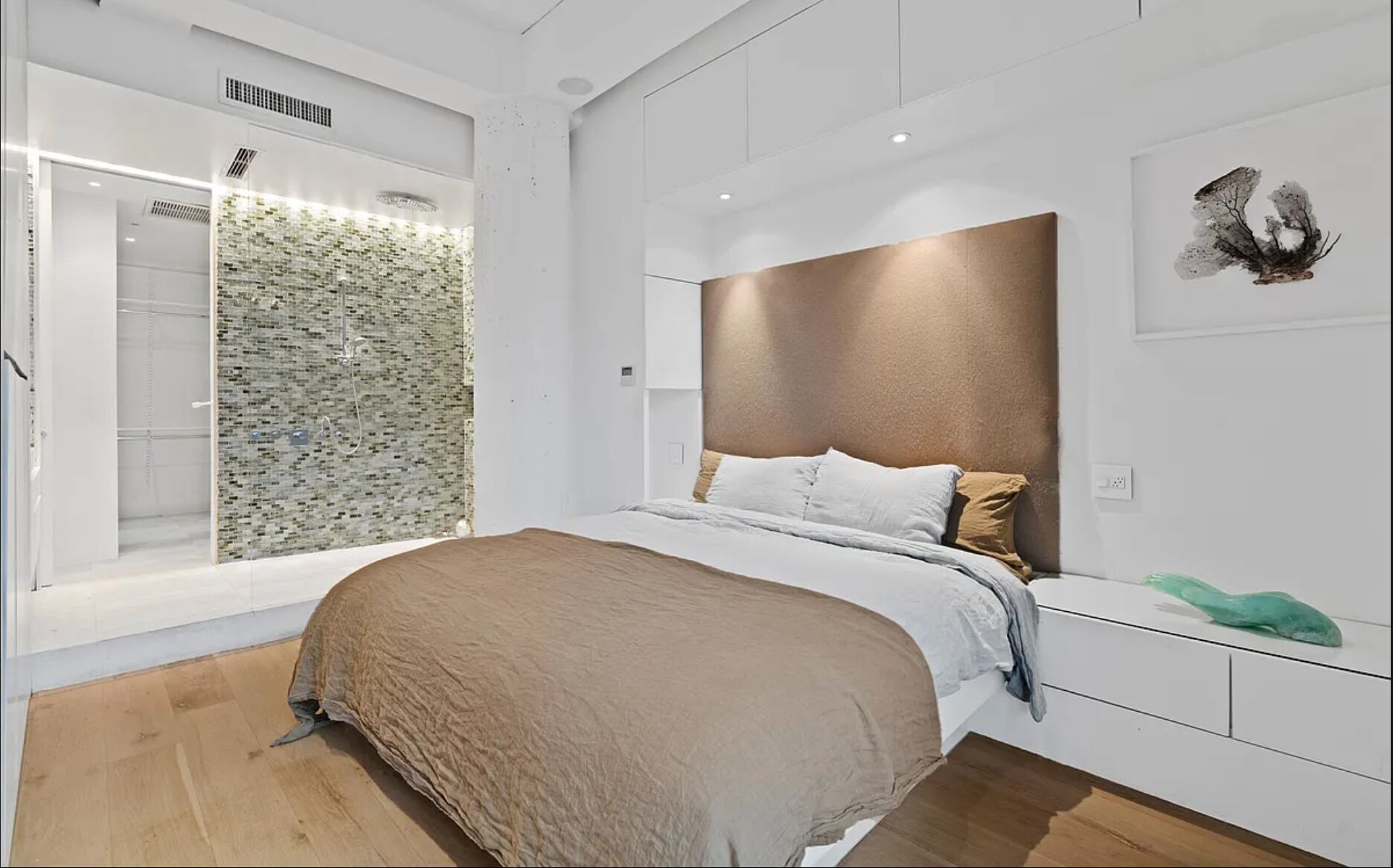 The master suite is a work of art in its design: the mossaic-tiled shower is as big as a room, and because of the endless closet and enclosed shelf space, the bedroom needs nothing more than a bed, a chair, to preserve the flow.