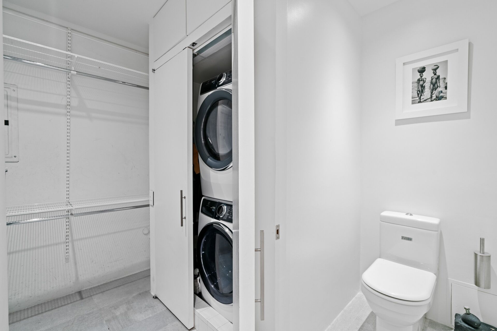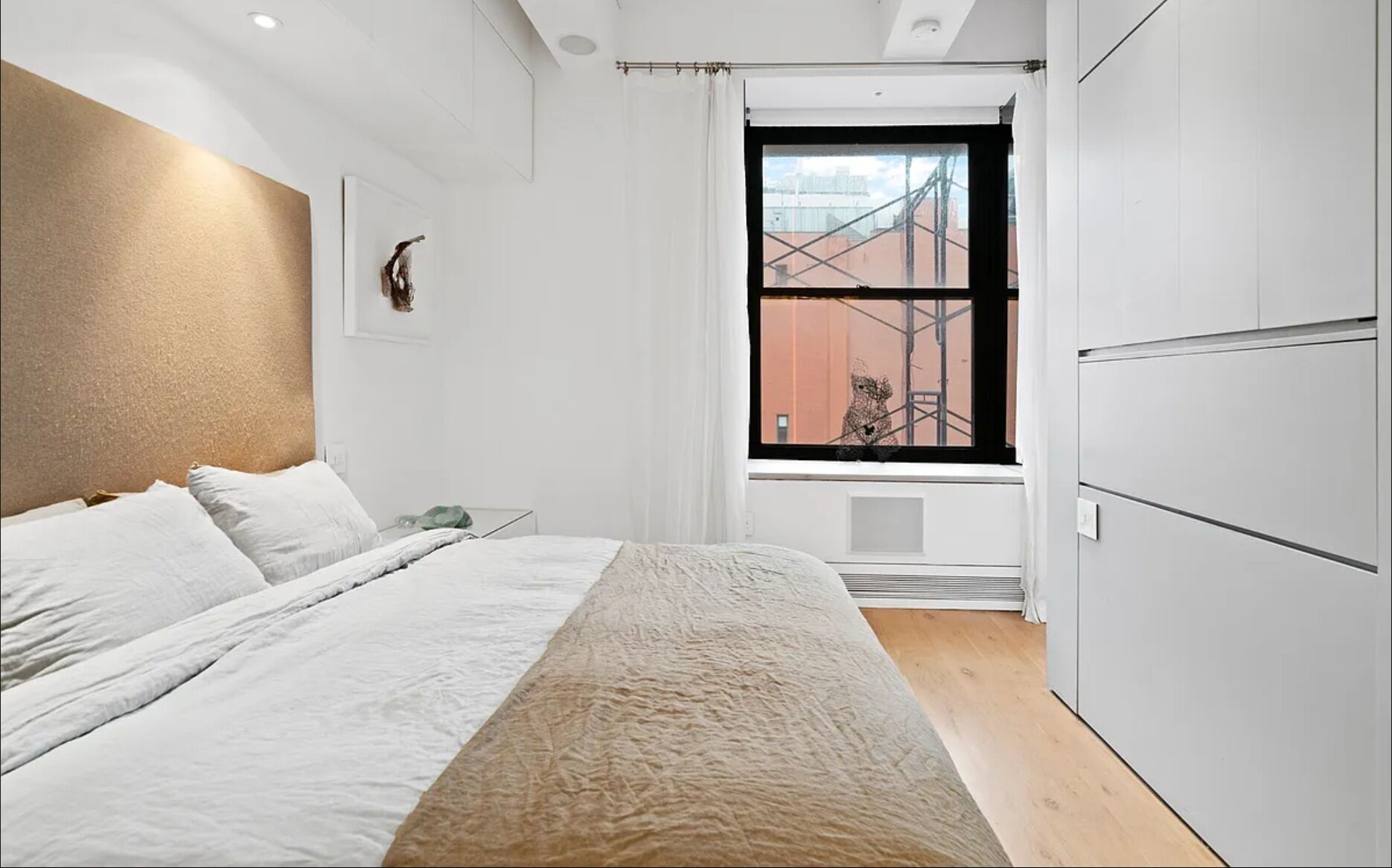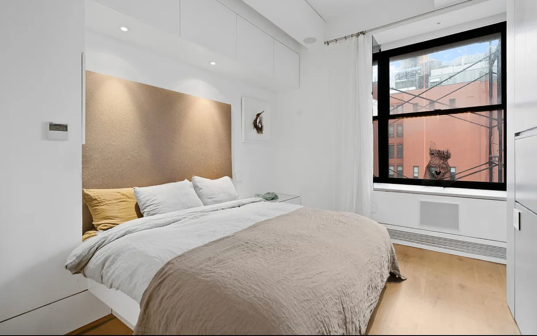 There is an interior guest room, and bath that are as soothing as a spa. Light boxes glow over and down the side of the Caesar Stone backlash and counter of the open kitchen, which is appointed with the highest end appliances: Wolf range and oven with recessed ventilation hood, and Wolf convectrion microwave; Fisher and Paykel two drawer dishwasher; Sub Zero refrigerator; wine cooler. In the living area, the capacious, built-in closets and storage spaces are so discreet that only slender handles betray their existence.. All shades are custom-designed by Smith and Noble. Other features include oversized Eletrolux washer-dryer. Duravit toilets, Heafle bathroom fixtures and hardware. The apartment has been upgraded to a 2 zone central air conditioner and Sonos system throughout.