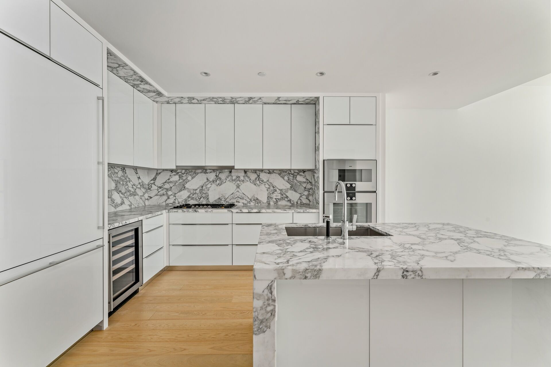 You will enjoy a custom Italian kitchen by Pedin, equipped with high-end Gaggenau appliances. The kitchen boasts polished chrome Dornbracht fixtures, fully-vented range hoods, a wine refrigerator, and a garbage disposal. Additionally, there is a fully-vented in-unit washer and dryer. Each bathroom is adorned with bespoke stone and wood cabinetry, providing a luxurious experience. The primary and secondary bedrooms both feature en-suite bathrooms, with the master bedroom also offering a spacious walk-in closet.