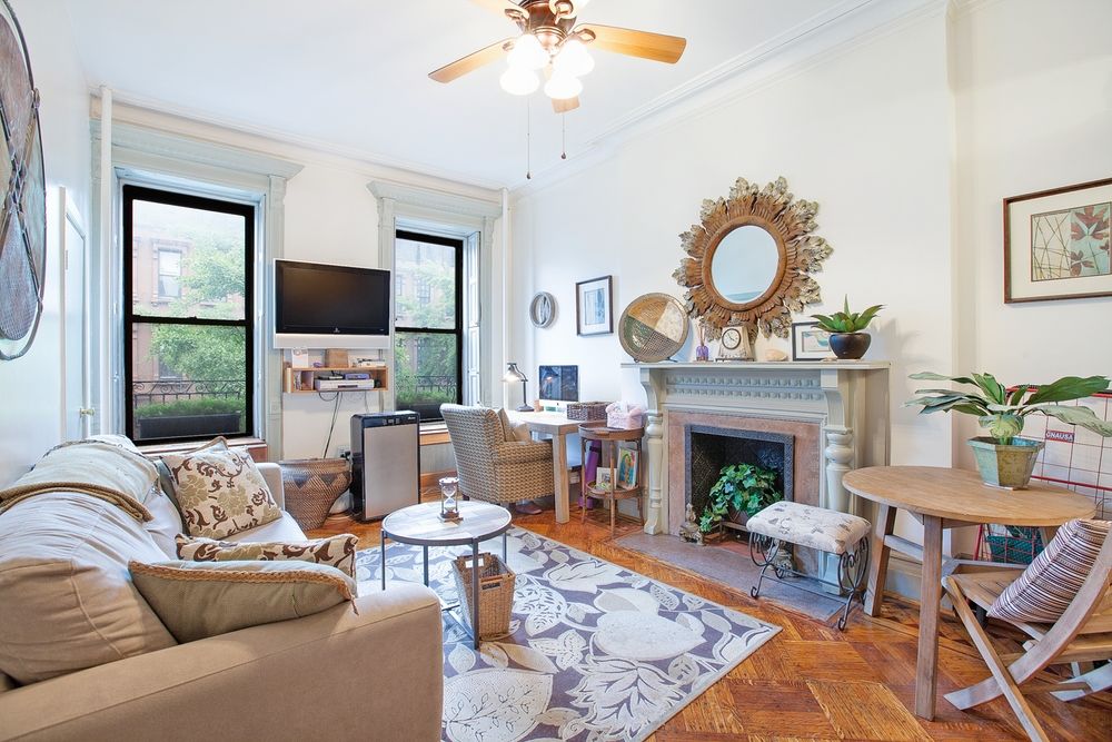 - A one-bedroom apartment with northern exposure, it has a full kitchen and bath, and a decorative fireplace with original details.