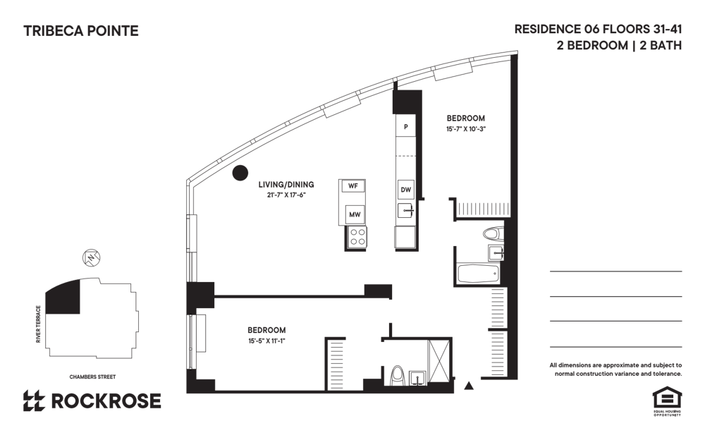 New to the market! Residence 3406 at Rockrose's Tribeca Pointe is a large corner two bedroom with floor to ceiling windows, open kitchen with dining alcove, large living room, ample closets, large bedrooms, and two full bathrooms.