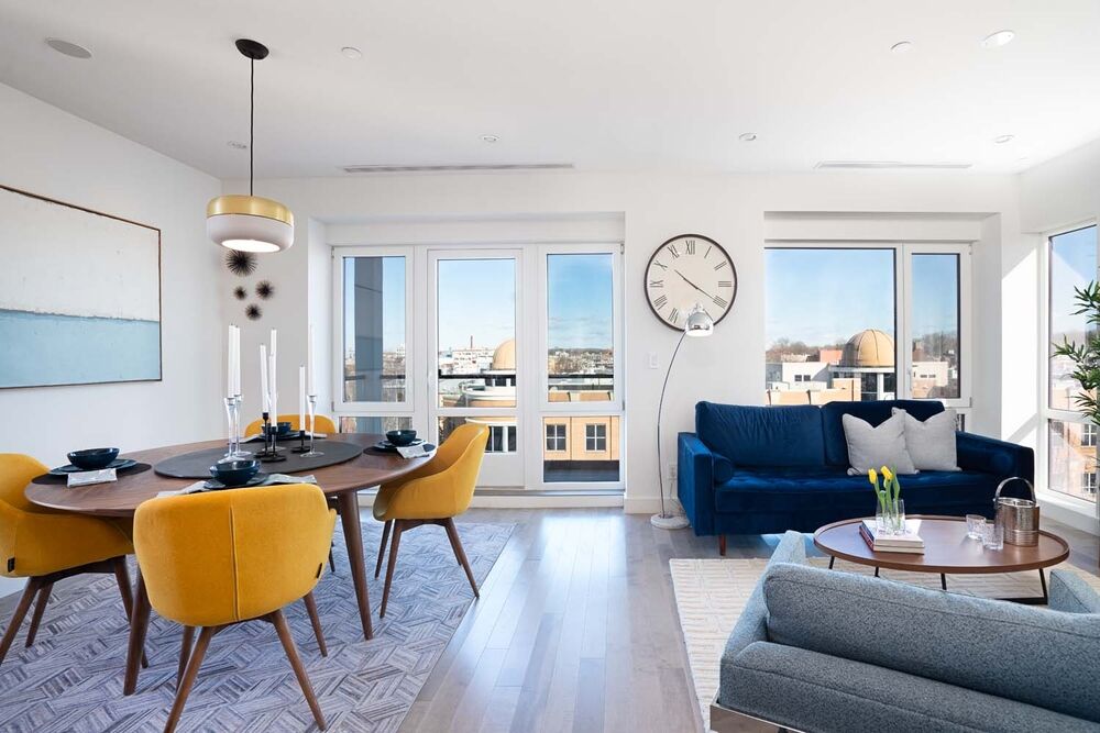 The dining area flows into the open LIVING ROOM . Floor to ceiling windows with double exposure gives an airy feeling to the living space. There is also a lovely gallery wall for hanging your art.