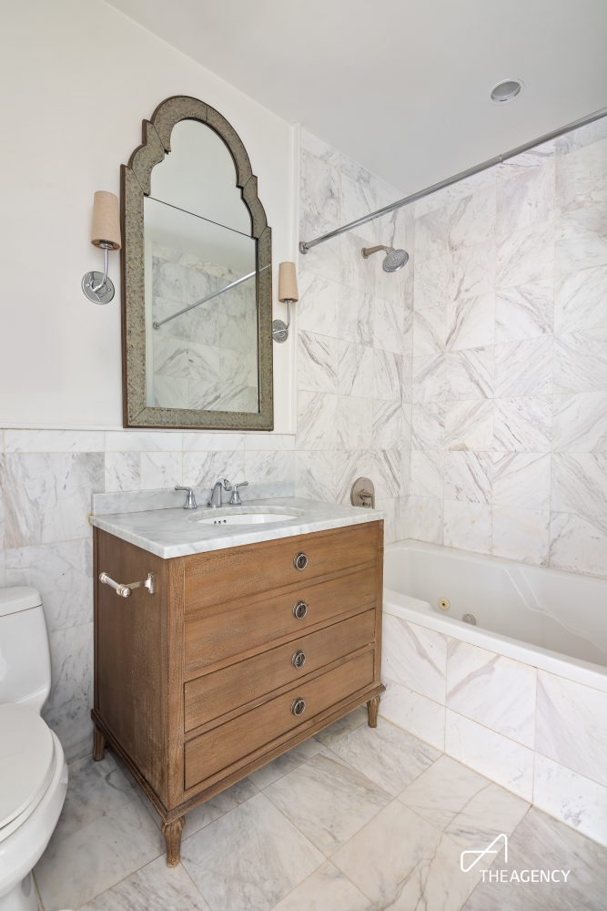 The primary suite offers ample space, including a walk-in closet, a dedicated dressing and makeup area, and an en-suite marble bathroom with an oversized Jacuzzi tub. Additional features include California Closets, Restoration Hardware light fixtures, Nest thermostats for the central air system, a vented LG washer/dryer, and whitewashed hardwood floors.
