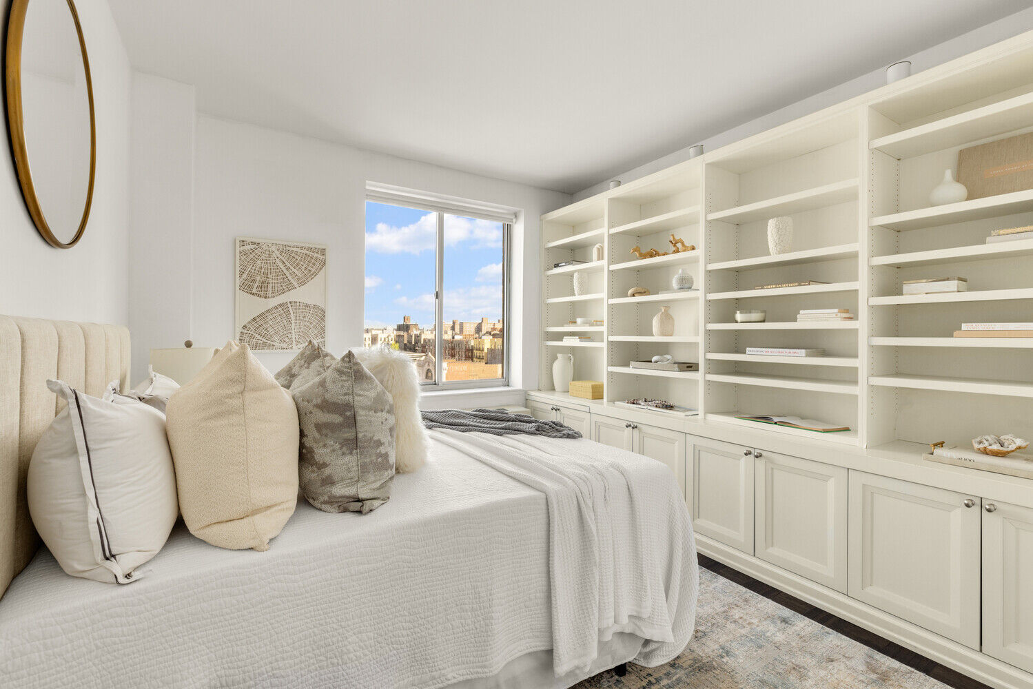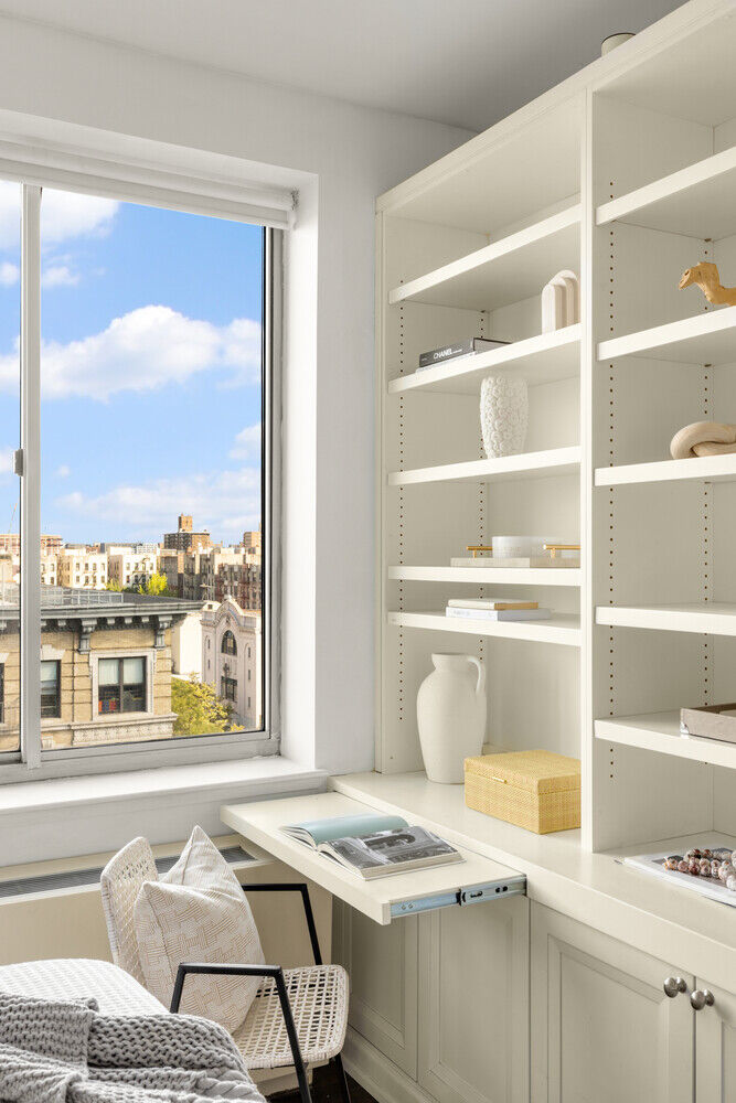The generous bedroom is a true retreat, featuring a full wall of custom built-ins with integrated wiring and a cleverly designed pull-out desk. A blackout roll-up shade ensures restful sleep, while the walk-in closet - also outfitted by California Closets - maximizes storage space with a smart, efficient design.