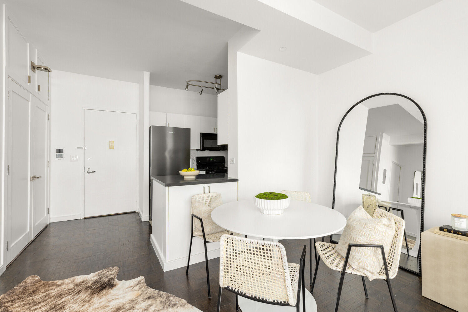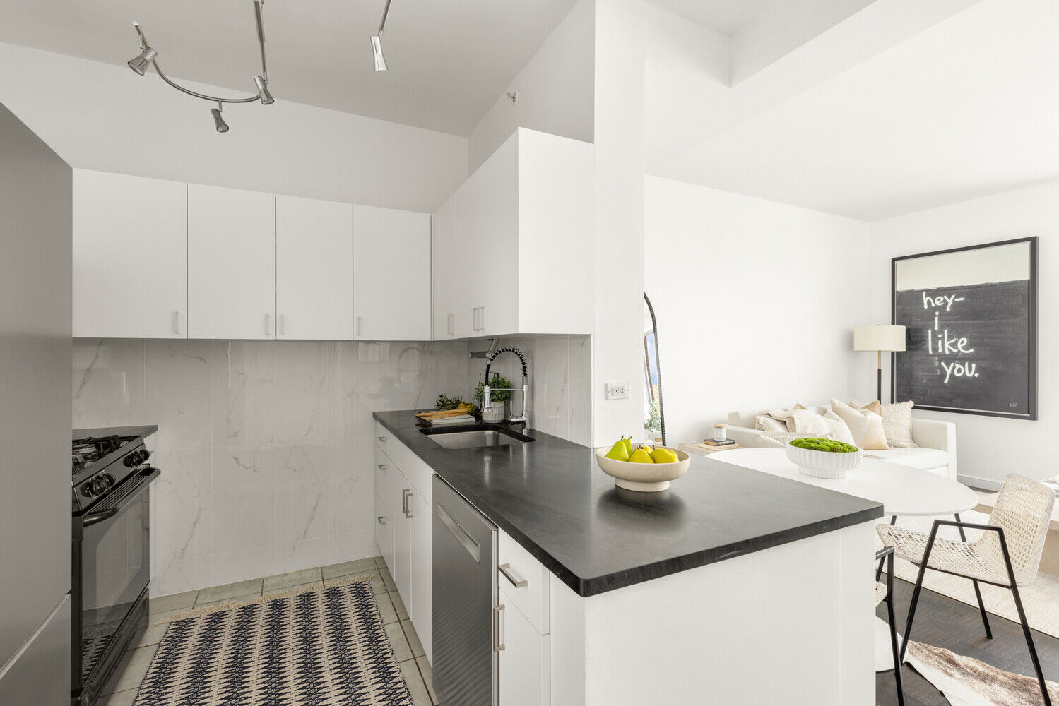 The kitchen was fully refreshed with custom white cabinet faces, modern hardware, expanded wraparound cabinetry for additional storage, a sleek porcelain tile backsplash, custom under-counter cabinetry in the living room, and brand-new LED lighting. The recently updated refrigerator and dishwasher add to the kitchen's functionality and appeal.