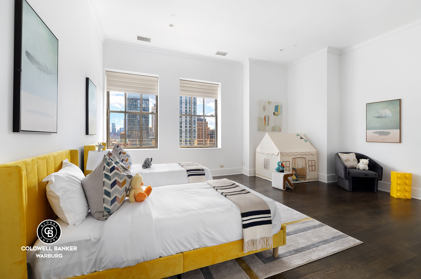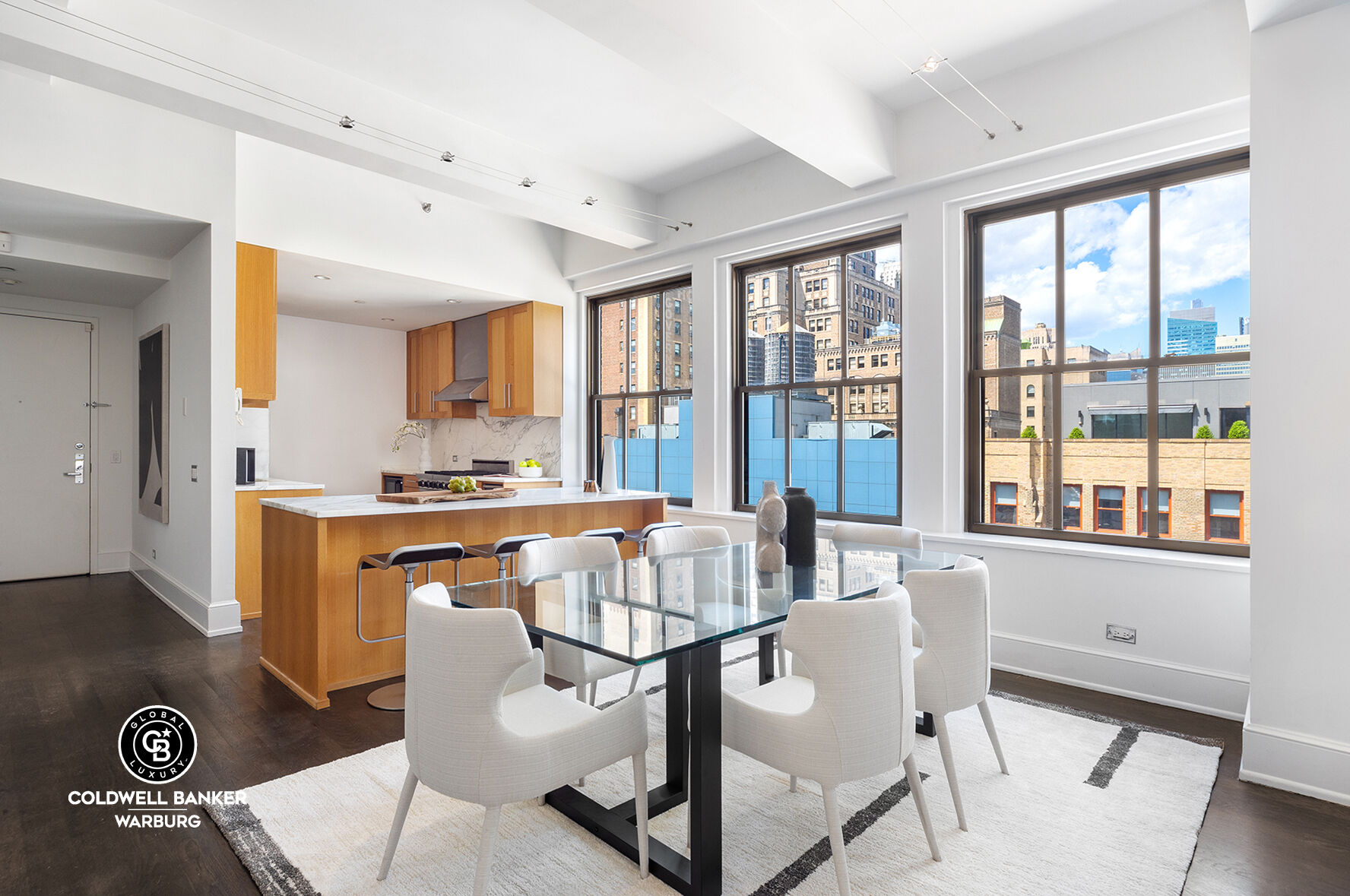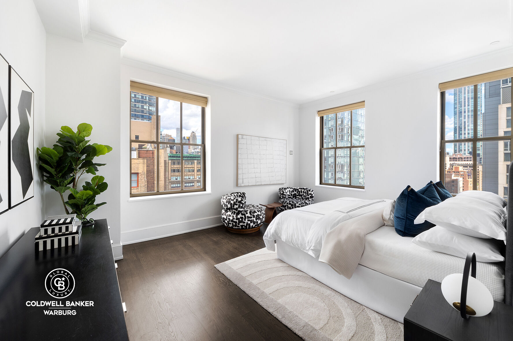 This expansive residence, spread across the 19th and 20th floors, offers nearly 3,000 square feet of luxury living. The home features 11-foot beamed ceilings and exposures to the north, south, and east, filling it with natural light. The primary suite includes a corner bedroom, central air, a state-of-the-art lighting system, in-unit washer/dryer, abundant closet space, and a charming terrace with northward city views. The 45-foot living and dining area is lined with a wall of north-facing windows, creating a perfect space for entertaining. A spacious chef's kitchen complements the layout with custom white oak cabinetry, Calacatta marble finishes, a dining island, and high-end stainless steel appliances, including a Sub-Zero refrigerator, Viking stove, Miele dishwasher, and a wine fridge.