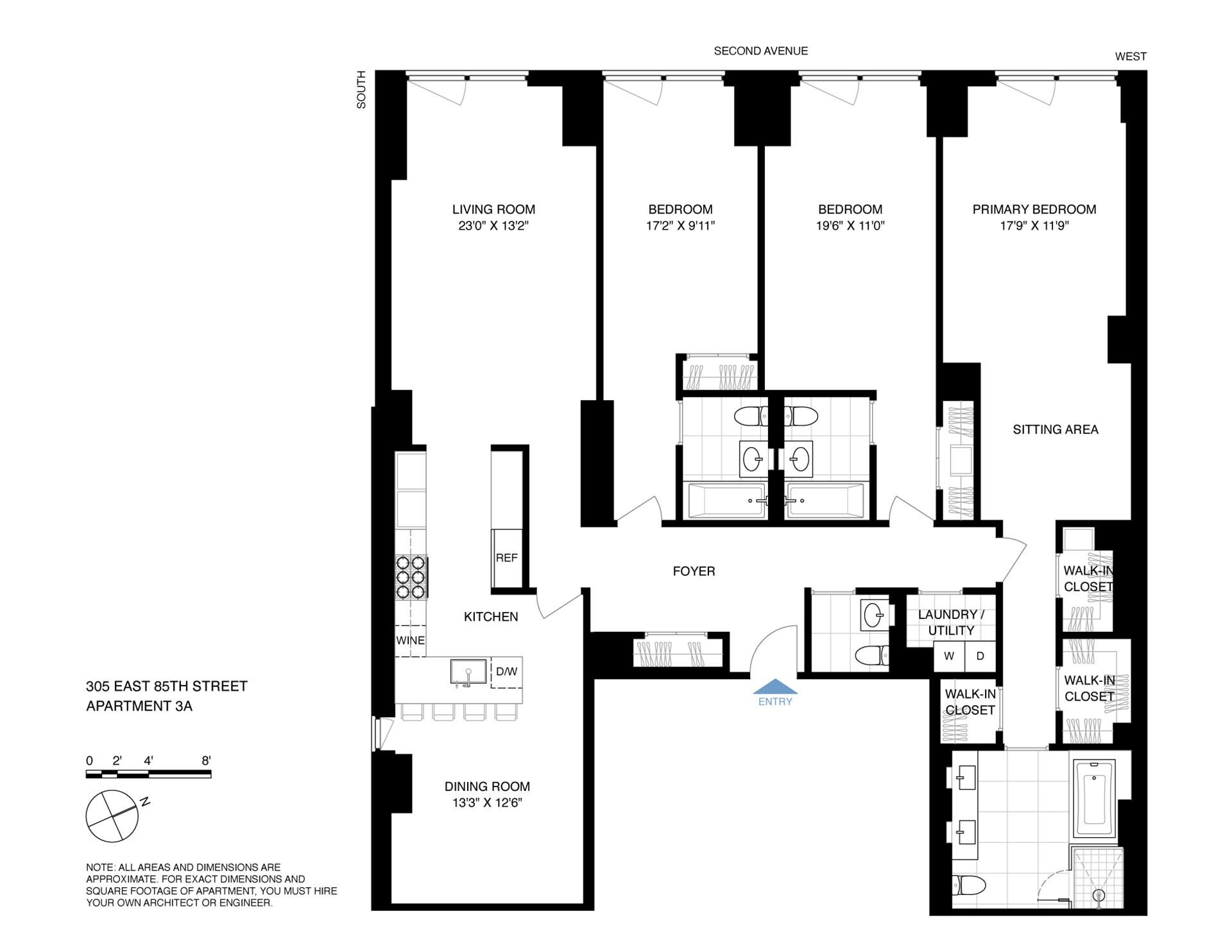 Apartment 3A is a bright, sprawling 2,349 square foot 3 bedroom home with 3.5 baths. A gracious entrance gallery leads to a generous sized living room.