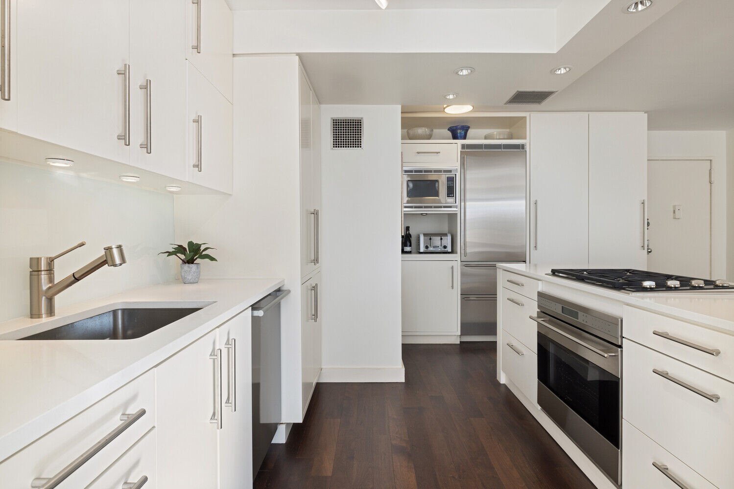 The expansive open-concept kitchen is a chef's dream featuring sleek white custom cabinetry including a closet and a pantry, a white glass backsplash, Caesarstone countertops and premium stainless-steel appliances including a Sub-Zero refrigerator, Wolf gas range and oven, Miele dishwasher and KitchenAid microwave. Rarely found in a NYC one-bedroom apartment, this kitchen is both functional and elegant, ideal for culinary enthusiasts.