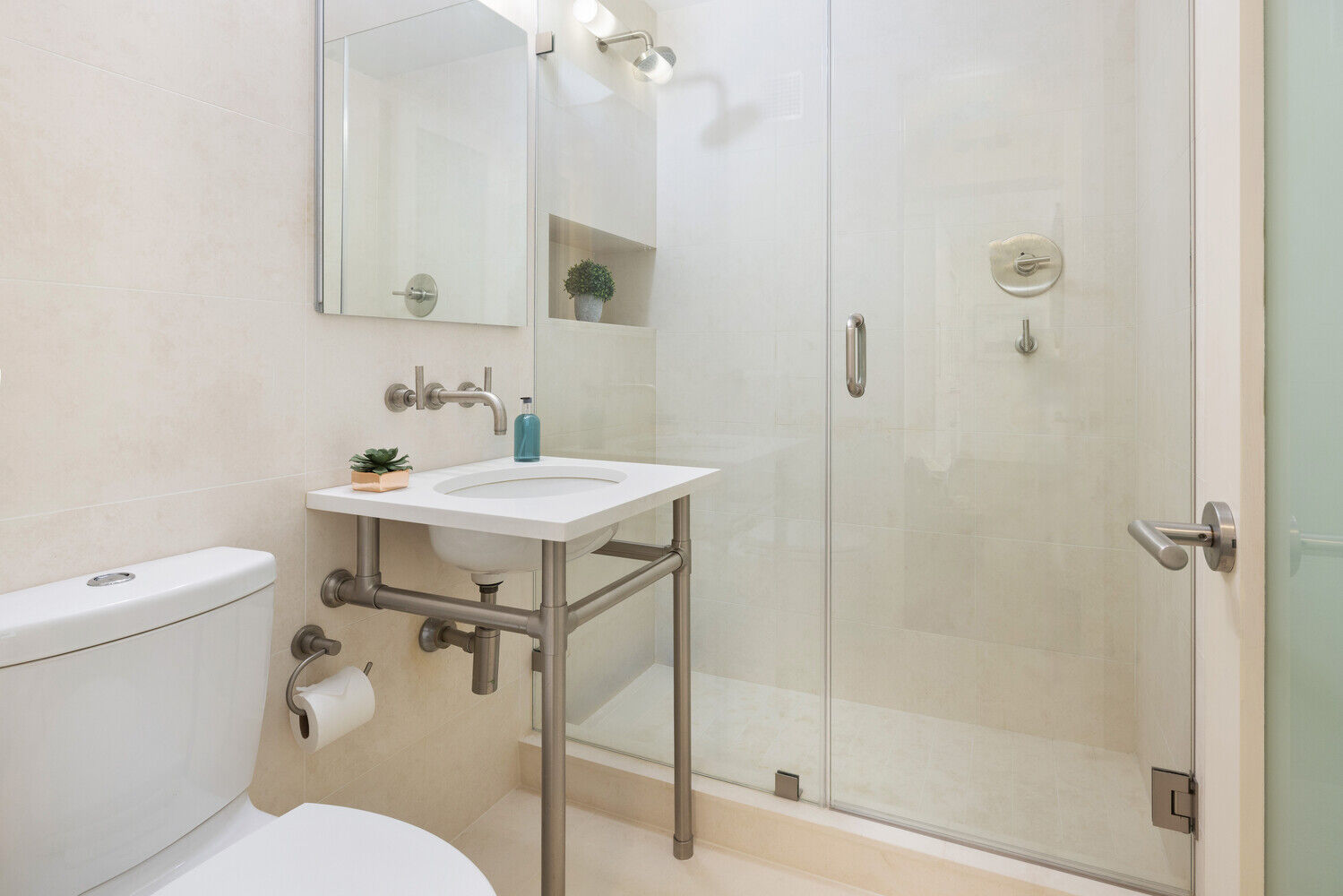Completing this exceptional home is a luxurious marble and limestone bathroom equipped with a Toto toilet, wall-mounted faucet, Infinity shower drain, and one of the distinctive highlights is a double depth Robern flush medicine cabinet, linen closet, and finally, a tailored wood door with white glass.