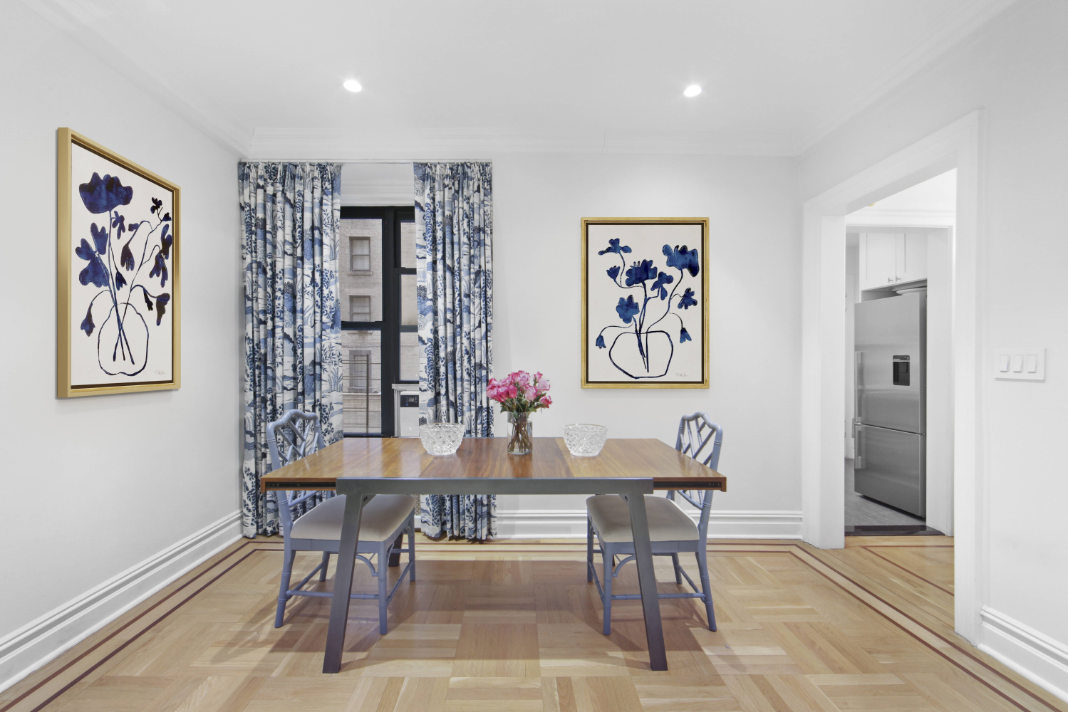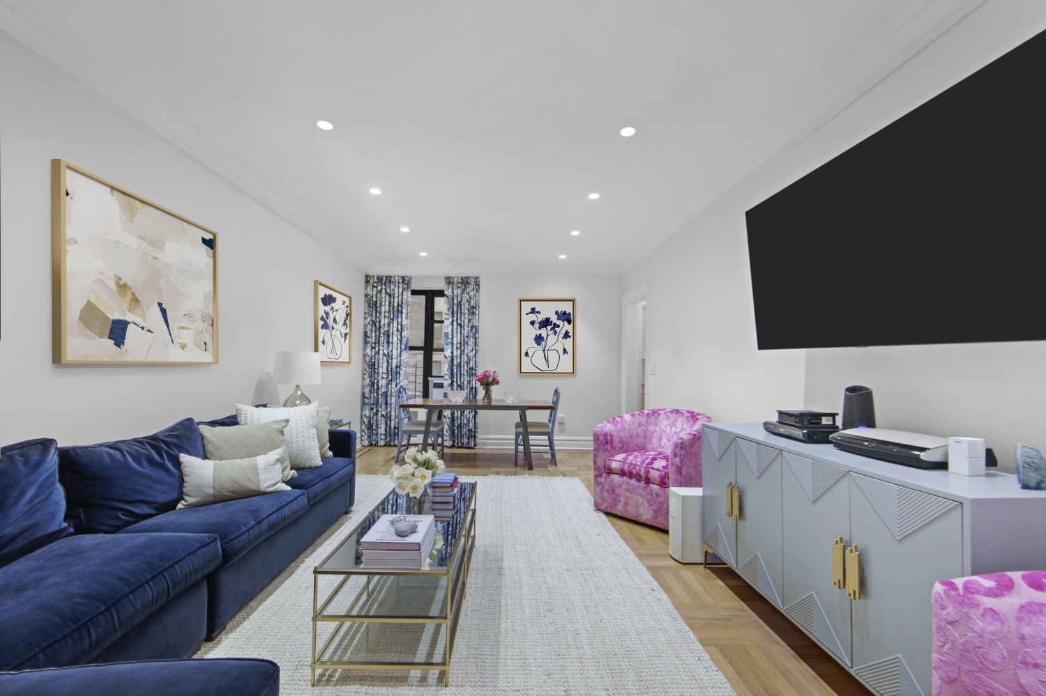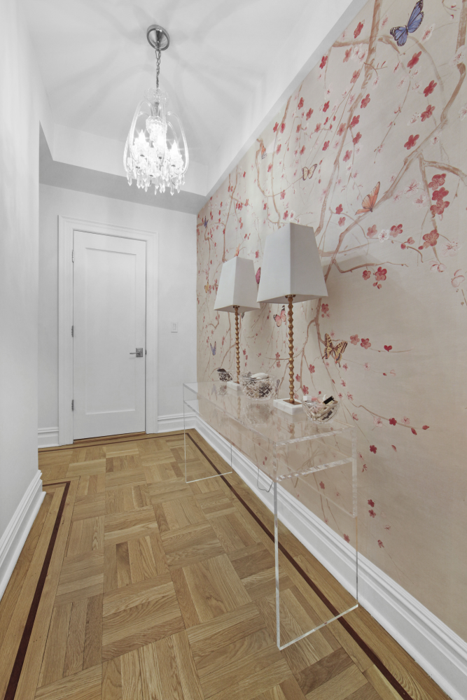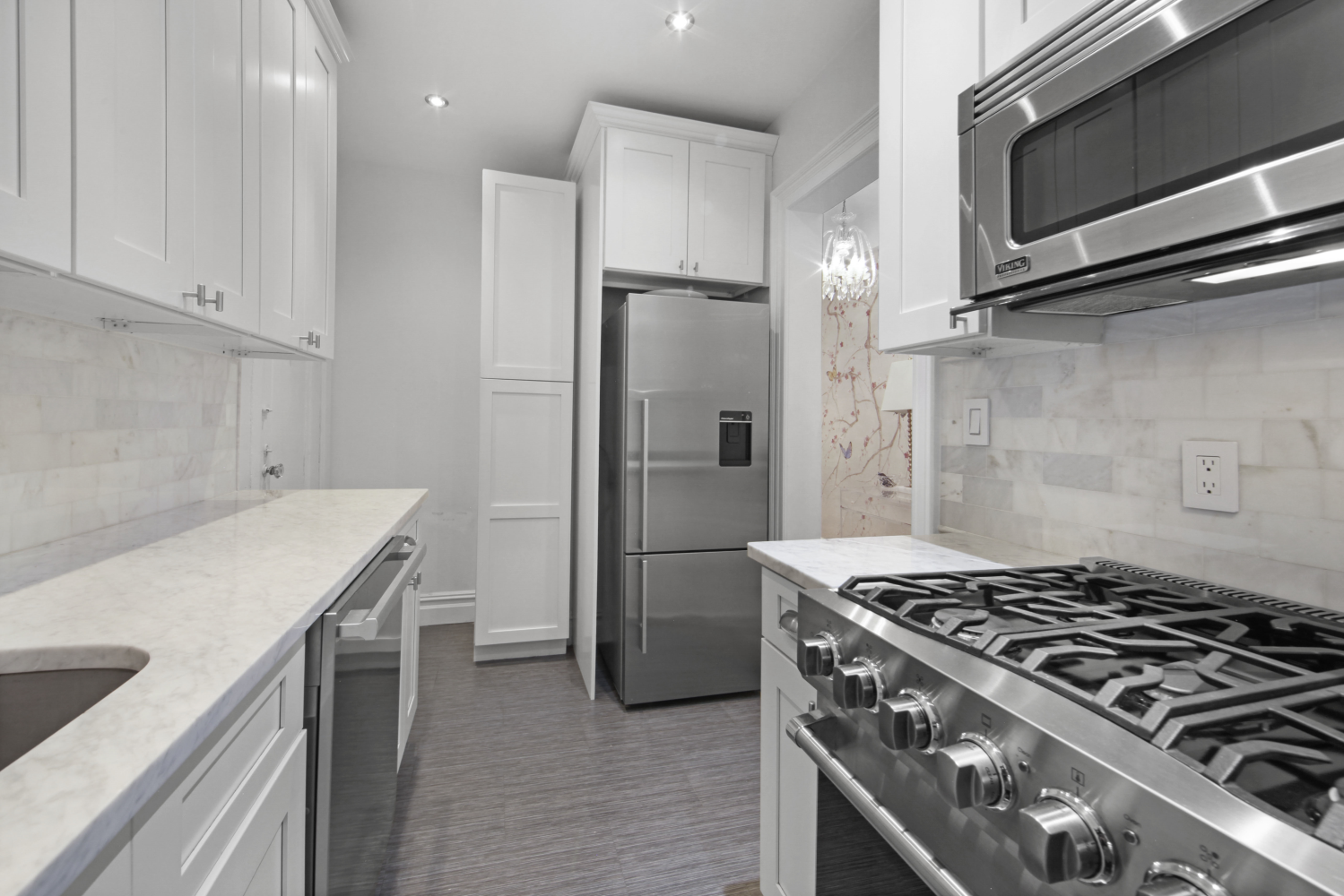 The newly-renovated kitchen boasts sleek countertops, ample cabinet space, and modern appliances such as a Viking stove, Miele dishwasher, and a Fisher and Paykel refrigerator. The expansive living room offers ample space for a large lounge area and for a dining table and chairs.