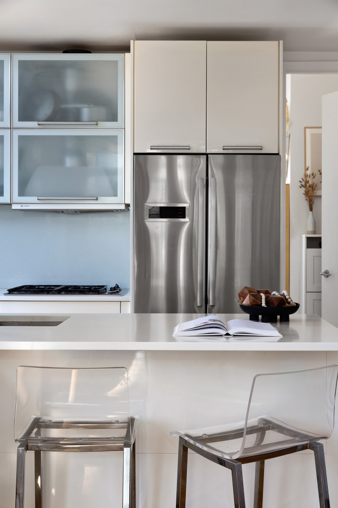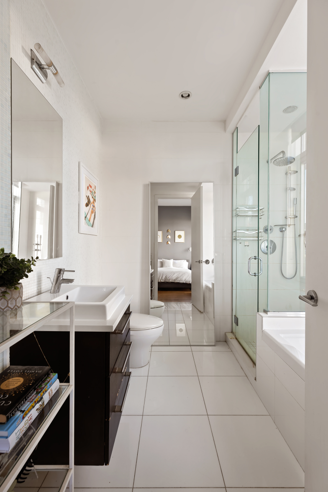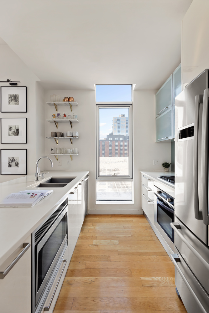 This corner unit is filled with natural light from three directions and features an airy living and dining area, a sleek kitchen with high-end appliances and elegant hardwood floors throughout. The primary bedroom has direct access to a northeast-facing terrace, while the second bedroom offers floor-to-ceiling windows. Both bathrooms include soaking tubs and modern tilework, creating a spa-like retreat. Additional conveniences include an in-unit LG washer and dryer.