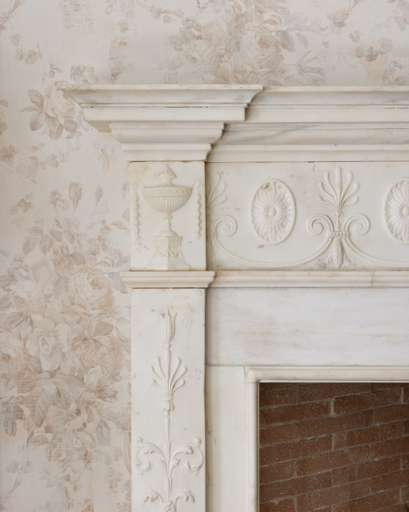 Residents arrive on a private elevator landing leading to a remarkable gallery with marble floors, a built-in wall mirror, a powder room, and a sensuously curving staircase. Double doors reveal formal living and dining rooms and a stately library with wood-paneled walls, built-in shelves, and a wood-burning fireplace with an ornate mantel. All three spaces are ideal for grand entertaining and intimate gatherings.