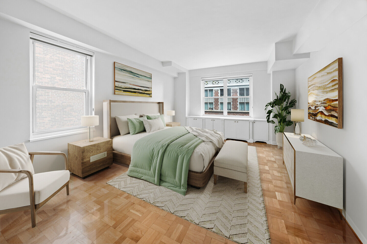 A hallway with an additional large closet leads you to the oversized primary bedroom, which is graced with northern and western exposures over a tranquil view of 41st street.