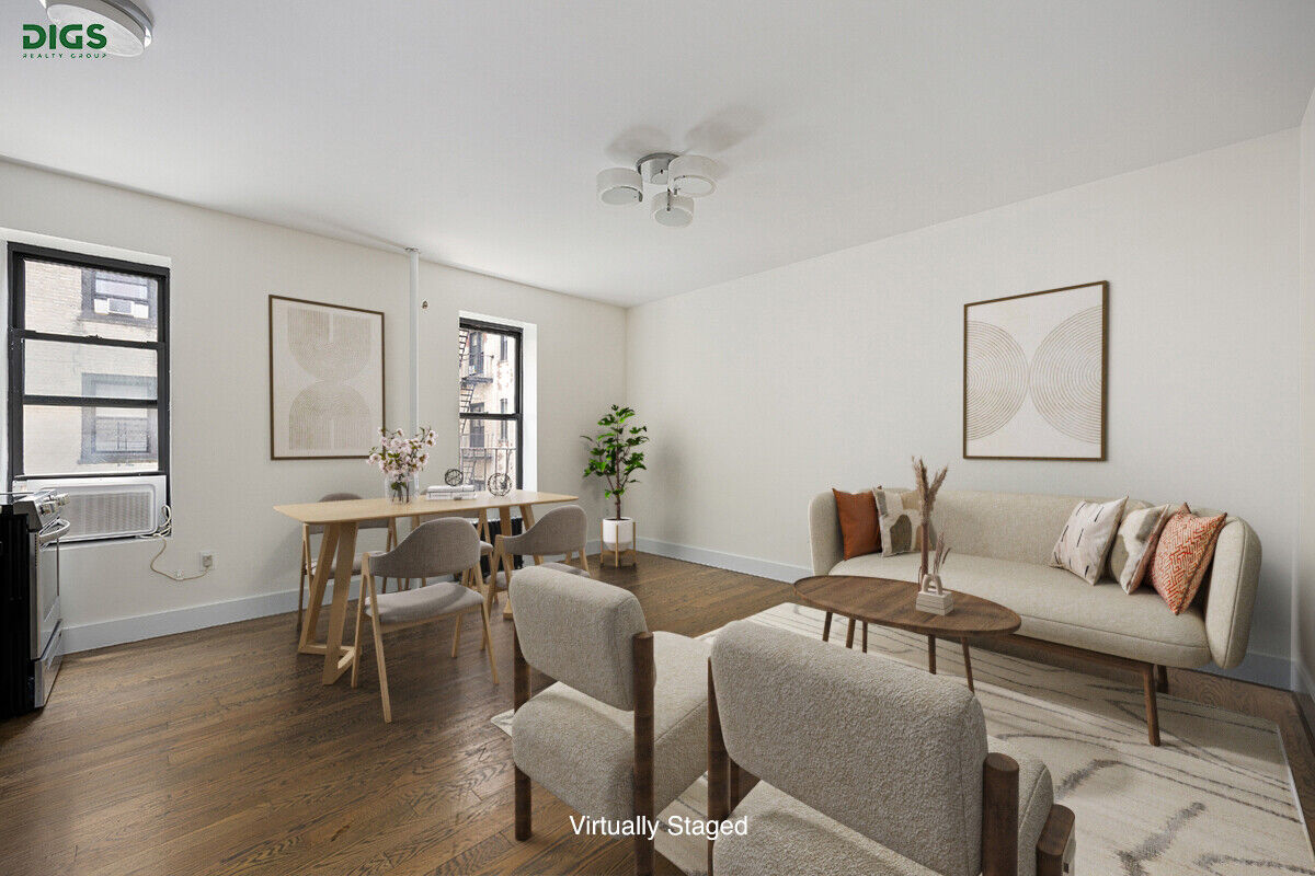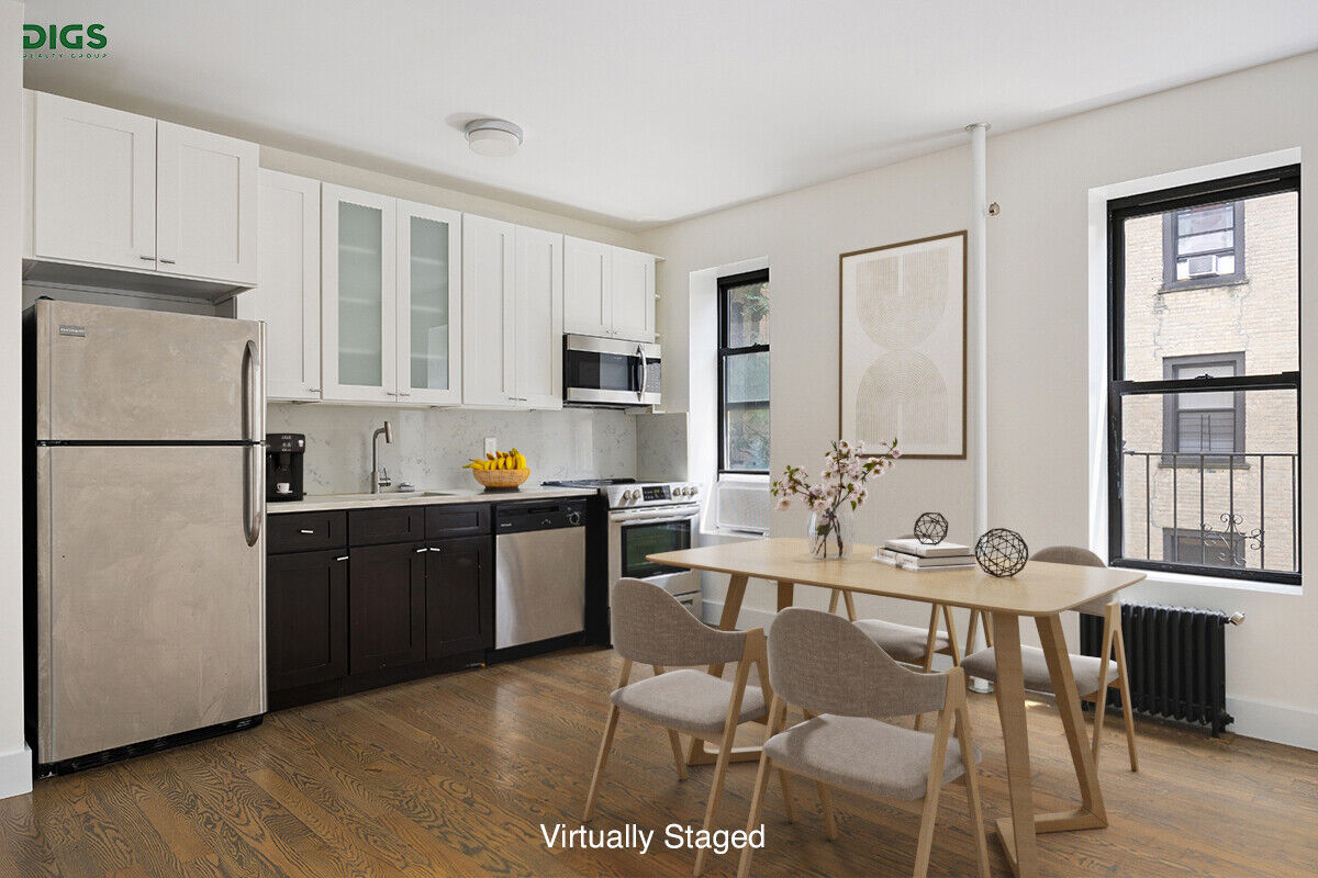 The interiors feature oak hard wood floors throughout, an open plan living and dining room, a kitchen equipped with well-appointed cabinetry and stainless-steel appliances and a modern bathroom. Both bedrooms are generously sized, bathed in natural light, and offer tranquil garden views. Impeccably maintained and thoughtfully updated, this home is turnkey and move-in ready, offering an effortless transition into a coveted Brooklyn lifestyle.