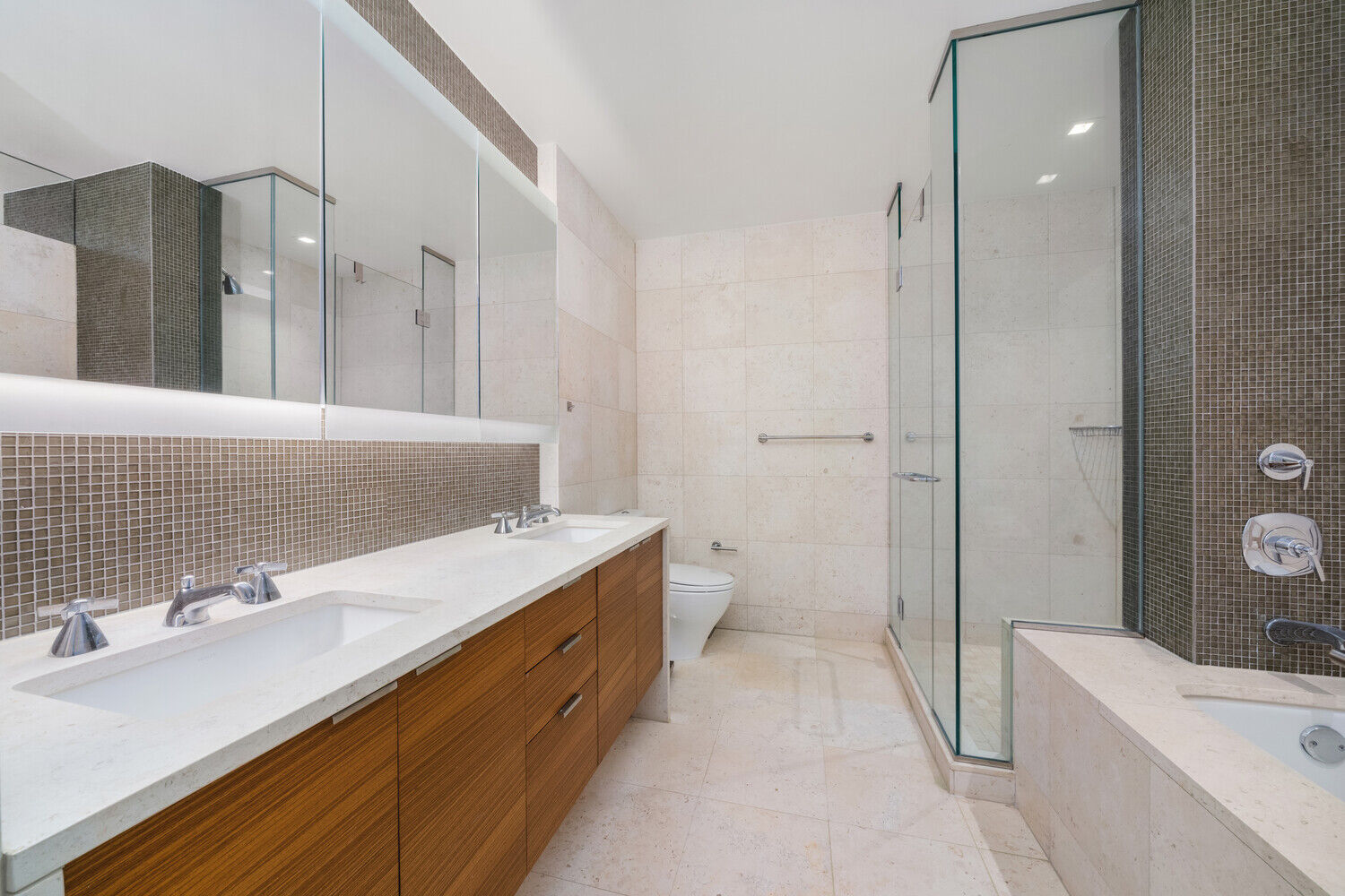 All bedrooms are fitted with ample custom California Closets and automated solar shades. The primary suite includes an en suite spa bath wrapped in marble, featuring a deep soaking tub, separate glass-enclosed shower, and oversized double vanity. The secondary bedrooms are equally generous, offering excellent light and open views of the historic Financial District.