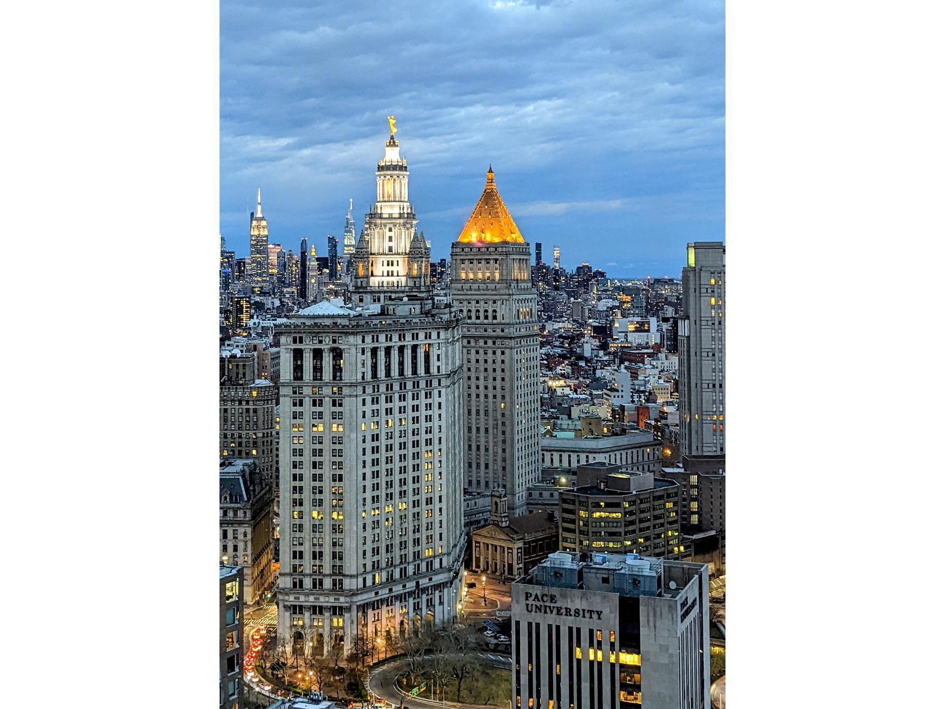 Residence 38A is a corner 1 bed, 1 bath featuring soaring 10-foot ceilings and oversized arched windows encased with elegant bronze detailing, perfectly framing sweeping views of the New York City skyline.