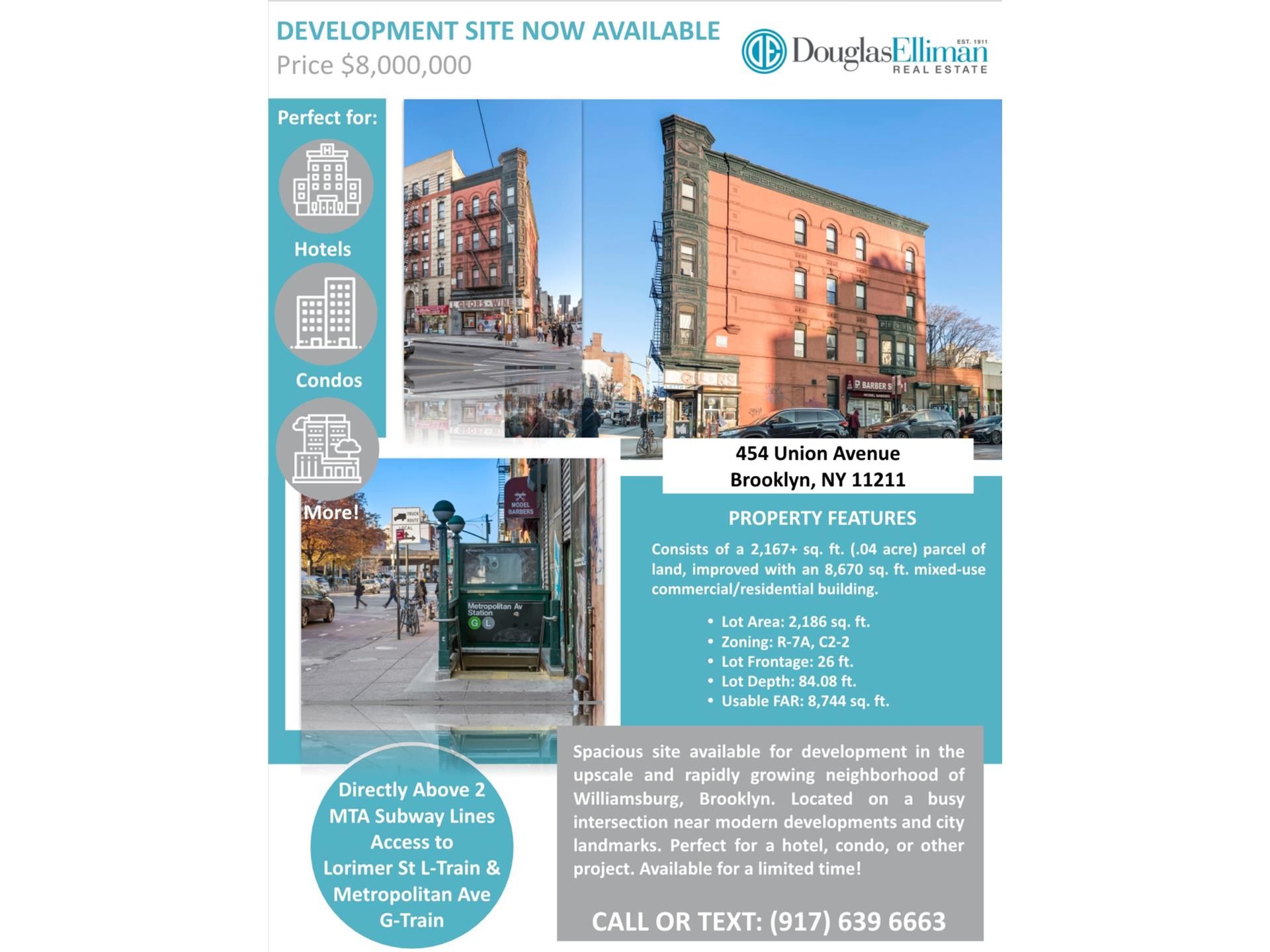 Profuse in prime value, rare corner lot in the heart of Williamsburg.Above the Lorimer L-Train/Metropolitan G-train station.Pre-value-add with sky-high potential, literally.Delivering the property with the residential units vacant is negotiable. Pro-forma apartment mix reconfigurations yield up to an additional $275,000 of annual income. Offering top-of-the-market sidewalk-level retail frontage that commands an estimate of $60 per square foot/per year. Bonus income streams include roof space for a cell tower and ample exterior for high-value advertisements.The basement shares a wall with the G/L subway train concourse. Subterranean retail space can possibly be installed. Air rights included with a value of 2,536 unused buildable square feet. The maximum usable floor area of building equals 8,744 square feet. Lot Area: 2,186 square feetLot Dimensions: 26 feet x 84 feetAnnual Taxes: $14,870Qualified Opportunity ZoneVirtual Tour Available Upon RequestDisclaimer: This property description contains projections, property enhancements and analyses that are all for informational purposes only.