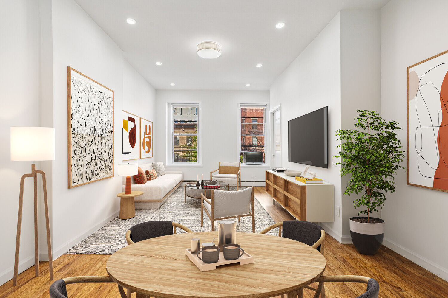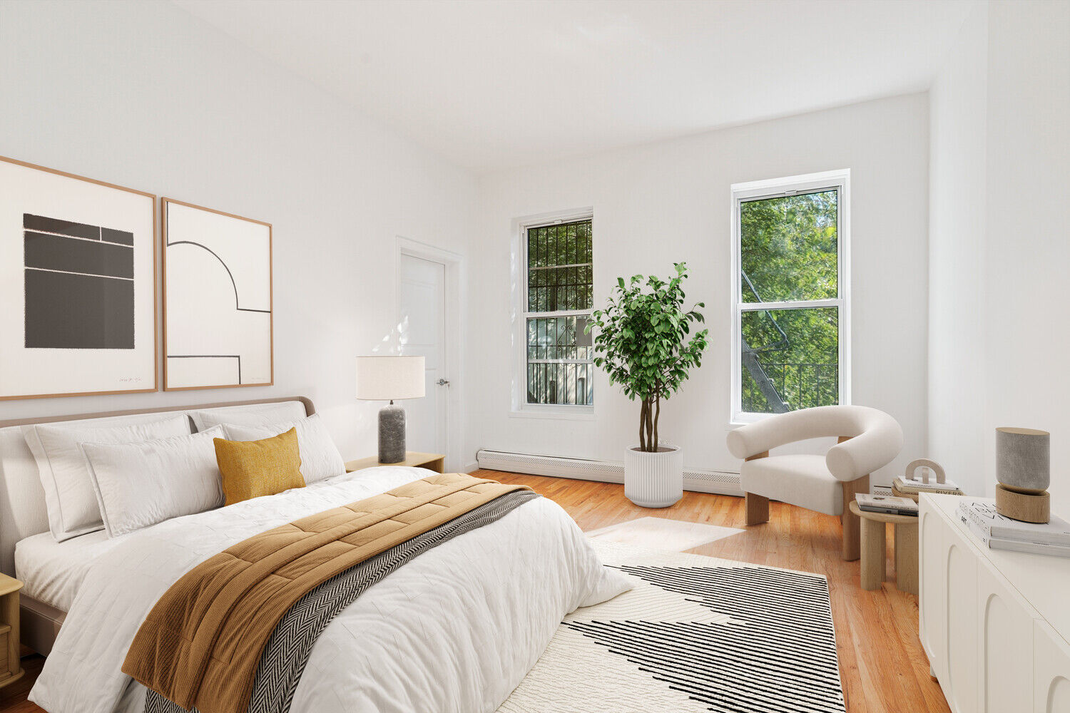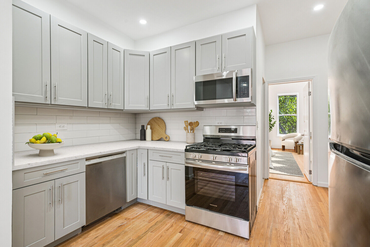 Step inside to find an expansive, sun-splashed living room and open-concept kitchen that creates a seamless setting for both everyday living and effortless entertaining. The kitchen is outfitted with brand new premium appliances including a Frigidaire oven with gas range, microwave, refrigerator, and Bosch dishwasher. Sleek cabinetry and generous quartz countertops make this space as functional as it is stylish. High ceilings and beautiful hardwood floors run throughout the home, adding warmth and character.