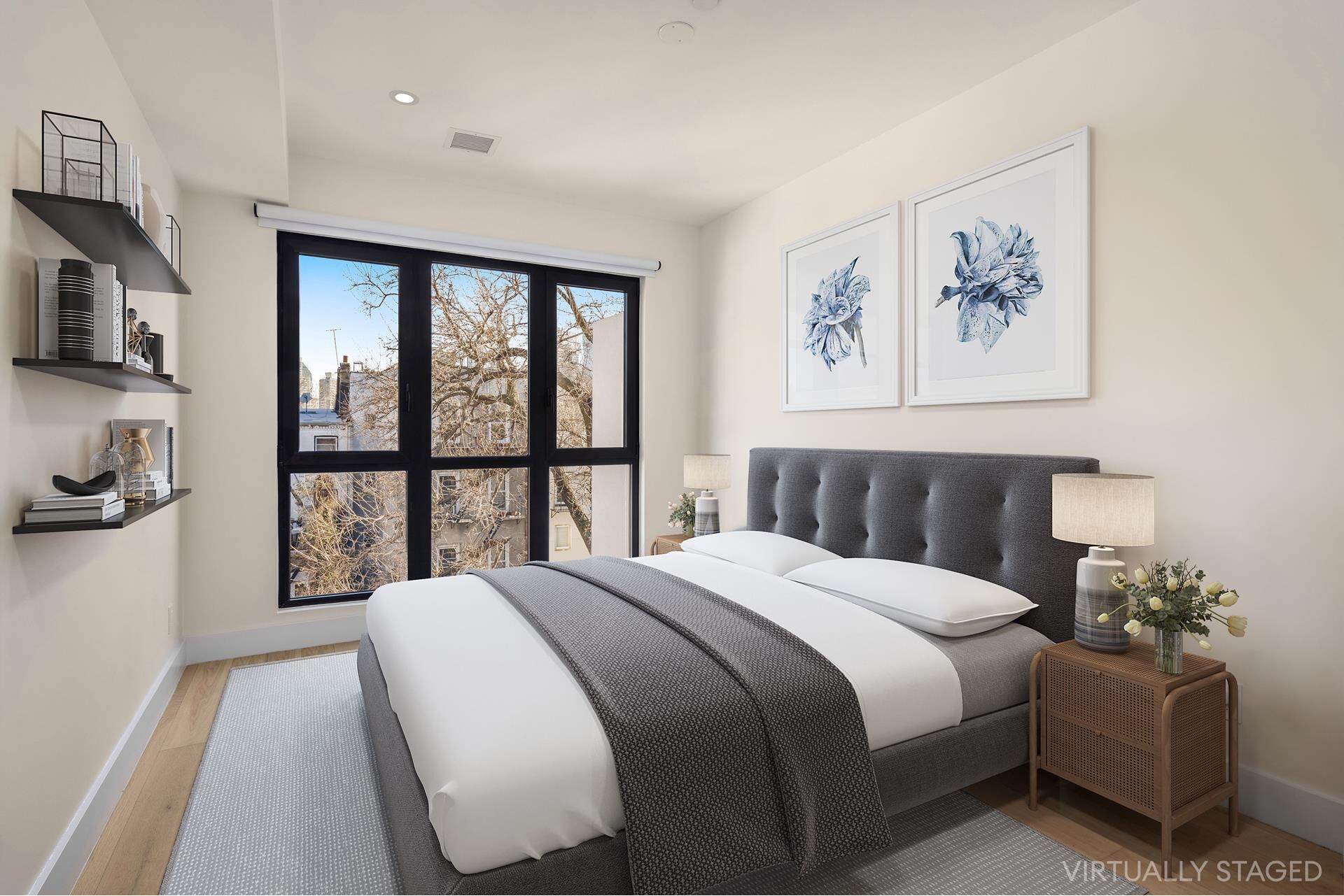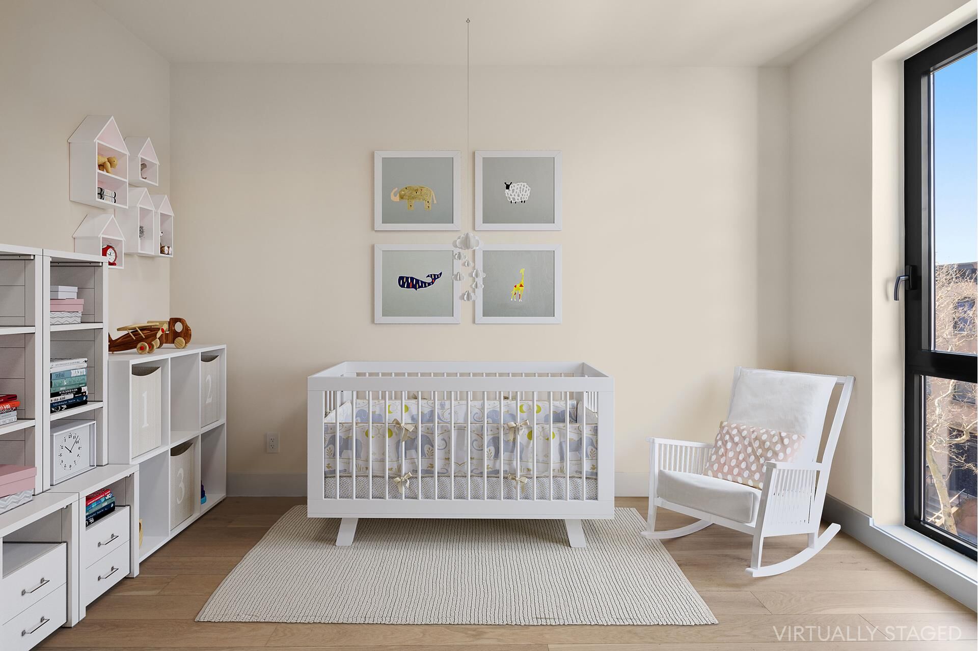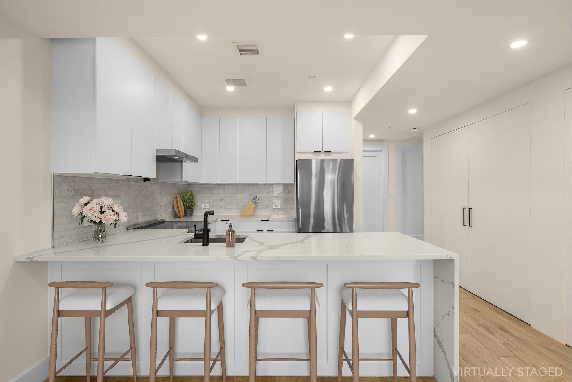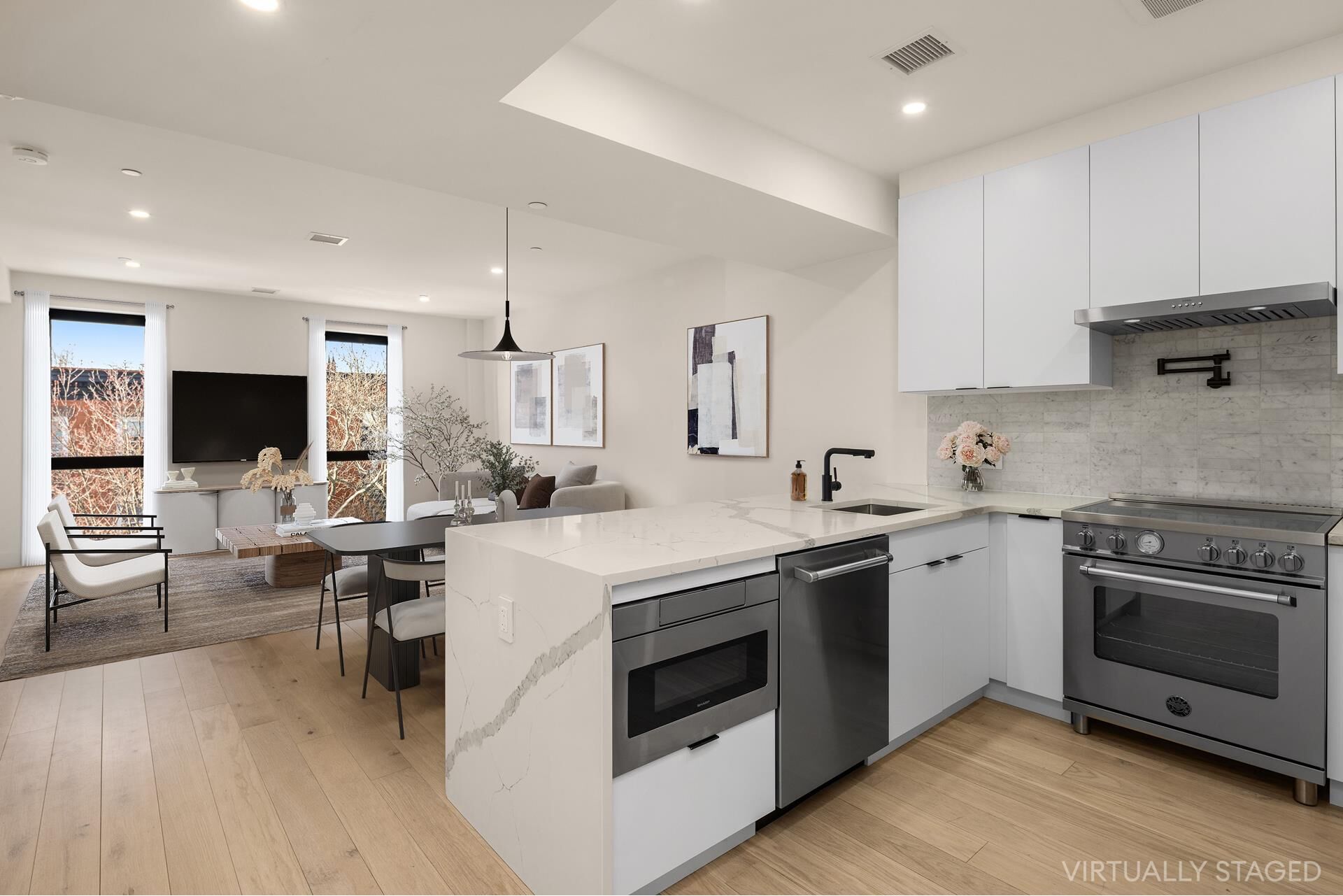 Upon entrance, the nearly 1,200 square foot interior greets you with wide-plank white oak flooring and impressively tall ceilings. Thanks to a generous twenty-five feet of frontage and southern exposure, the living/dining area boasts ample space and natural light perfect for both relaxation and entertaining. Behind a set of pocket doors is the first of three bedrooms that can easily accommodate a kid's room. The open chef's kitchen impresses with custom cabinetry, marbled subway tile, and waterfall quartz countertops. Elevated Bertazzoni and Bosch appliances include a sleek range with pot-filler, refrigerator, dishwasher, and microwave warming drawer. Just off the kitchen, find a convenient pantry as well as a built-out laundry closet sporting a stacked washer-dryer.
