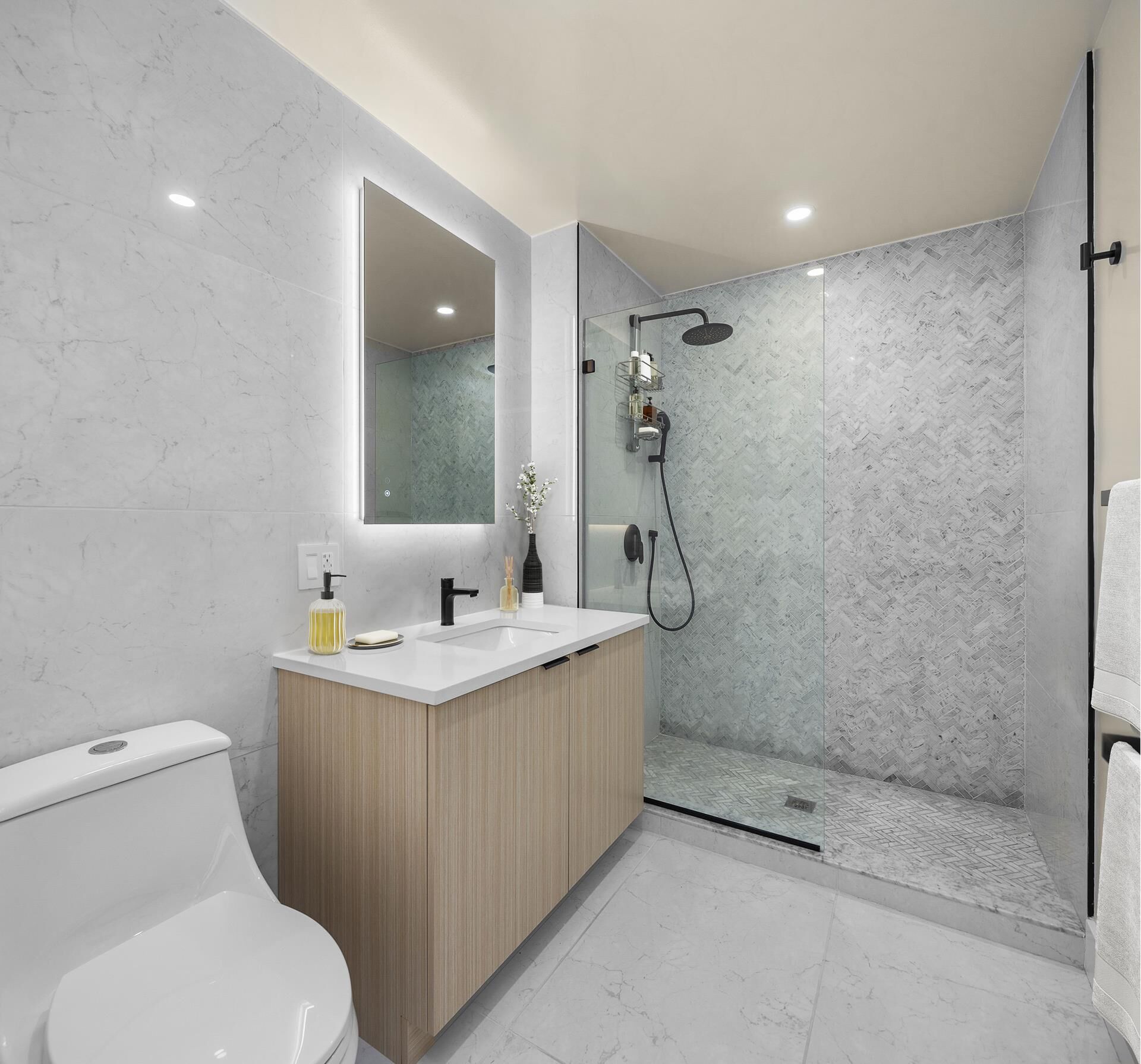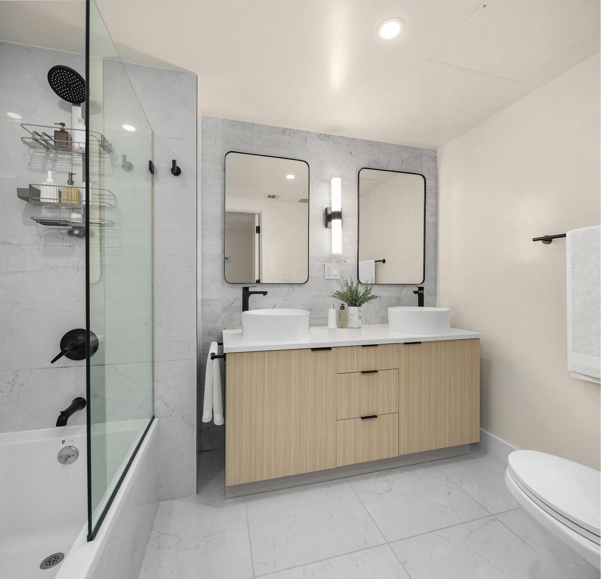 Primary and secondary bedrooms are back-facing for optimal peace and privacy. The main suite boasts a king-sized layout, motorized solar shades, two large built-out closets with custom lighting and a private balcony perfect for morning coffee. The en-suite bathroom includes marble tile, a white oak vanity, and a relaxing walk-in shower with a glass partition and gorgeous herringbone tile. The secondary bedroom features oversized windows and accommodates a king-size bed comfortably. It also has easy access to the second full bathroom with a soaking tub and dual sinks.