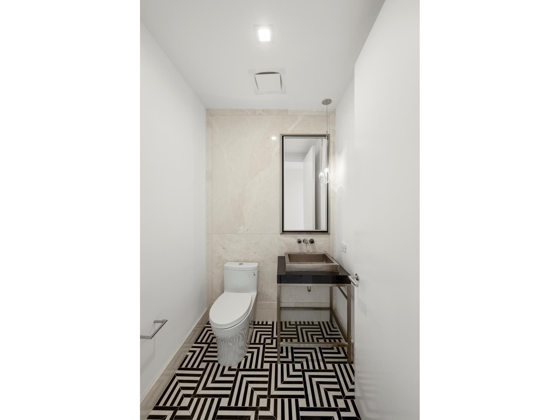 A glamorous powder room sparkles with a custom Vanilla Pearl and Saint Laurent marble mosaic floor, a hammered-metal sink, Murano glass handles, and a bespoke glass pendant light.
