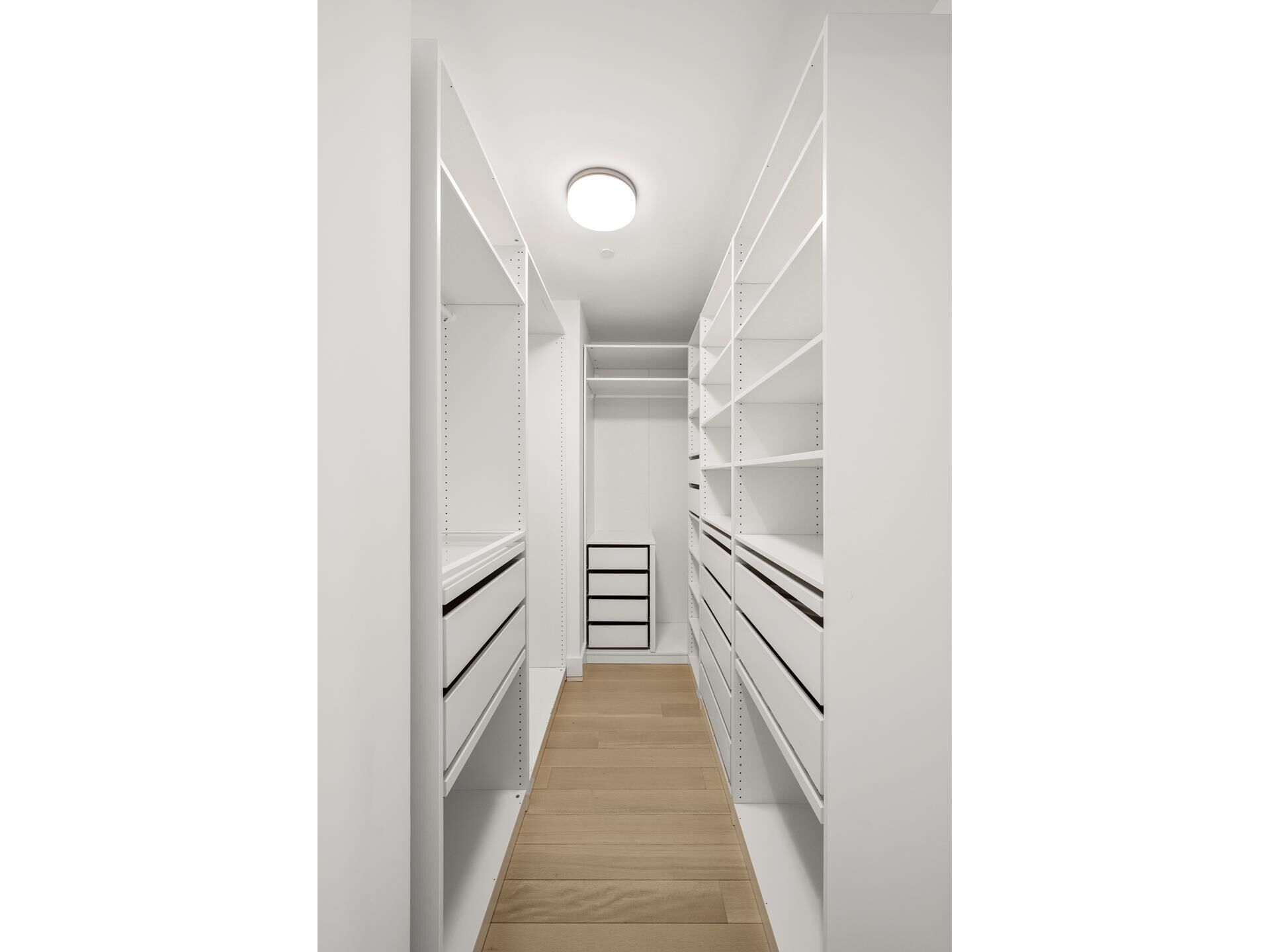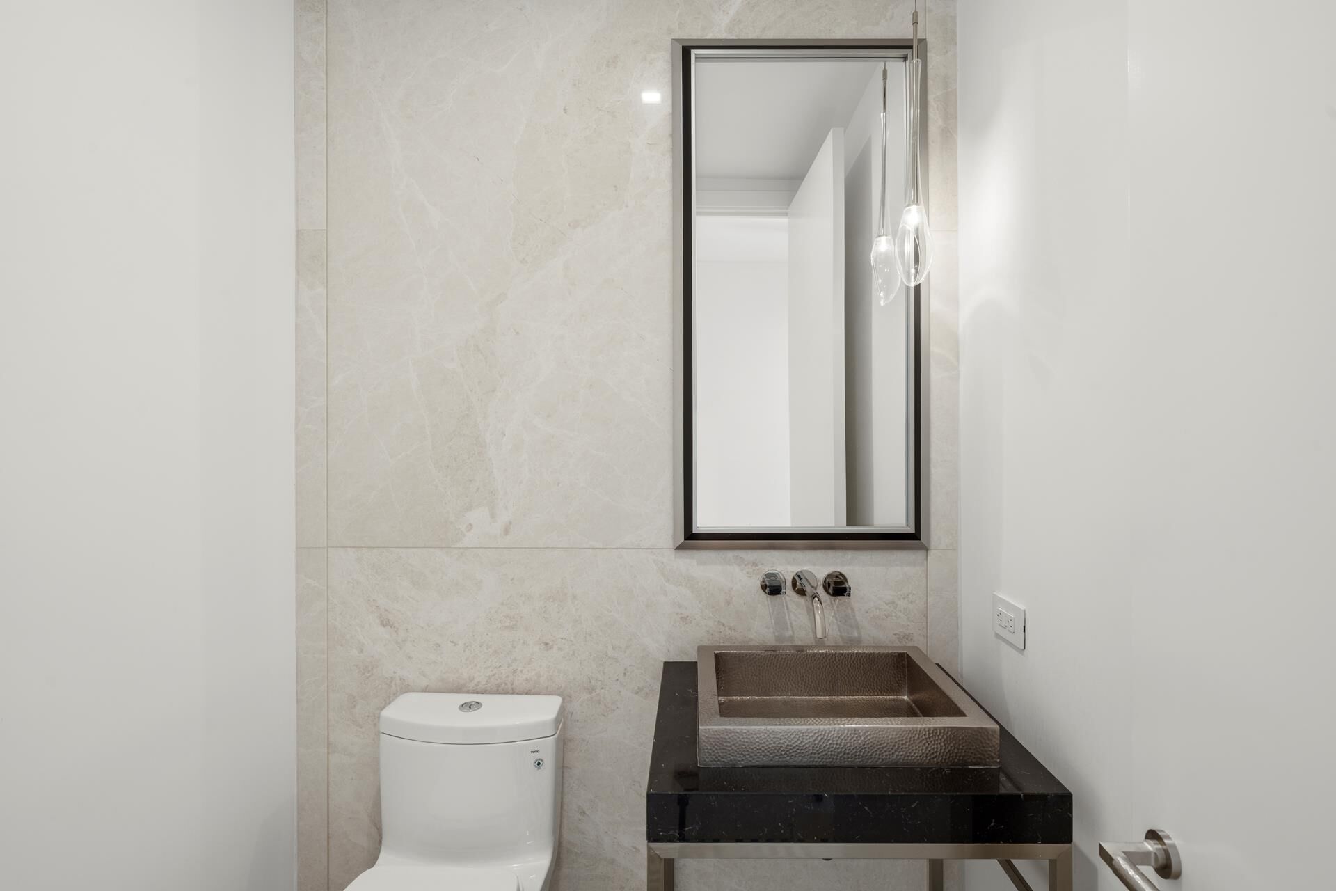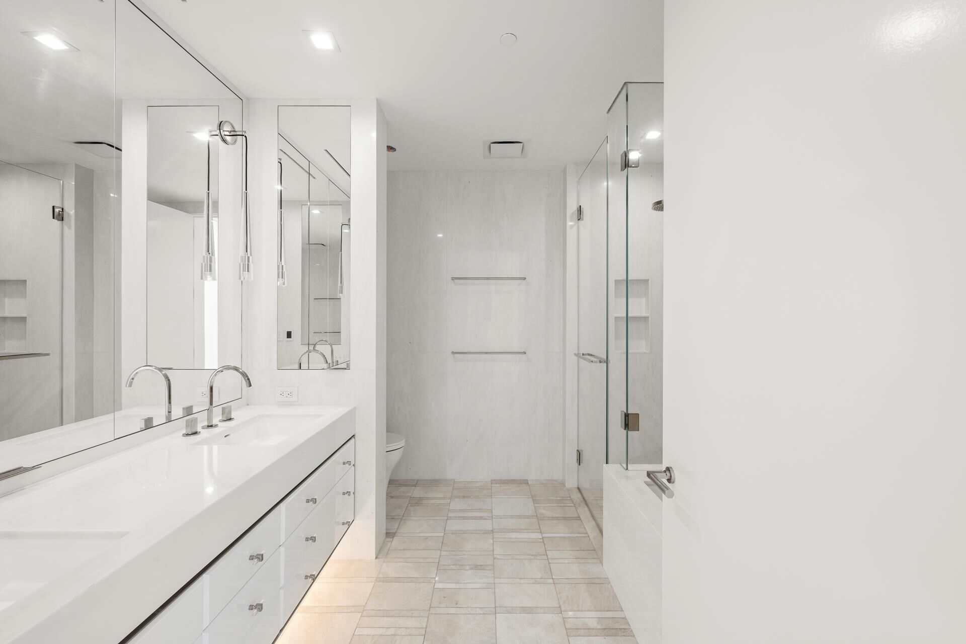 The primary suite is a serene haven with a built out walk-in closet and a spa-like bathroom featuring a Calacatta Cielo accent wall, white marble and lacquer double-sink vanity, radiant-heated Iceberg marble floors, a walk-in shower with a marble bench, and a deep soaking tub. Polished nickel fixtures by Fantini, Jonathan Browning sconces, and recessed niches elevate the space.