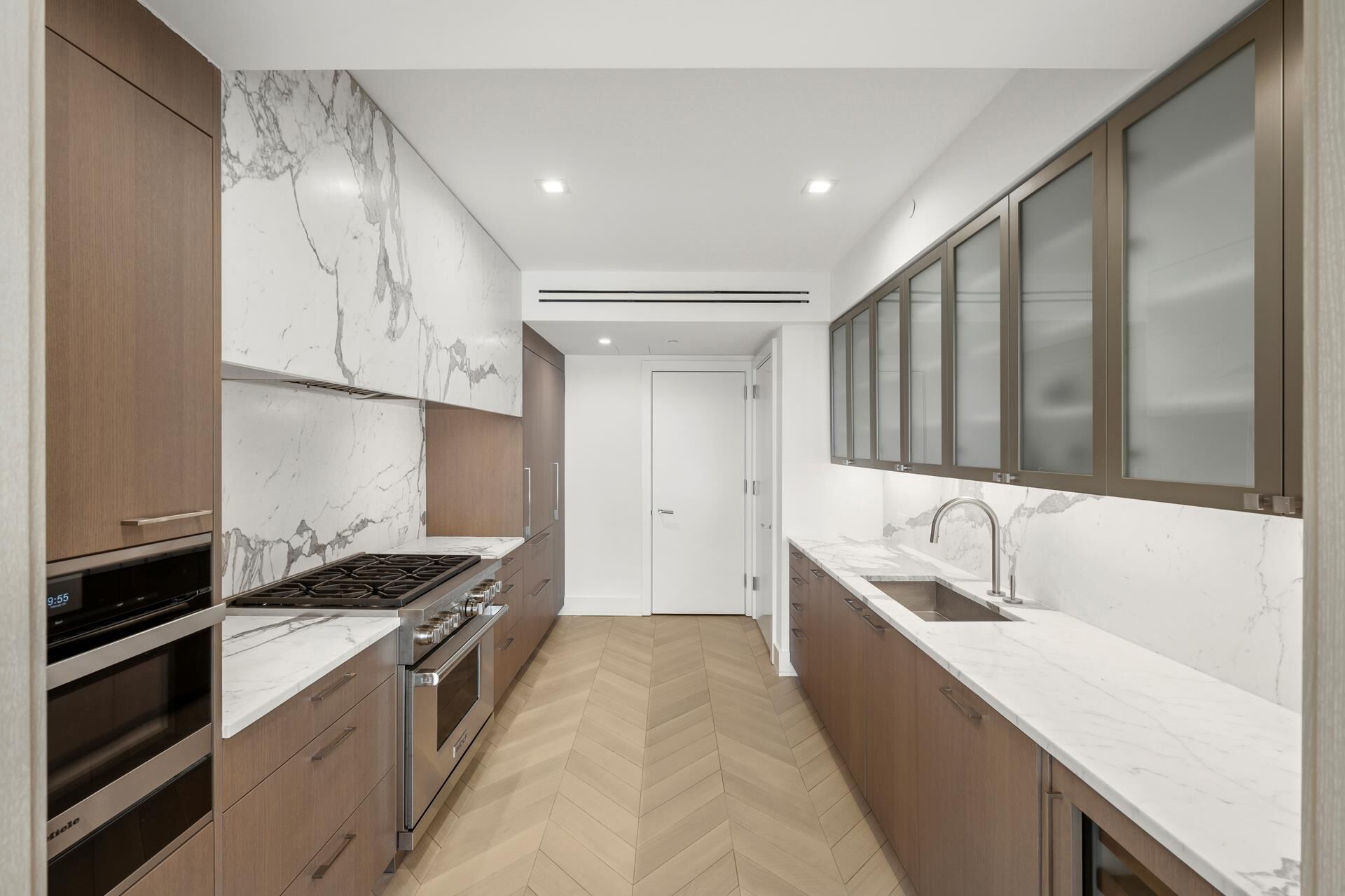 Spanning 1,812 square feet, this two-bedroom, two-and-a-half-bath home is designed for both relaxation and entertaining, with a thoughtfully laid-out split floor plan. Enter through a foyer adorned with White Ice marble flooring, leading into a spacious 15" 31'2 living and dining area. Here, 10-foot ceilings, custom French White Oak chevron floors, and floor-to-ceiling east-facing windows create a bright, sophisticated ambiance. The 9'10 17'9 kitchen is a sleek masterpiece, boasting ample storage, nickel-accented slab countertops, and top-tier appliances: a Sub-Zero refrigerator, freezer, and wine chiller, a 36 Wolf Dual Fuel Range, and a Miele speed oven, warming drawer, and dishwasher. A chic marble slab over the range cleverly hides an externally vented hood.