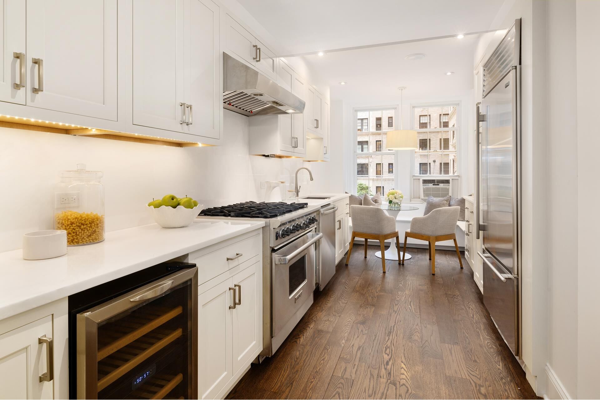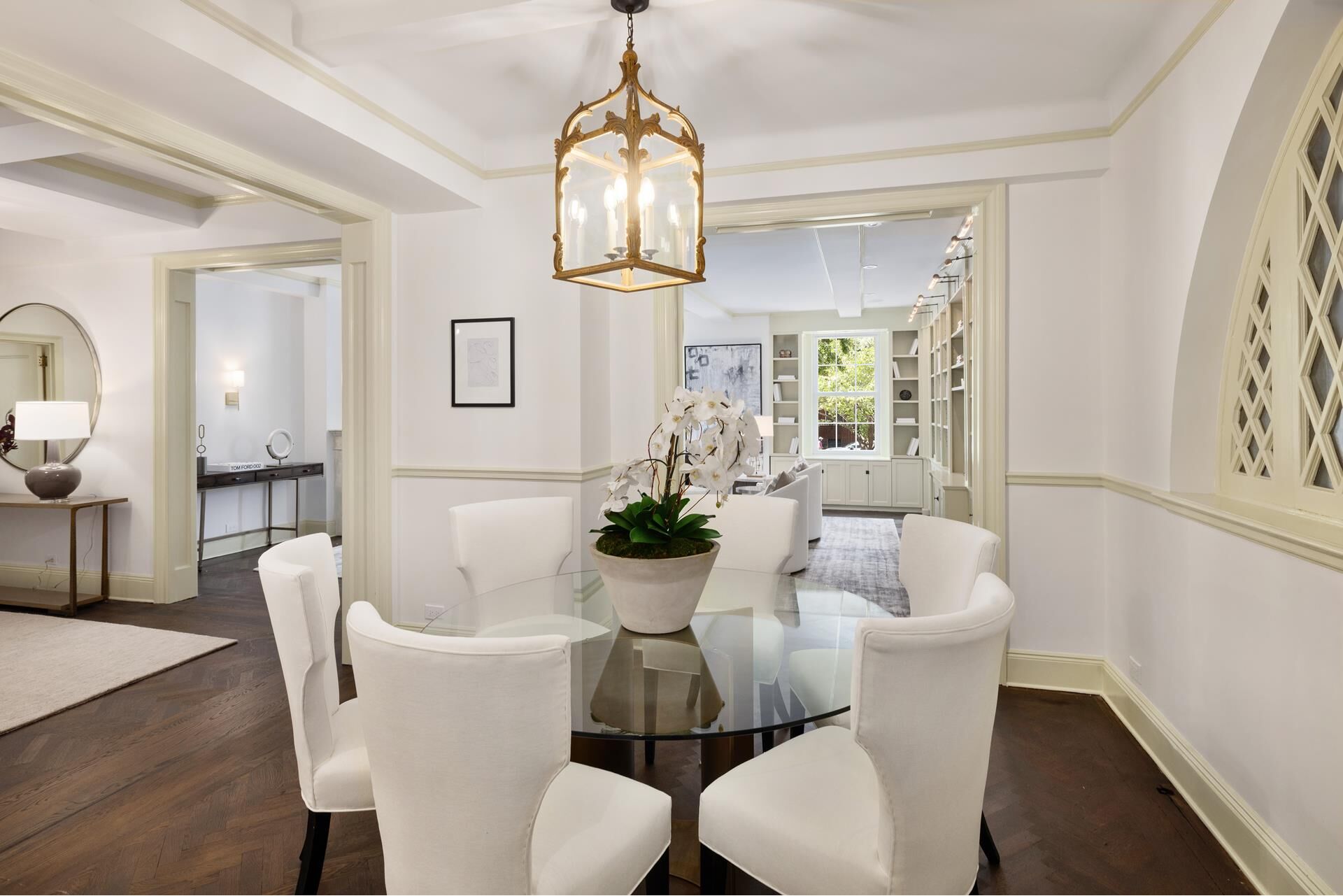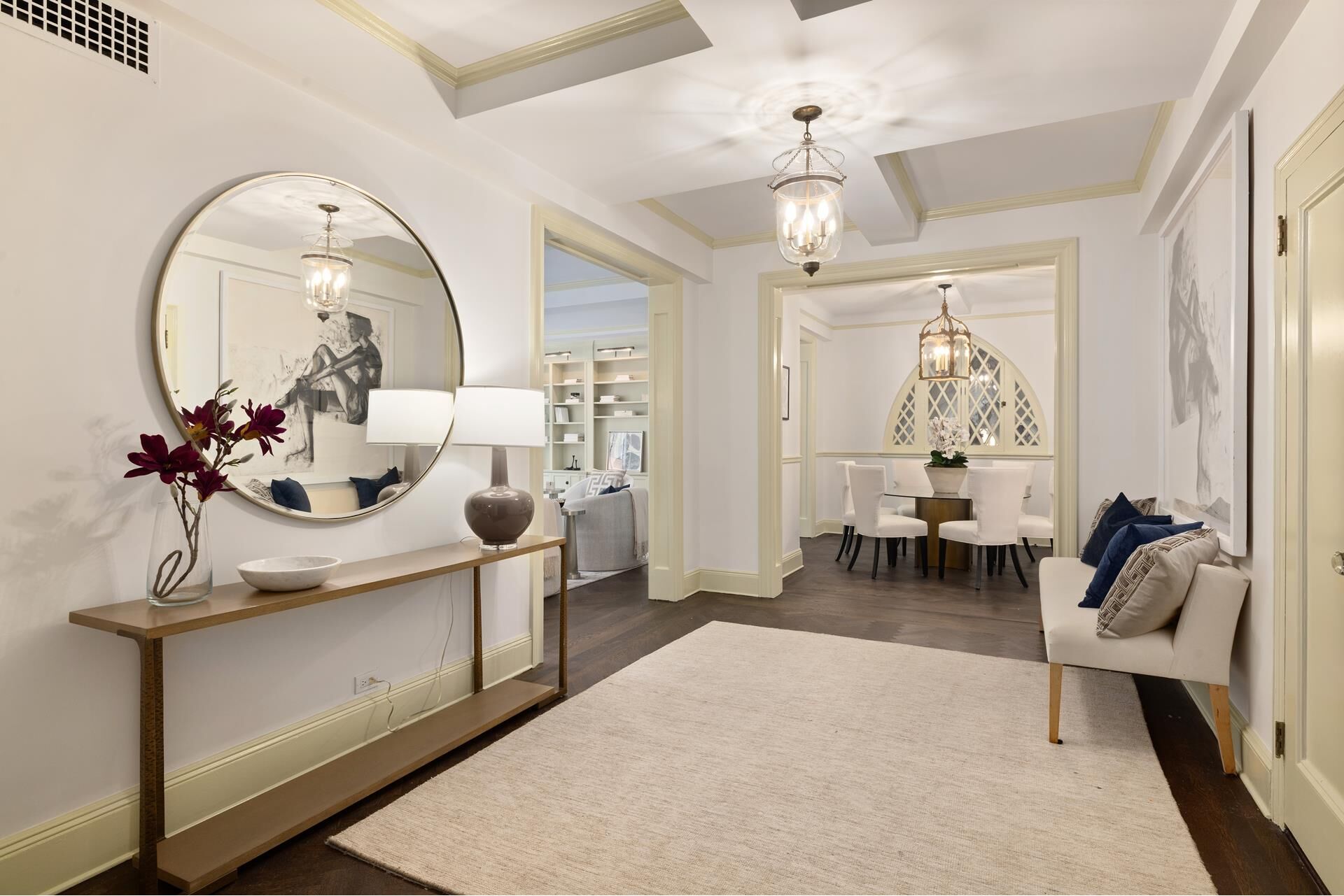 Welcome home to apartment 2C at 1185 Park Avenue, a beautiful classic 6 facing Park Avenue in excellent condition, in one of the most coveted addresses on the Upper East Side. Pre-war charm is immediately felt when you step inside the large entrance gallery that features beamed ceilings and detailed crown moldings. Off the gallery is the enormous living room which has gorgeous west-facing views overlooking Park Avenue and boasts custom built in storage. The dining room is complete with a unique arched window that overlooks the building's entryway. In the adjacent garden-facing windowed kitchen you'll find ample cabinet space, a banquette with additional storage, as well as high end appliances including a SubZero Fridge, Miele Dishwasher, Danby Wine Fridge and a Wolf Range. There is a washer and dryer off to the side, and an adjoining staff room which is complete with an en-suite bathroom and also faces the building's garden.