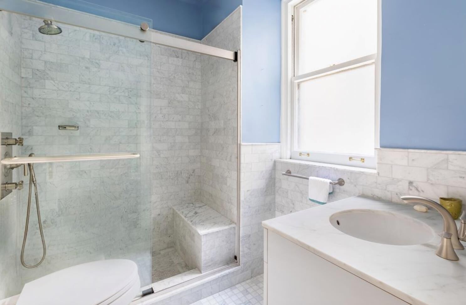 The bedroom wing is quietly tucked away from the main living spaces, offering exceptional privacy. Both bedrooms are impressively scaled and boast en-suite renovated baths with walk in showers. It's rare to find two bedrooms of such equal size, both with generous closet space.