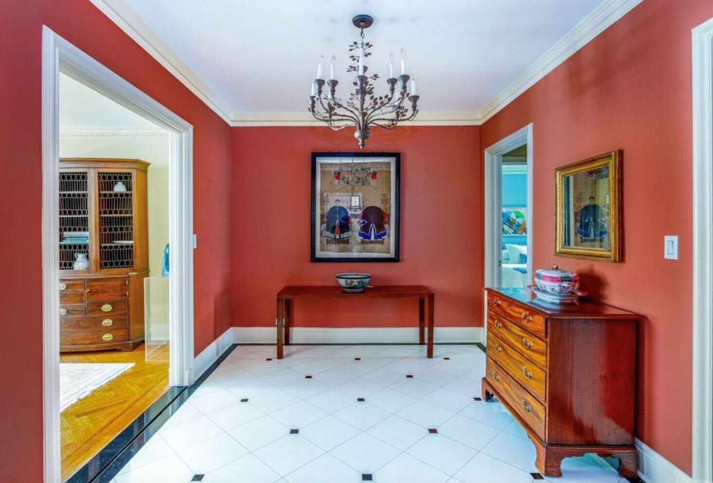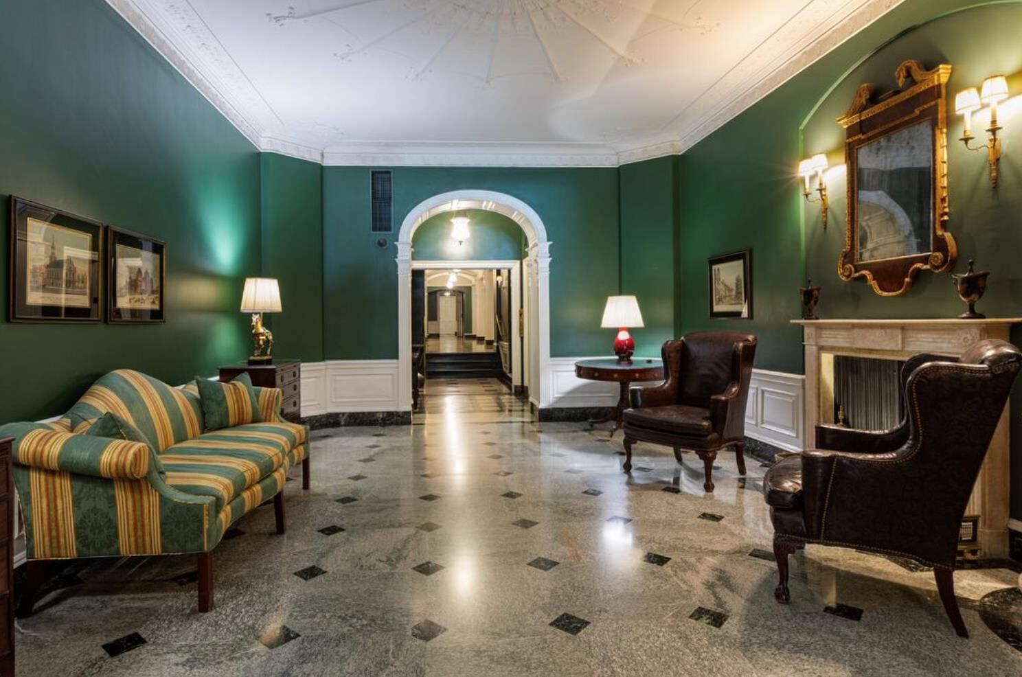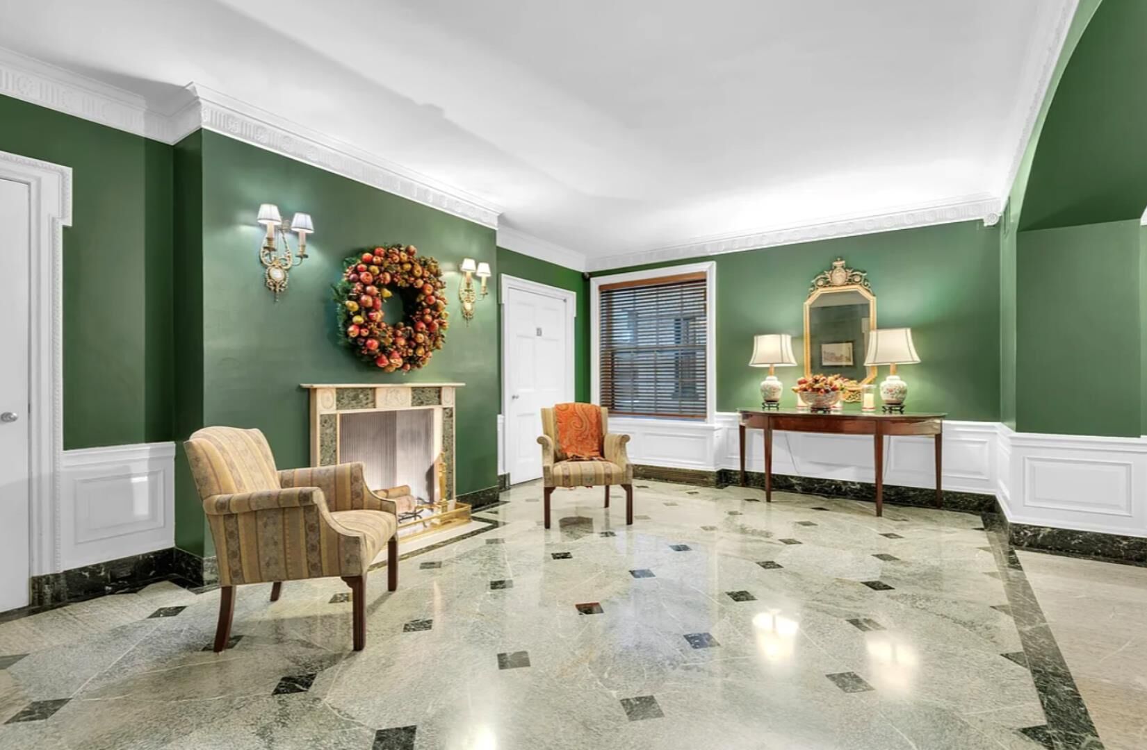 A gracious entry foyer opens into a grand marble-floored gallery, which effortlessly doubles as a formal dining space or an impressive art-lined hallway. From here, step into the sun-drenched south-facing living room, featuring classic herringbone hardwood floors, two oversized windows, and a charming decorative fireplace. Measuring a generous 22'9" x 14', it's an ideal setting for both entertaining and everyday living.