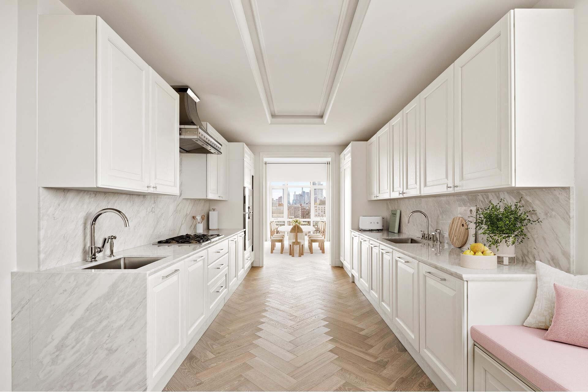 The private elevator gallery leads into a light-filled living and dining area, with dazzling Southern light. Savor the spectacular views of the city skyline from the adjacent 24-foot-long private balcony. The kitchen is a chef's dream, equipped with top-of-the-line Gaggenau appliances, sleek Scavolini cabinetry, and Waterworks fixtures.