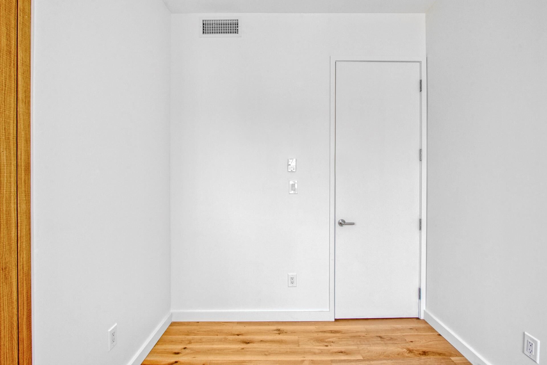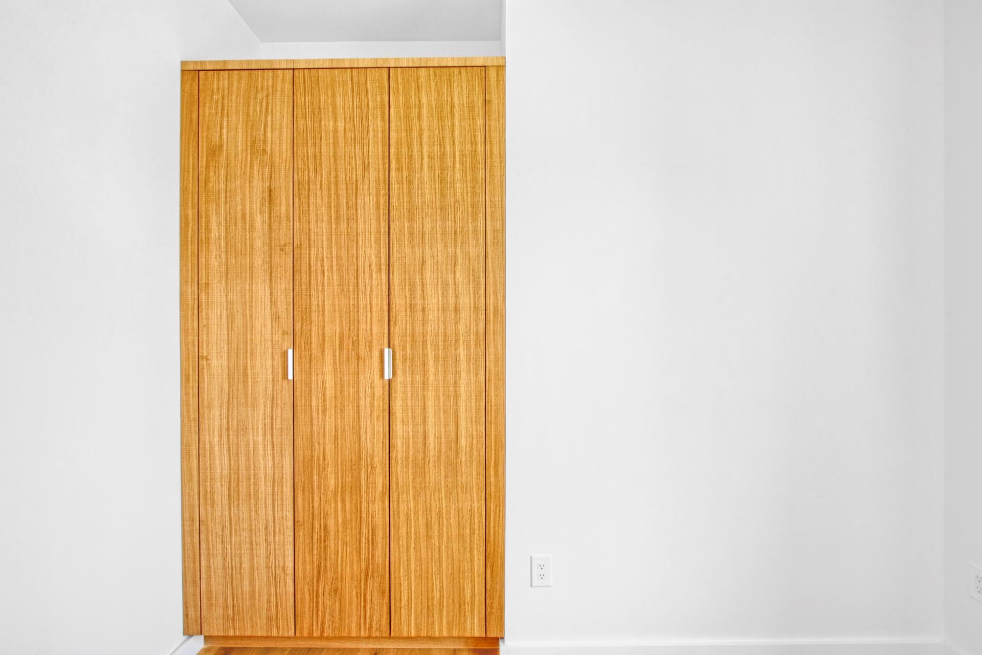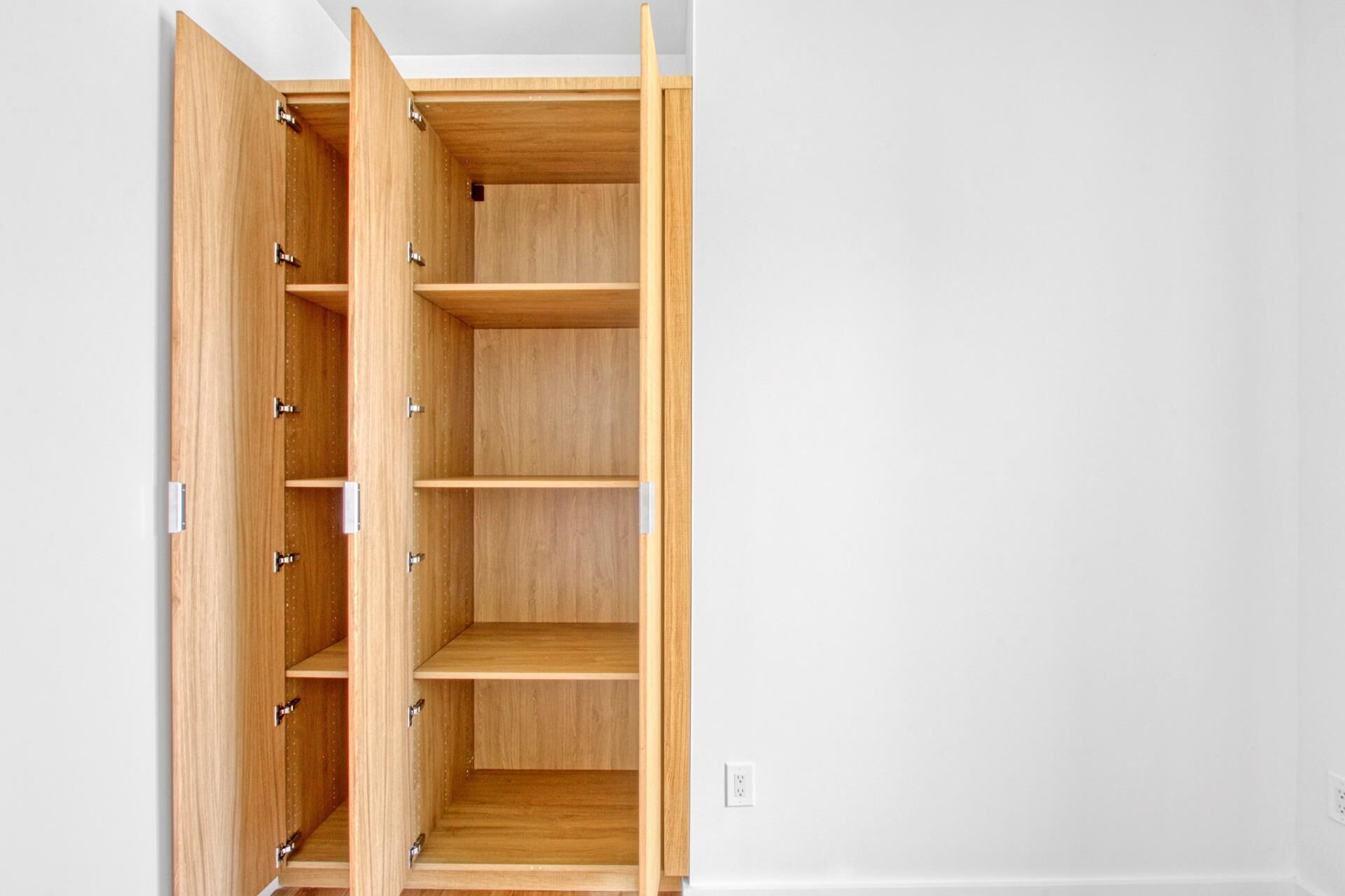 Norm Architects-designed cabinetry and shelving units in sawn-cut veneered natural oak, oversized casement windows, high ceilings and Eko European white oak hardwood floors appear throughout all apartments. Kitchens include a Bosch dishwasher, Bosch refrigerator, Fisher & Paykel oven and electric stove top, and a vented Fisher & Paykel above stove microwave, all installed in handsome Dekton countertops. Bathrooms are spa-quality and finished with opulent tilework, modern fixtures and vanities. For privacy and security, each residence is provided with a video intercom.