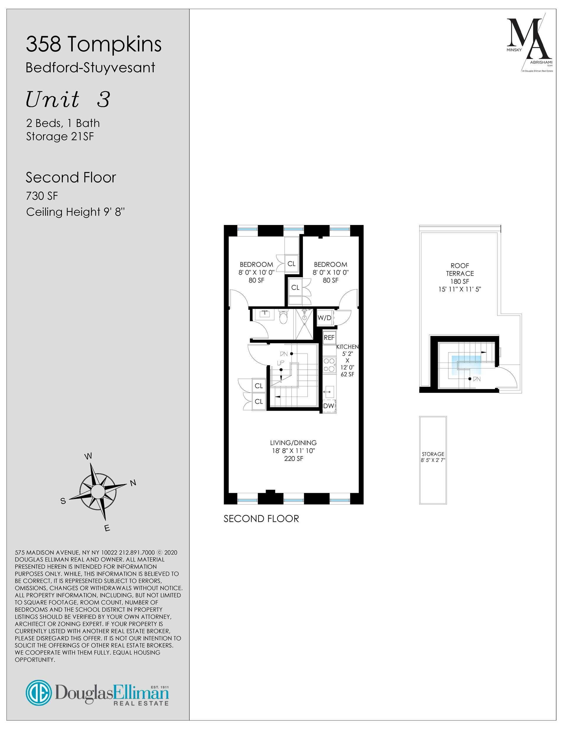 Unit Three is laid out around the central stairwell in an ingenious U-shaped plan that permits maximum peace and privacy for this 730 sq. ft. 2-bedroom/1-bath. The entry gives way to a light-flooded dual living/dining space served by a galley-style kitchen outfitted perfectly for an ambitious gourmet to produce any desired menu for family or entertaining. Two ample bedrooms overlook the garden fa ade and offer views of surrounding landmarks. A spa-quality full bath is joined by laundry and storage space while a private stair leads to the dramatic 180 sq. ft. rooftop space with amazing views of brownstone Brooklyn and the Manhattan skyline. Bosch in-unit laundry and customized storage; ducted central LG heating and cooling. Common charges are $480.31; taxes are $180.32.